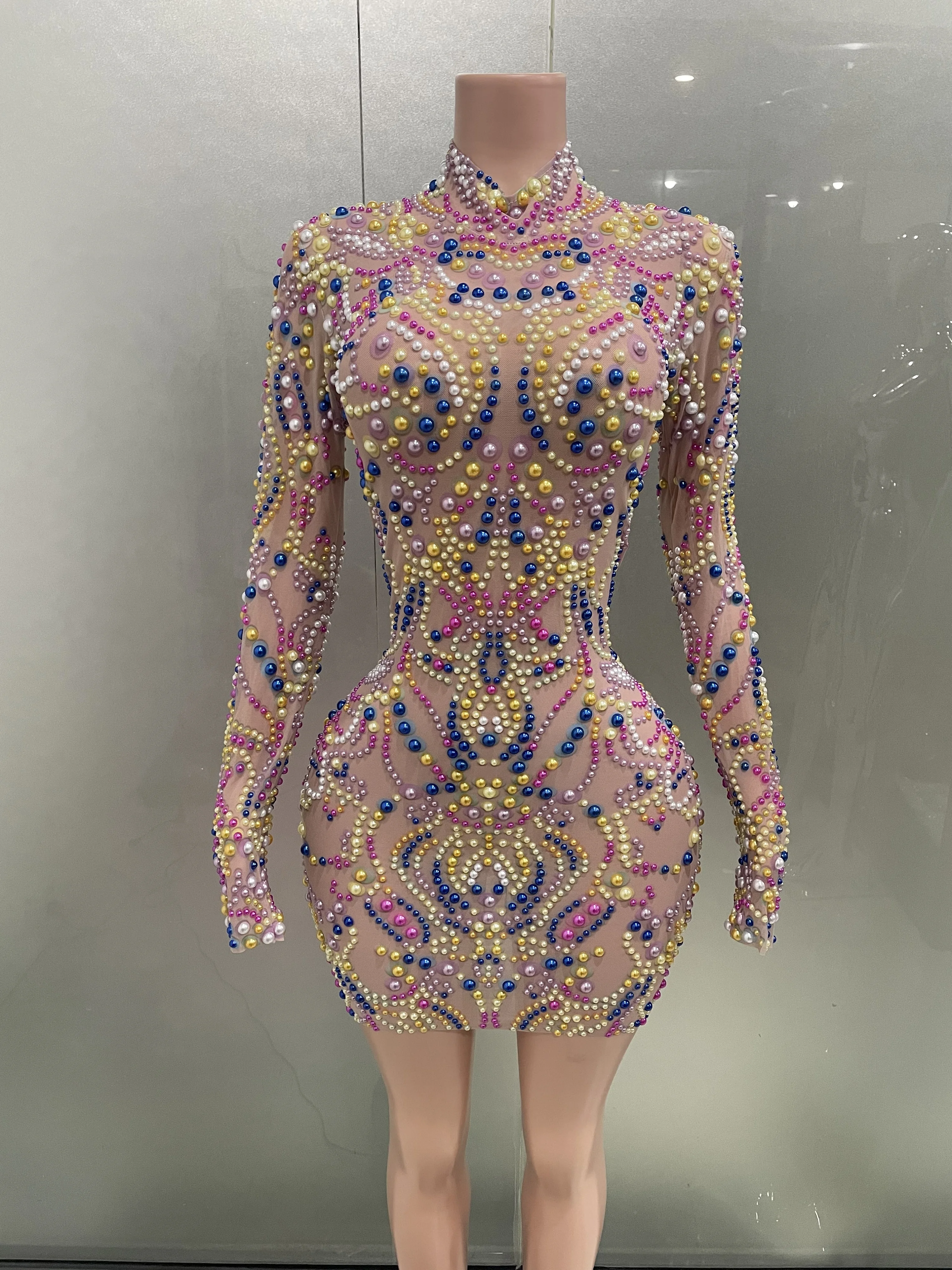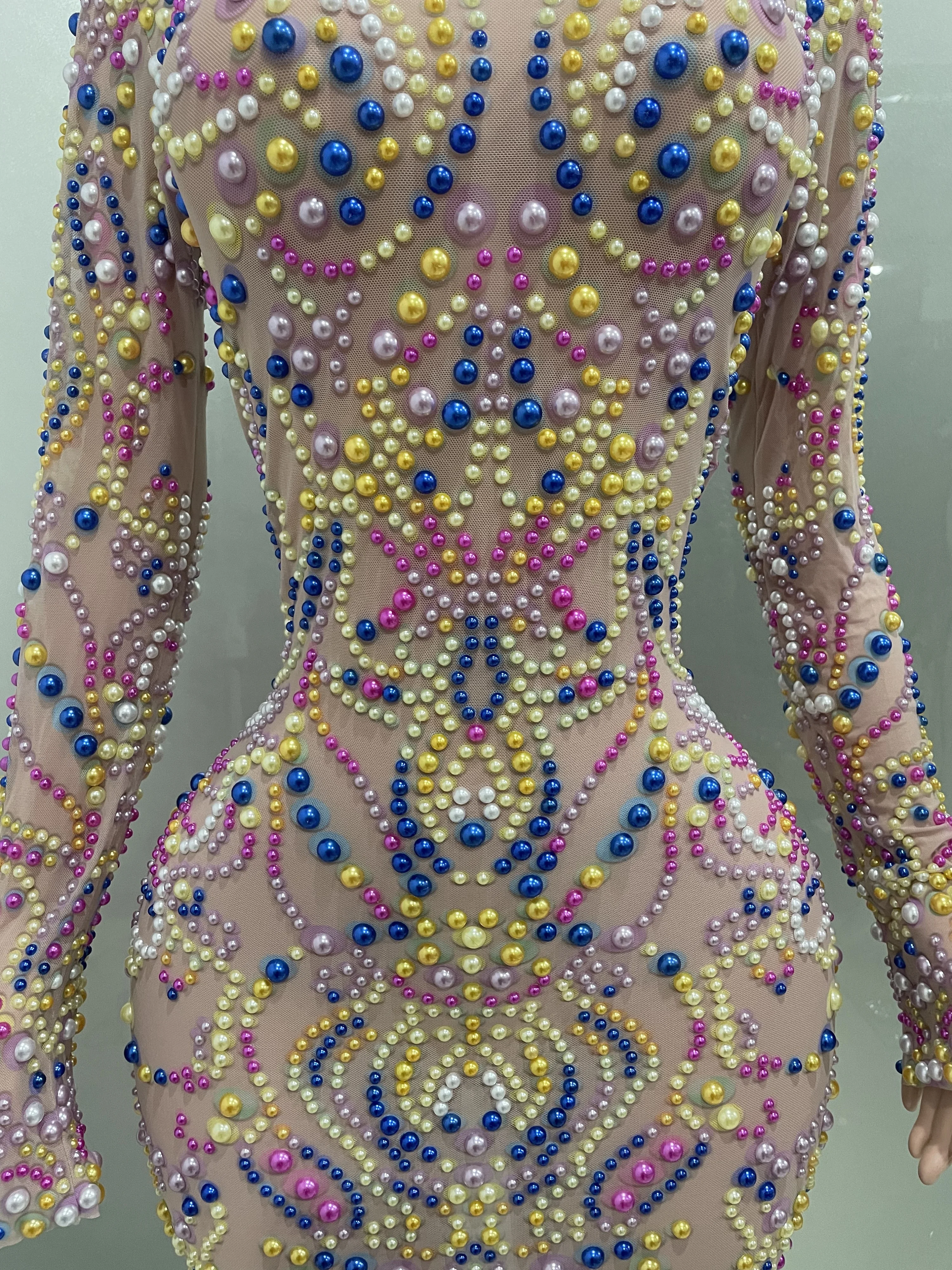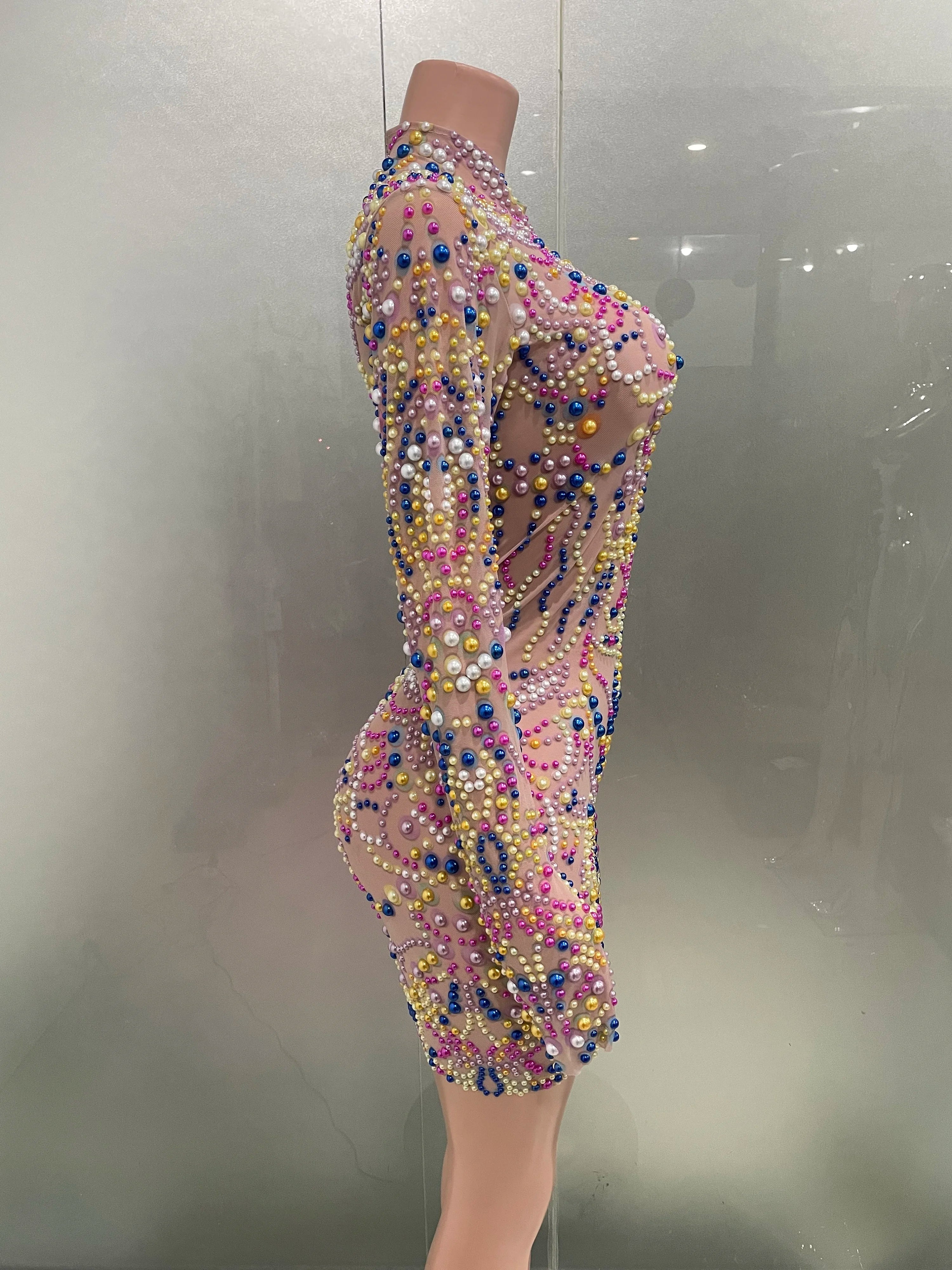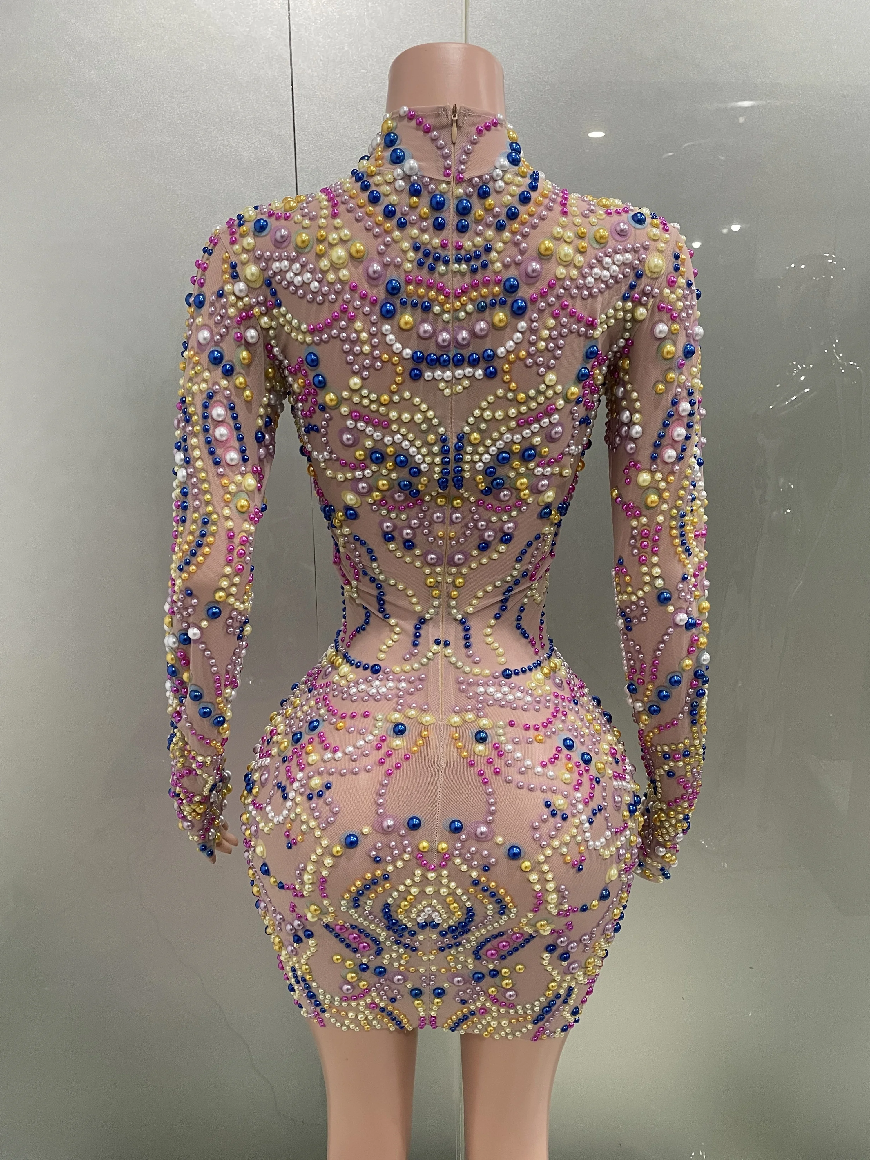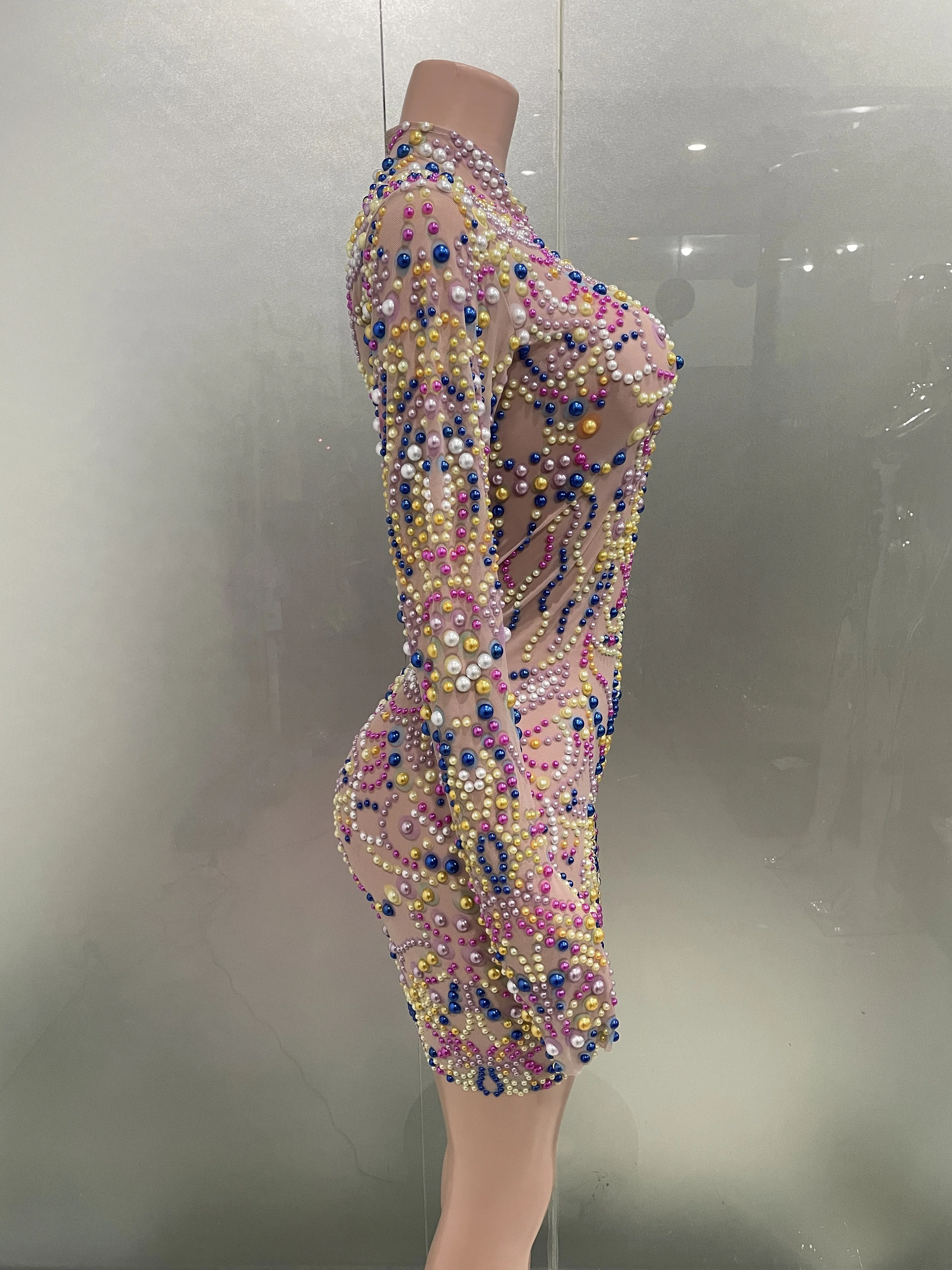 Sexy Full Colour Pearl Mesh Stretch Short Dress Women Evening Birthday Party Prom Celebrate Nightclub Stage Costume