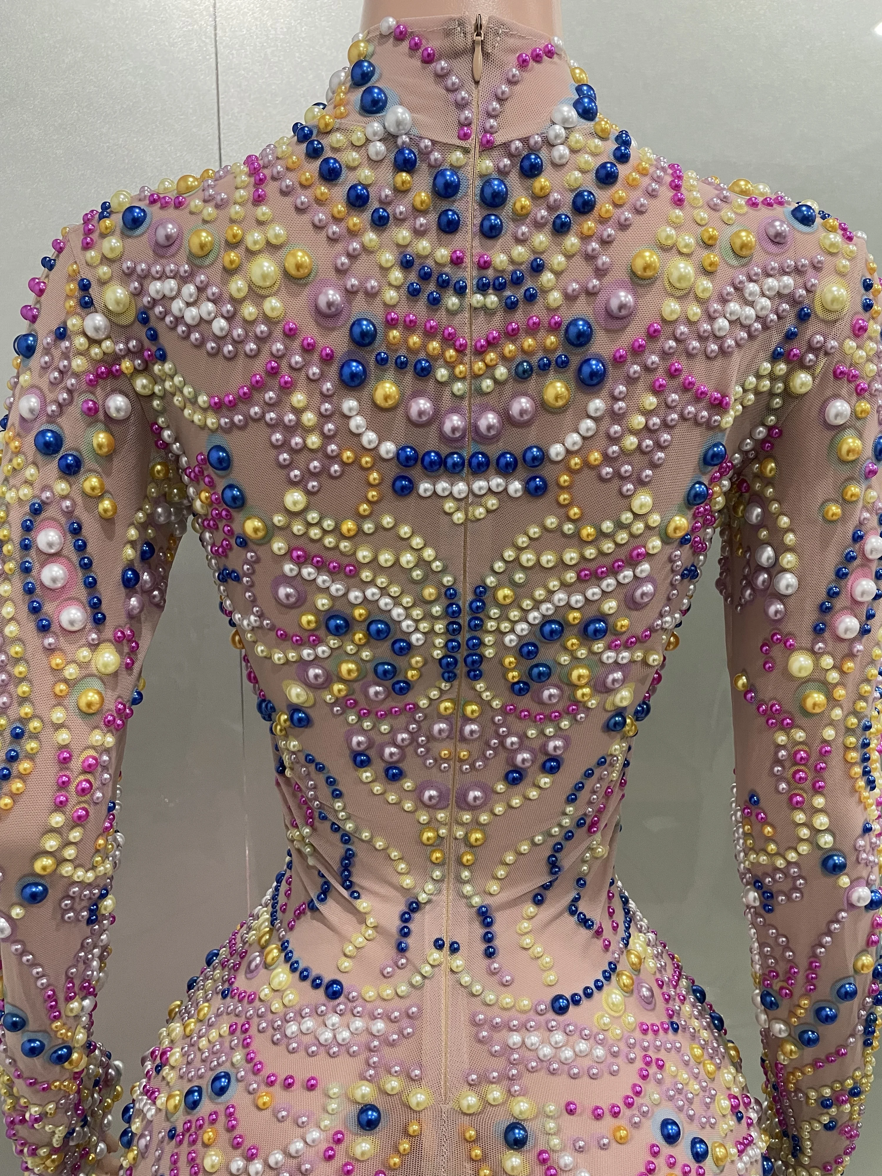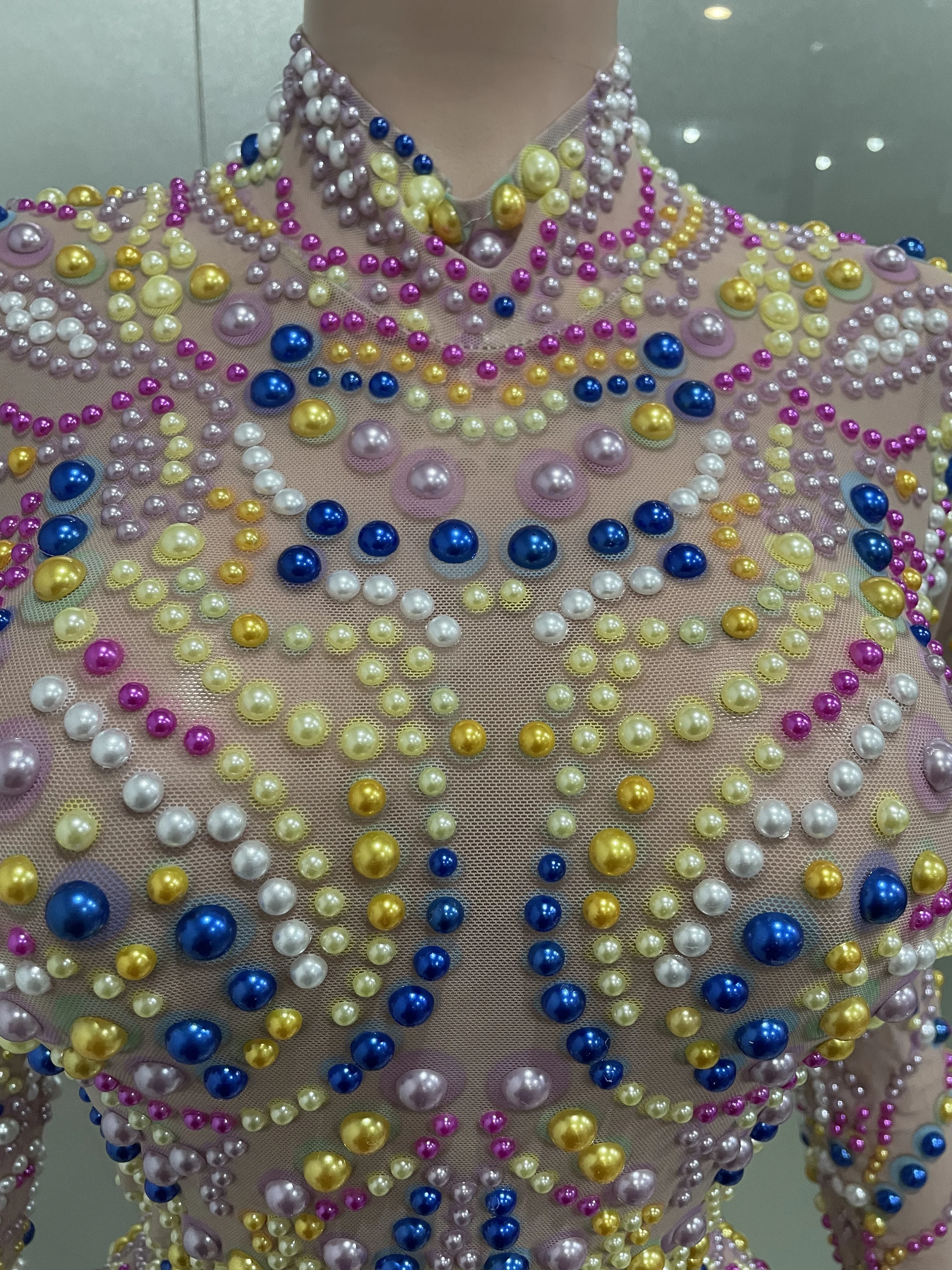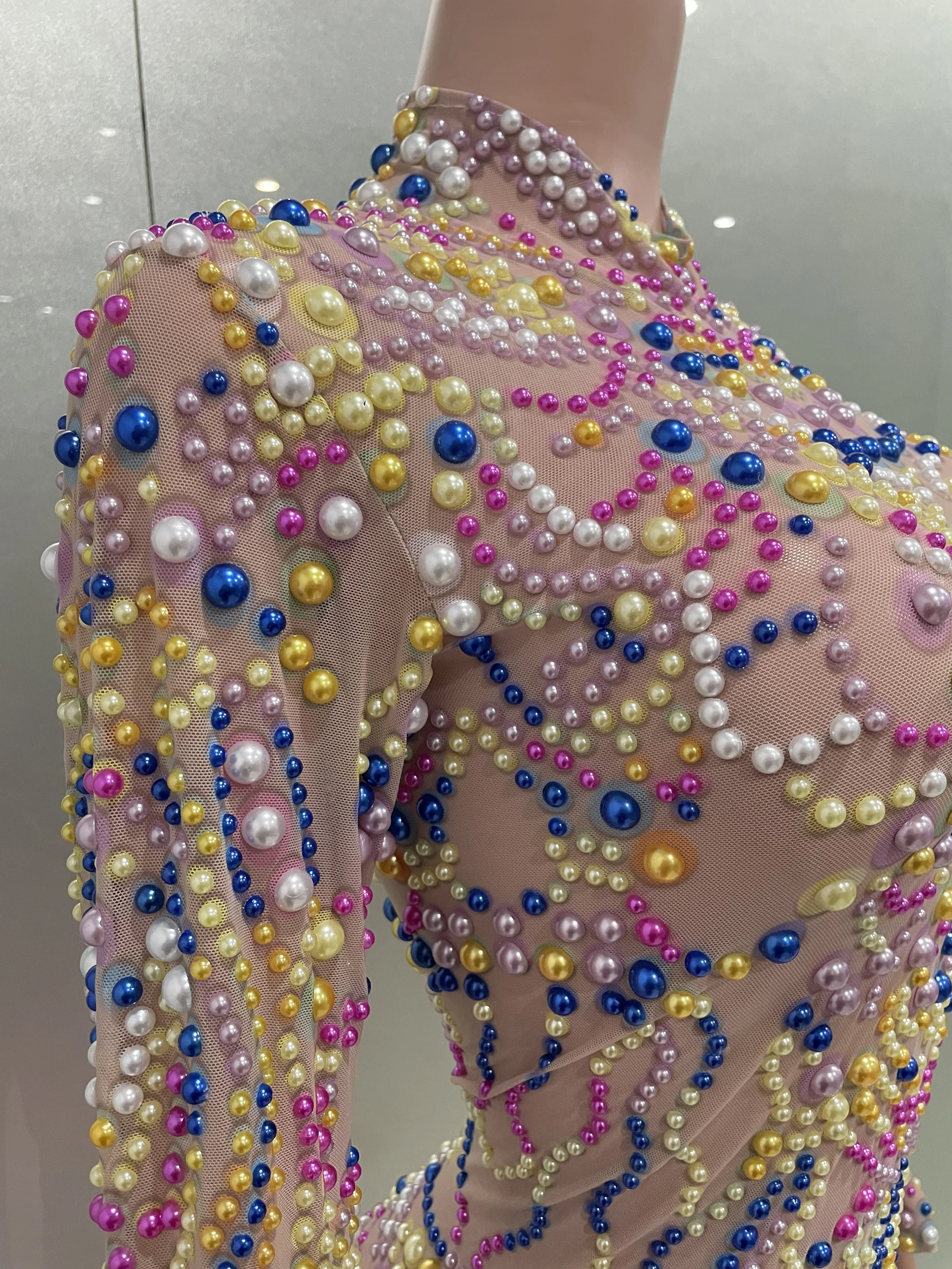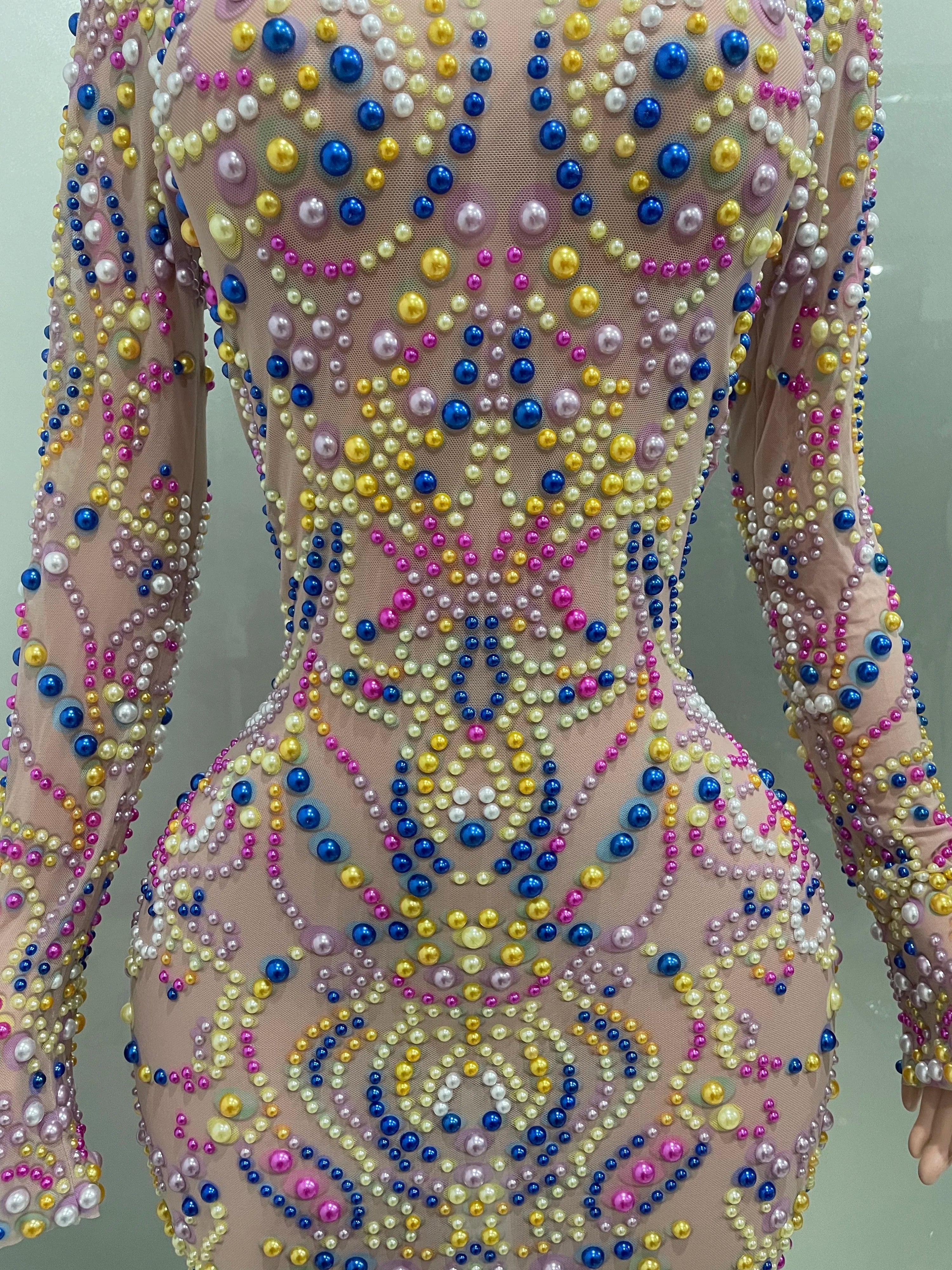Sexy Full Colour Pearl Mesh Stretch Short Dress Women Evening Birthday Party Prom Celebrate Nightclub Stage Costume