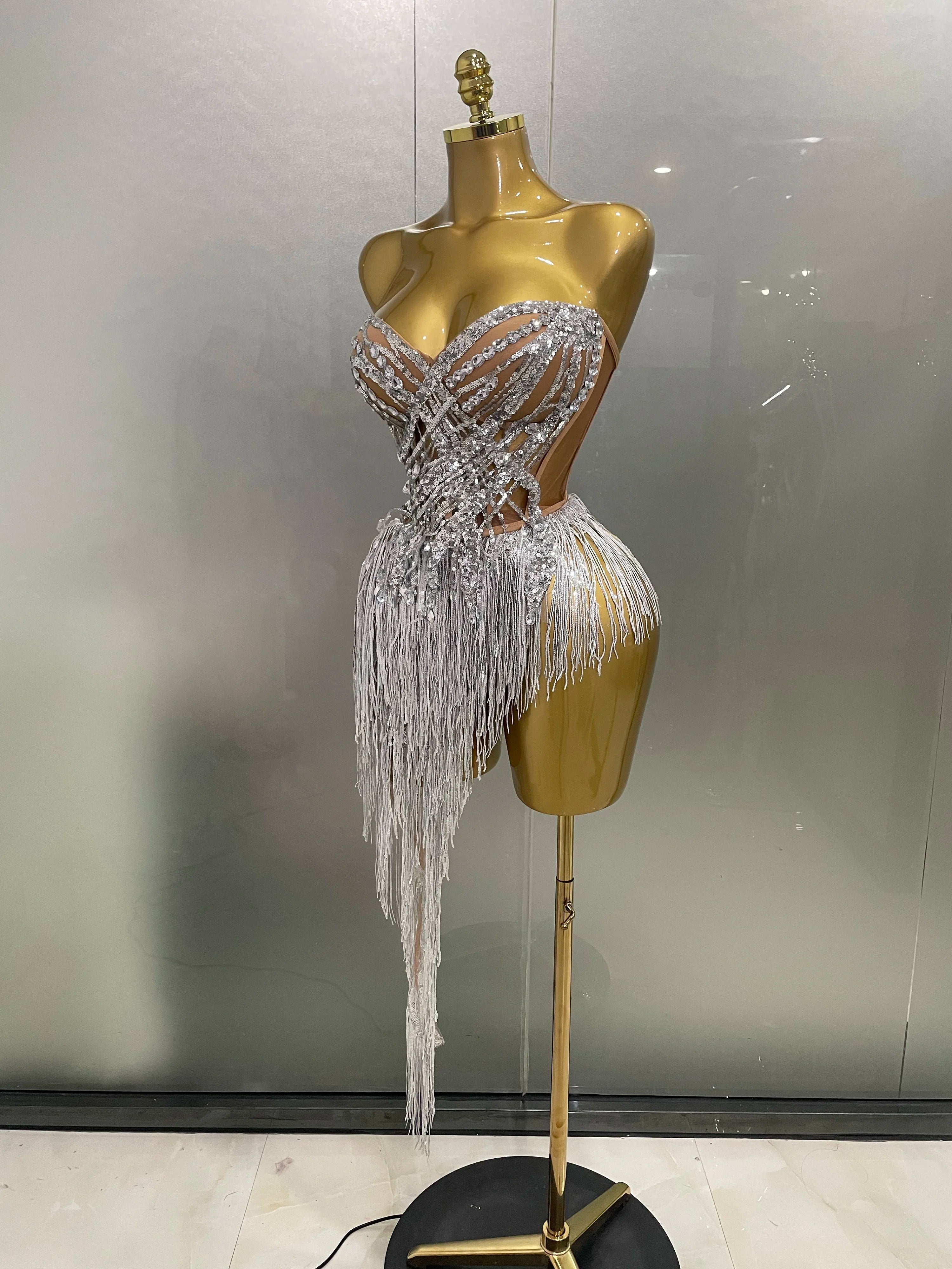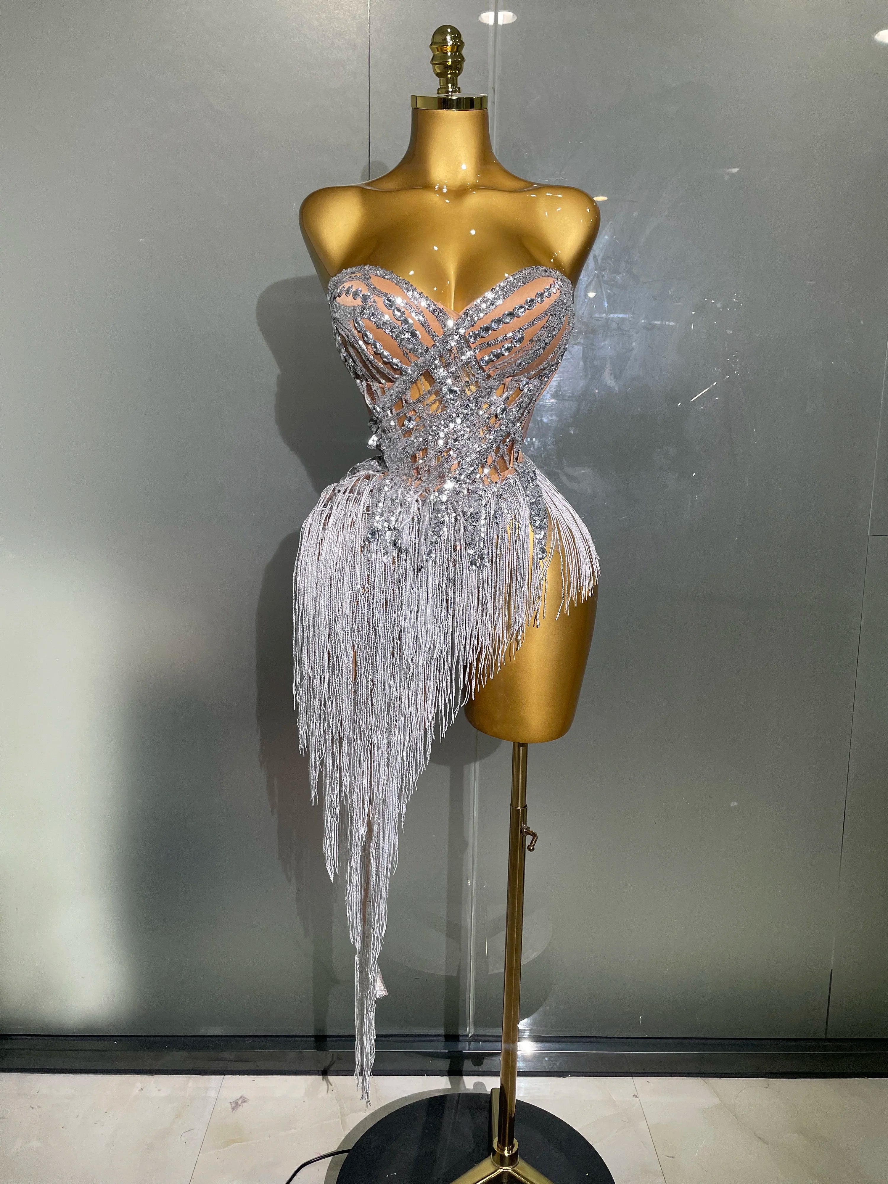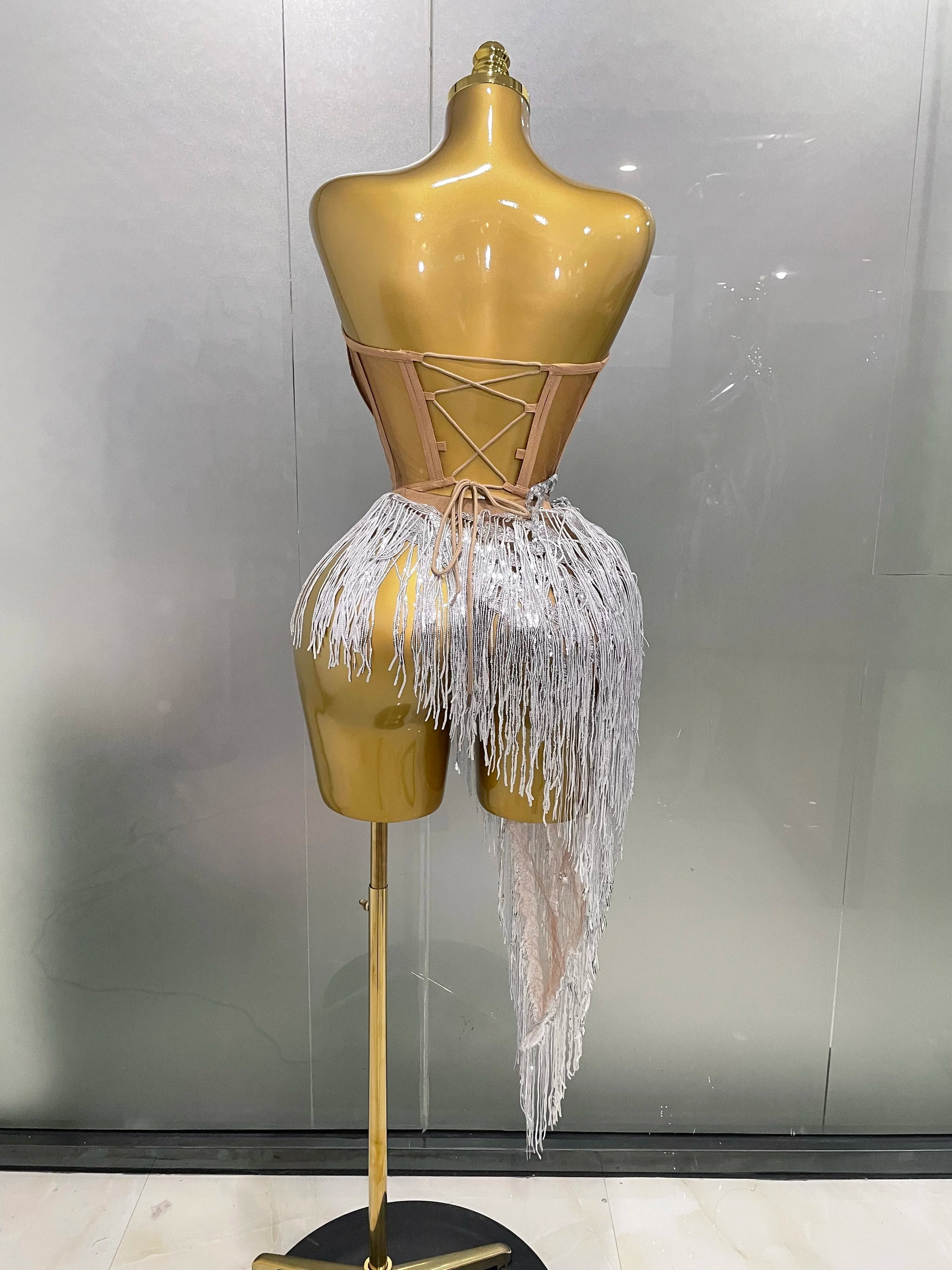New Sparkly Rhinestone Sequin Tassel Sexy Mini Skirt Two Pieces Set Women Birthday Celebrate Party Nightclub Stage Costume