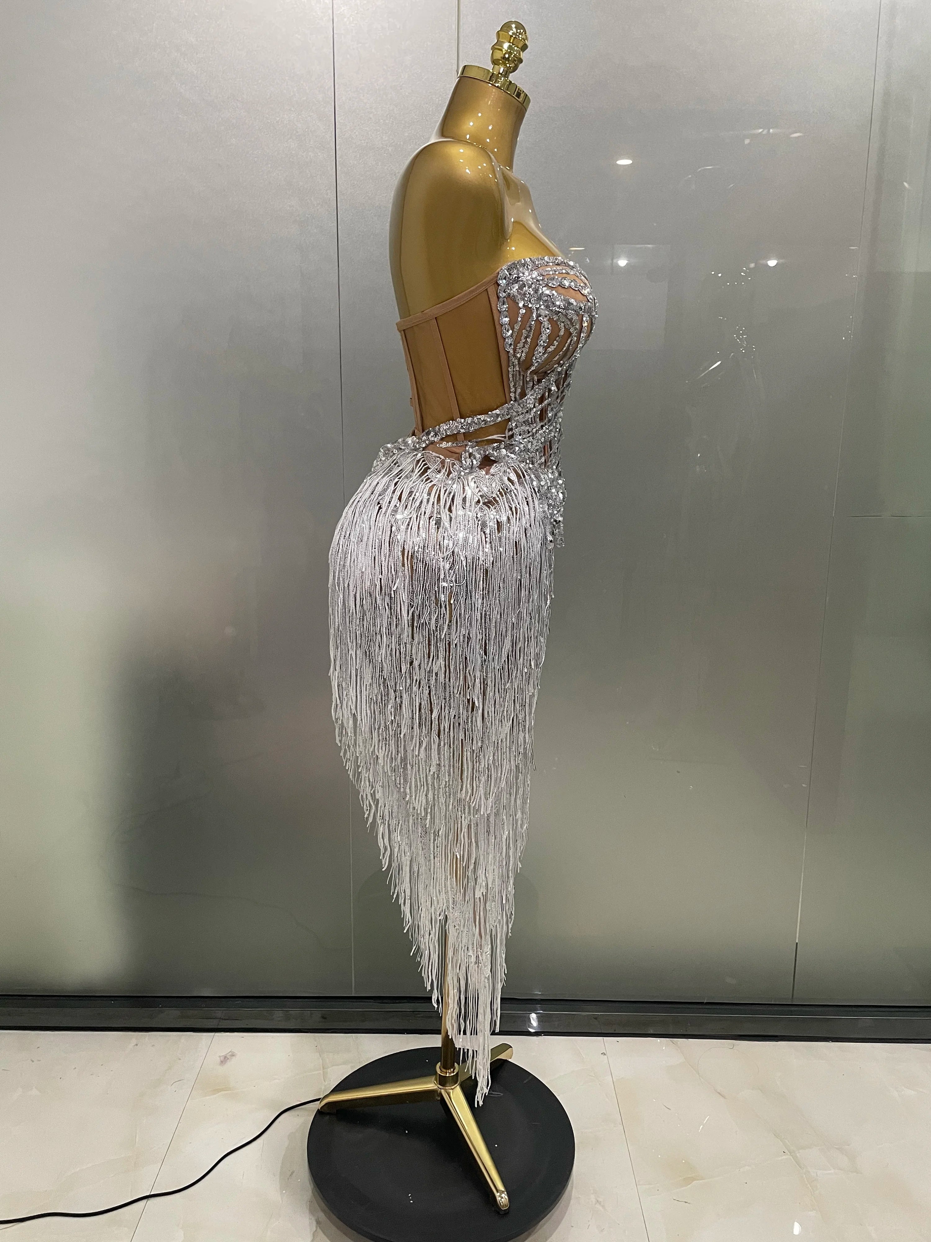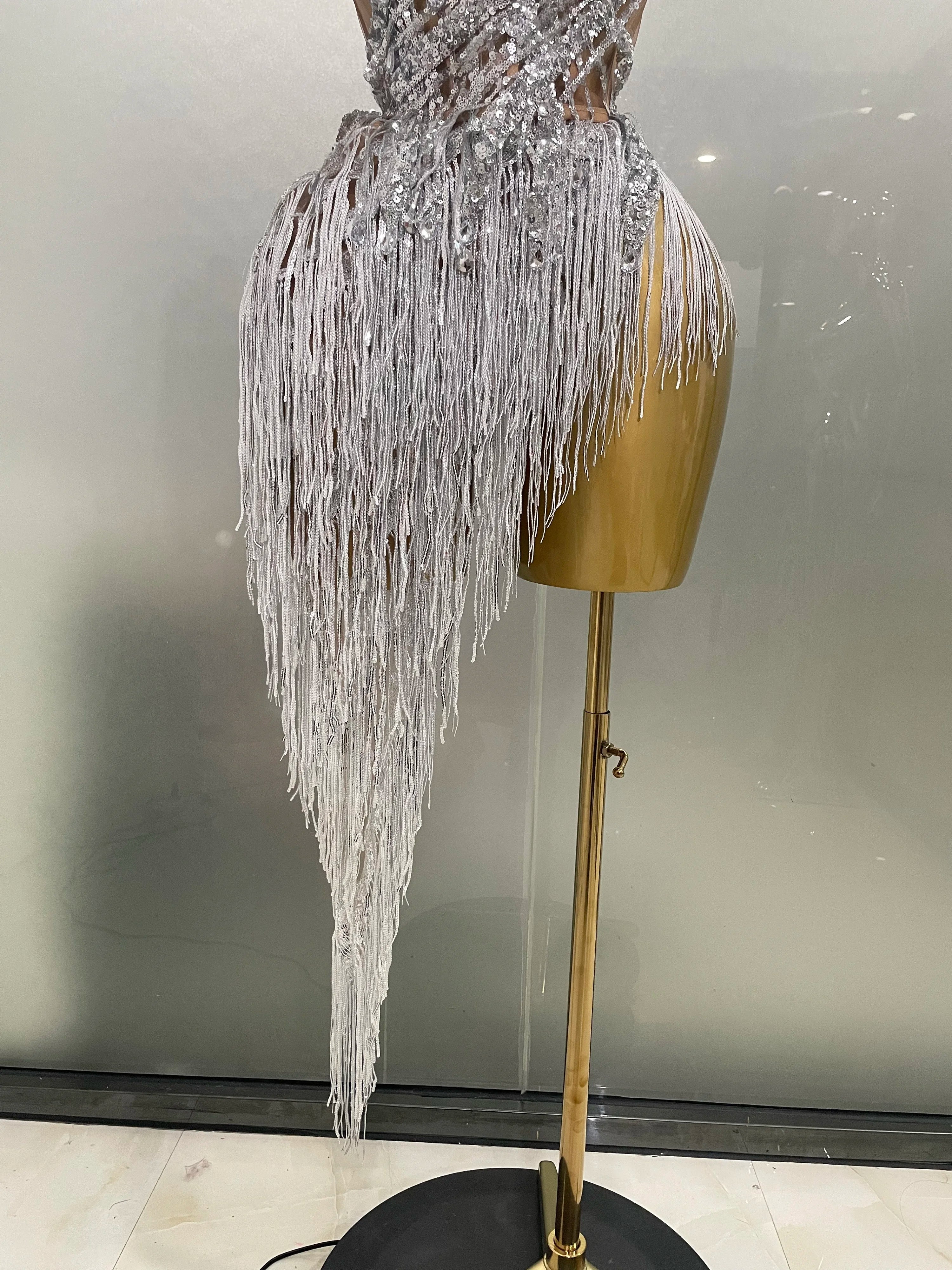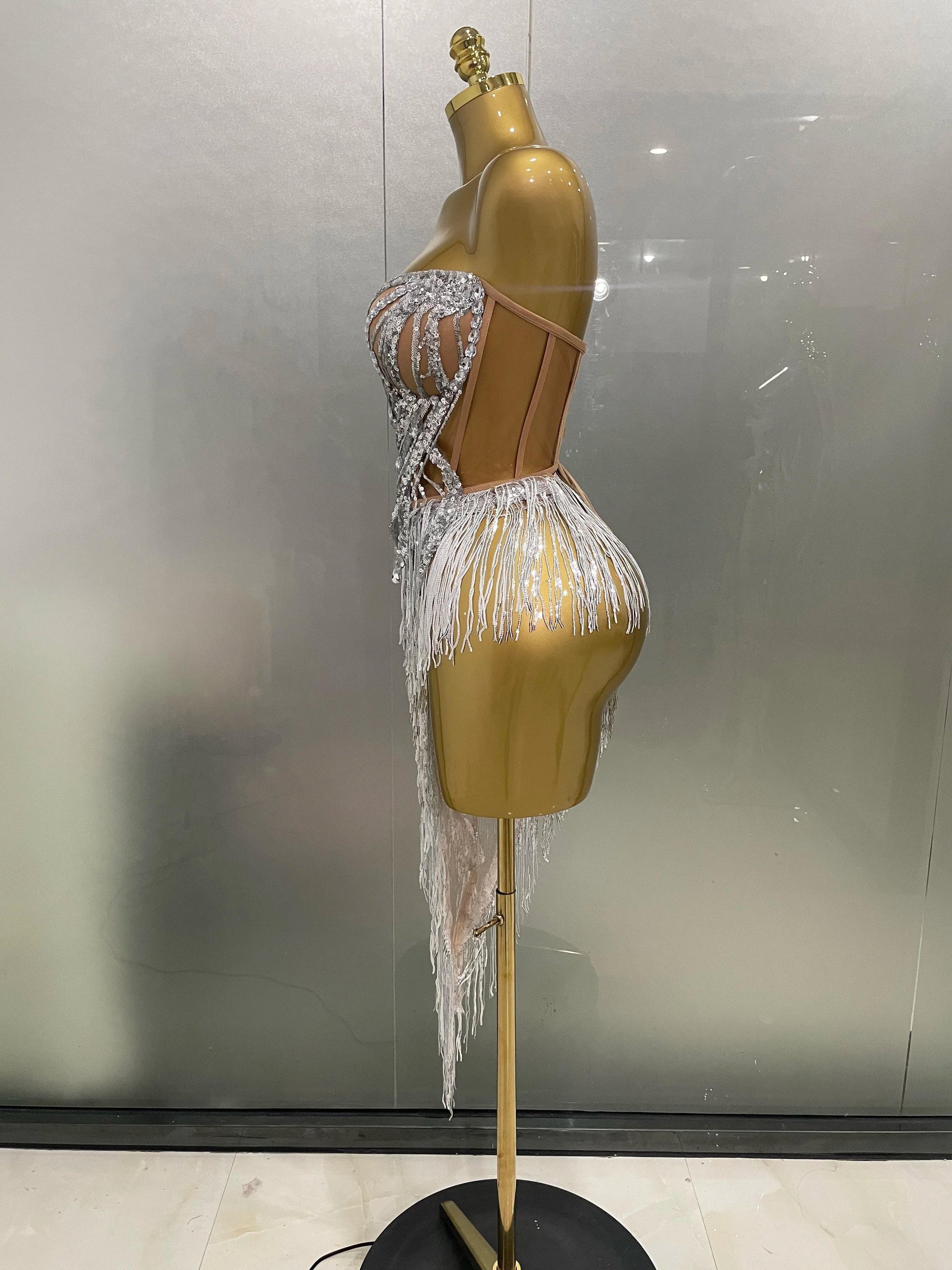 New Sparkly Rhinestone Sequin Tassel Sexy Mini Skirt Two Pieces Set Women Birthday Celebrate Party Nightclub Stage Costume