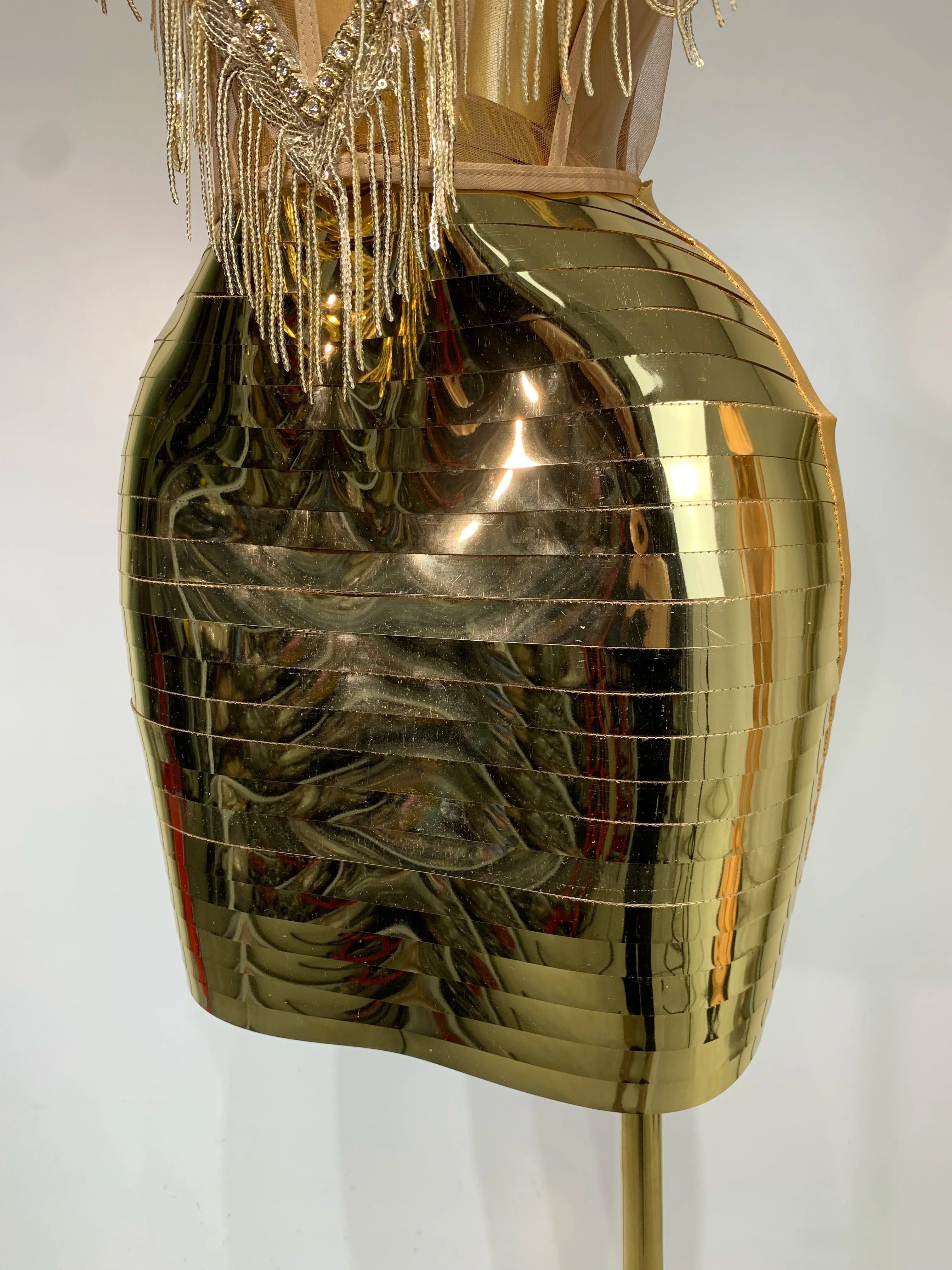Shine bright in this stunning Sparkly Gold Rhinestones Tassels Top and Skirt Set. Designed for the bold and fashionable woman, this sexy strapless two-piece outfit features dazzling rhinestone embellishments and playful tassels that catch the light beautifully. Perfect for nightclubs, evening parties, or stage performances, this designer ensemble exudes confidence and glamour. Make a statement and own the spotlight in this eye-catching outfit that showcases your unique style!