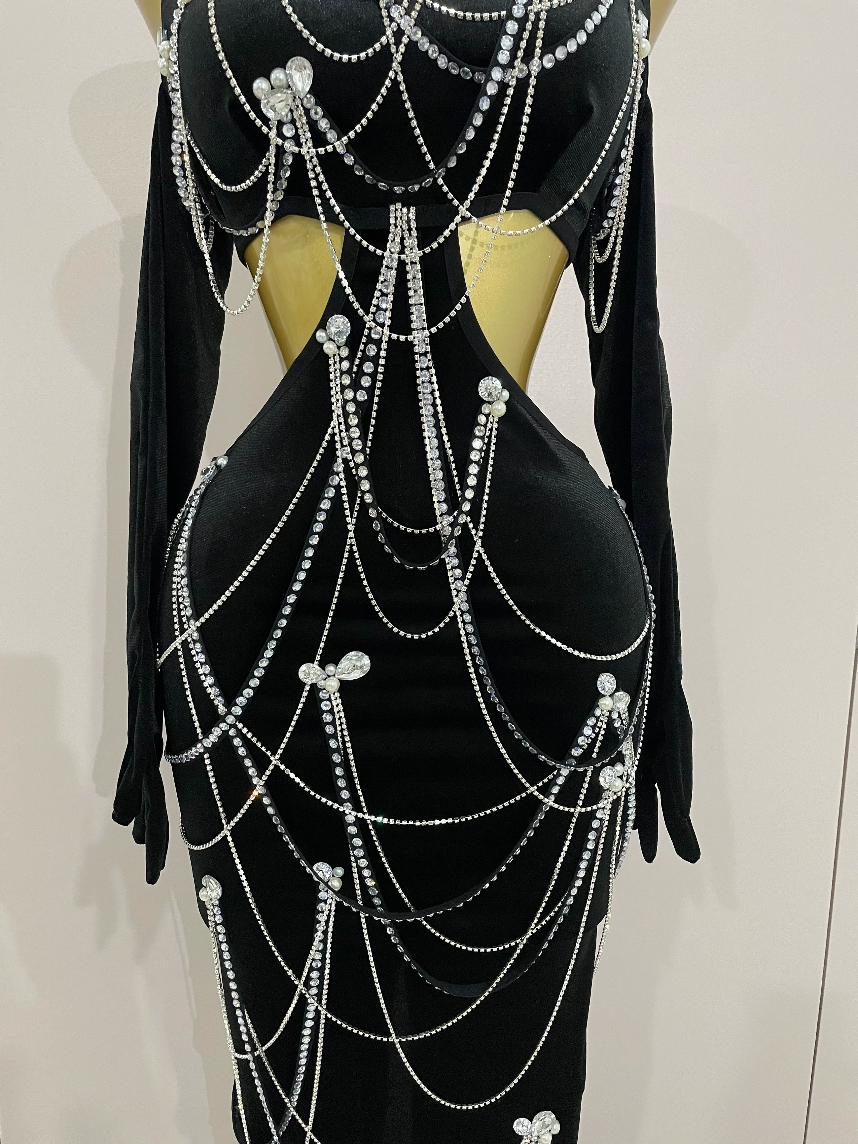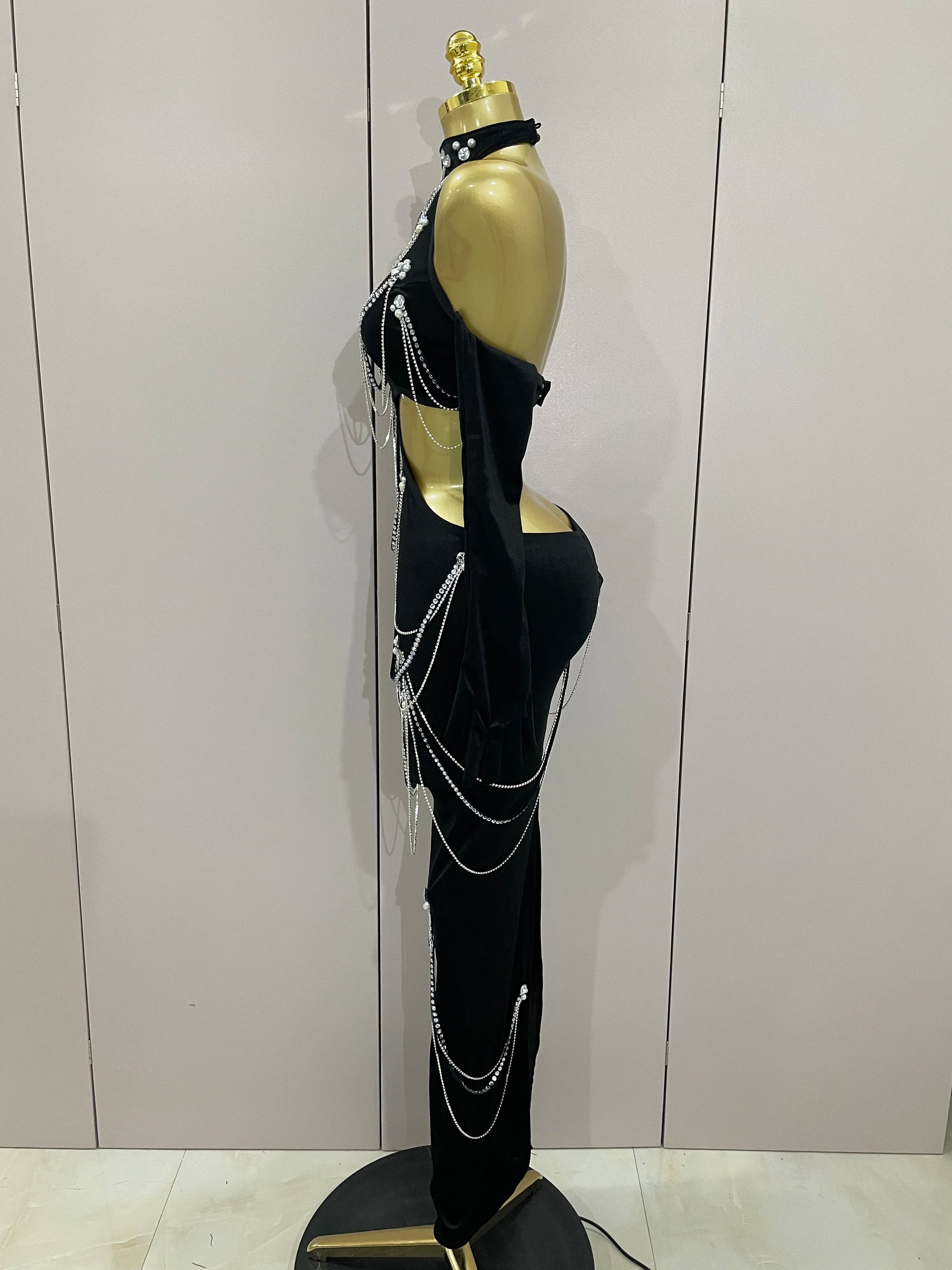 Women Sparkly Diamonds Tassels Chain Balck Sexy Halter Backless Long Dress Evening Birthday Party Celebrate Stage Costume