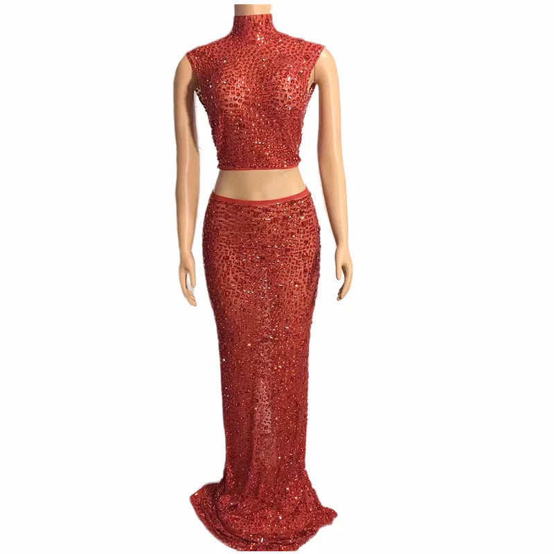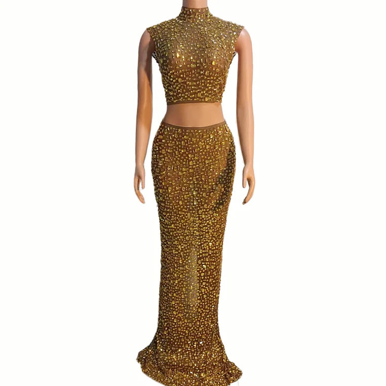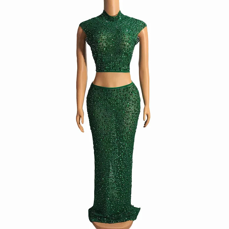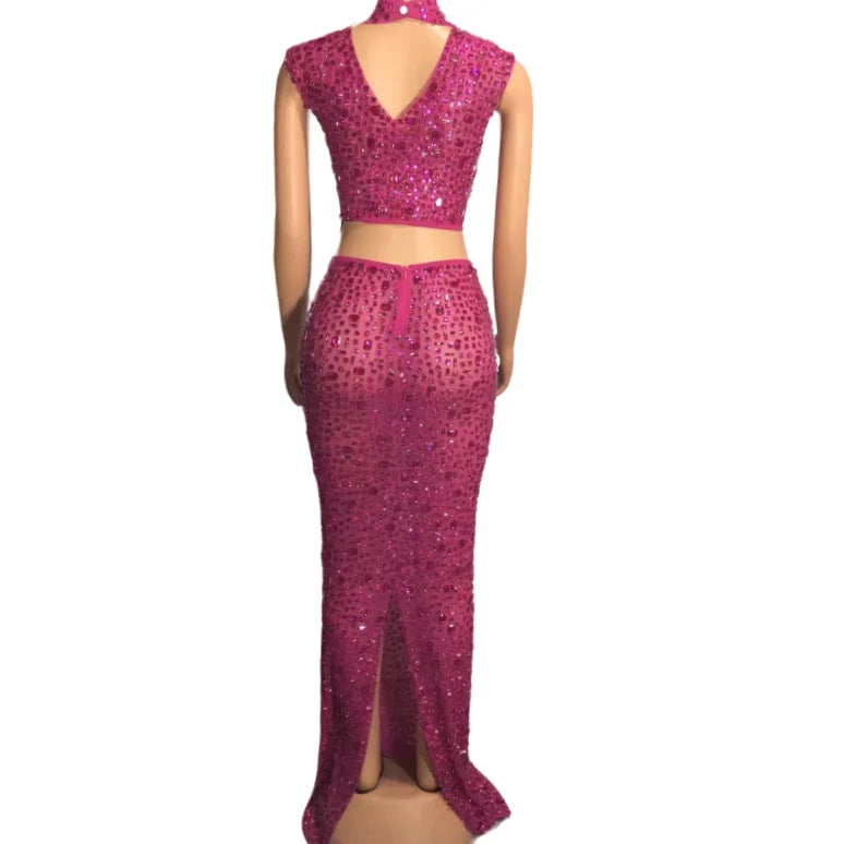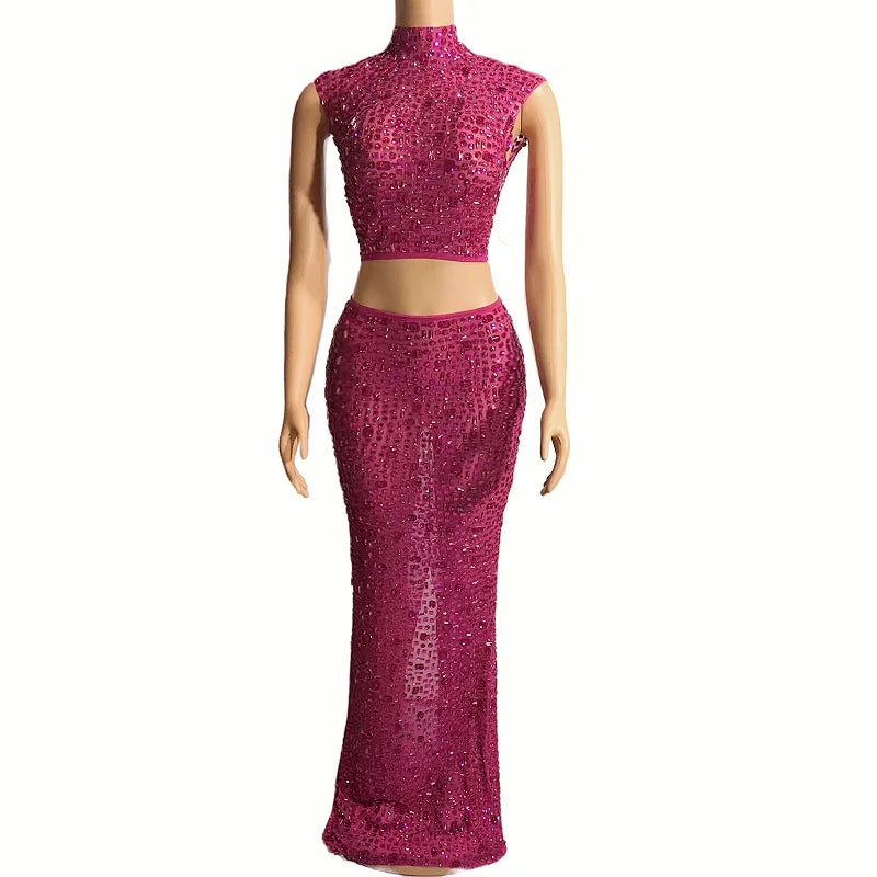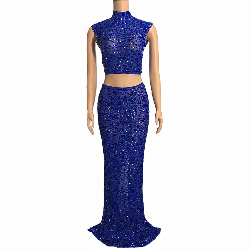 The description indicates a versatile and stylish outfit. The sleeveless 2-piece set featuring transparent mesh dresses adorned with rhinestones in 7 different colors is suitable for evening events, birthday celebrations, and other special occasions. This outfit seems to offer a fashionable and eye-catching option with its top and long skirt combination.