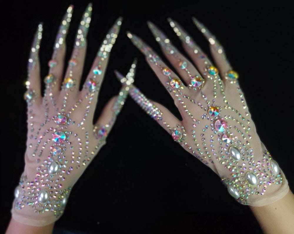 AB Rhinestone Pearls Plus Length Nails Gloves Women Drag Queen Outfit Nightclub Stage Performance Accessories