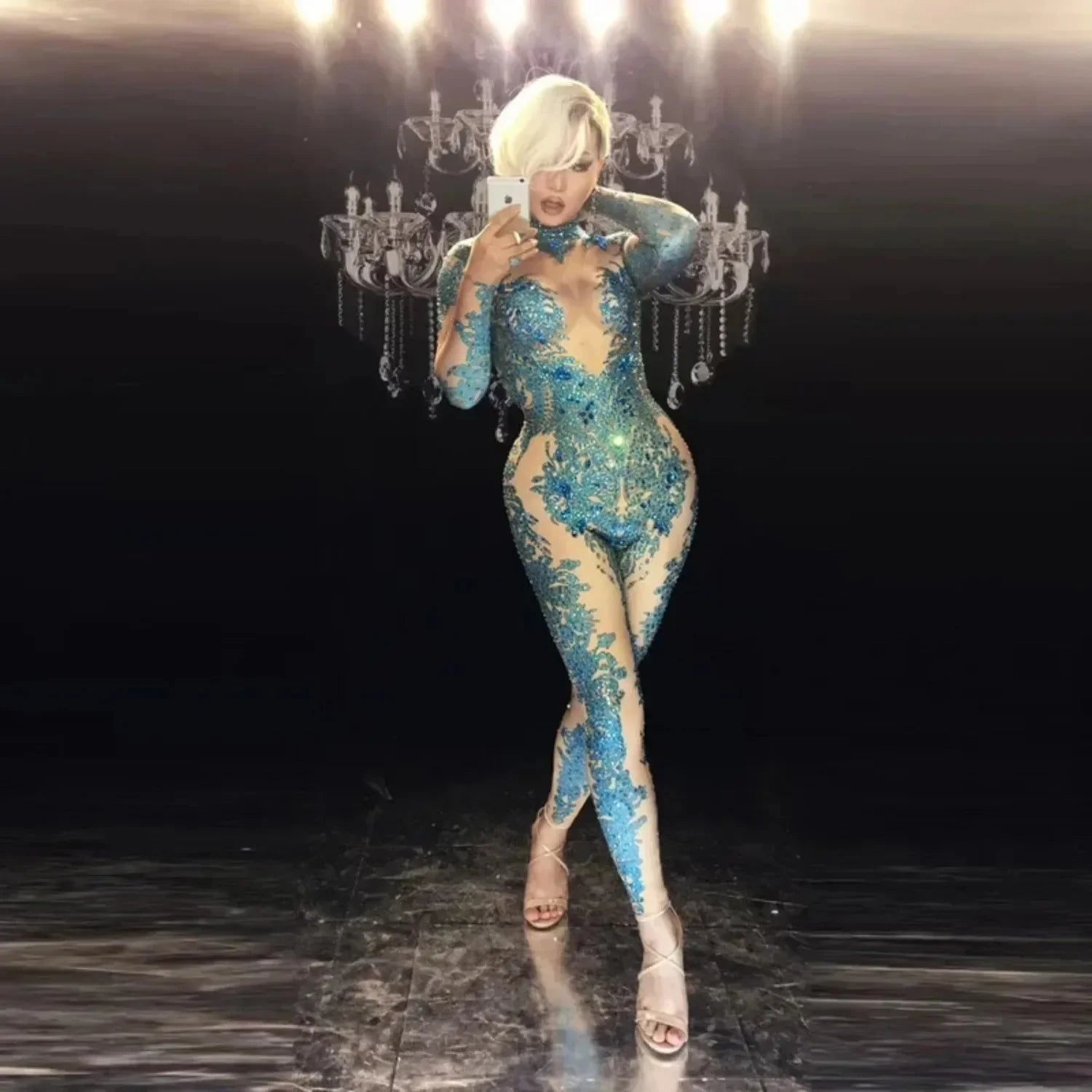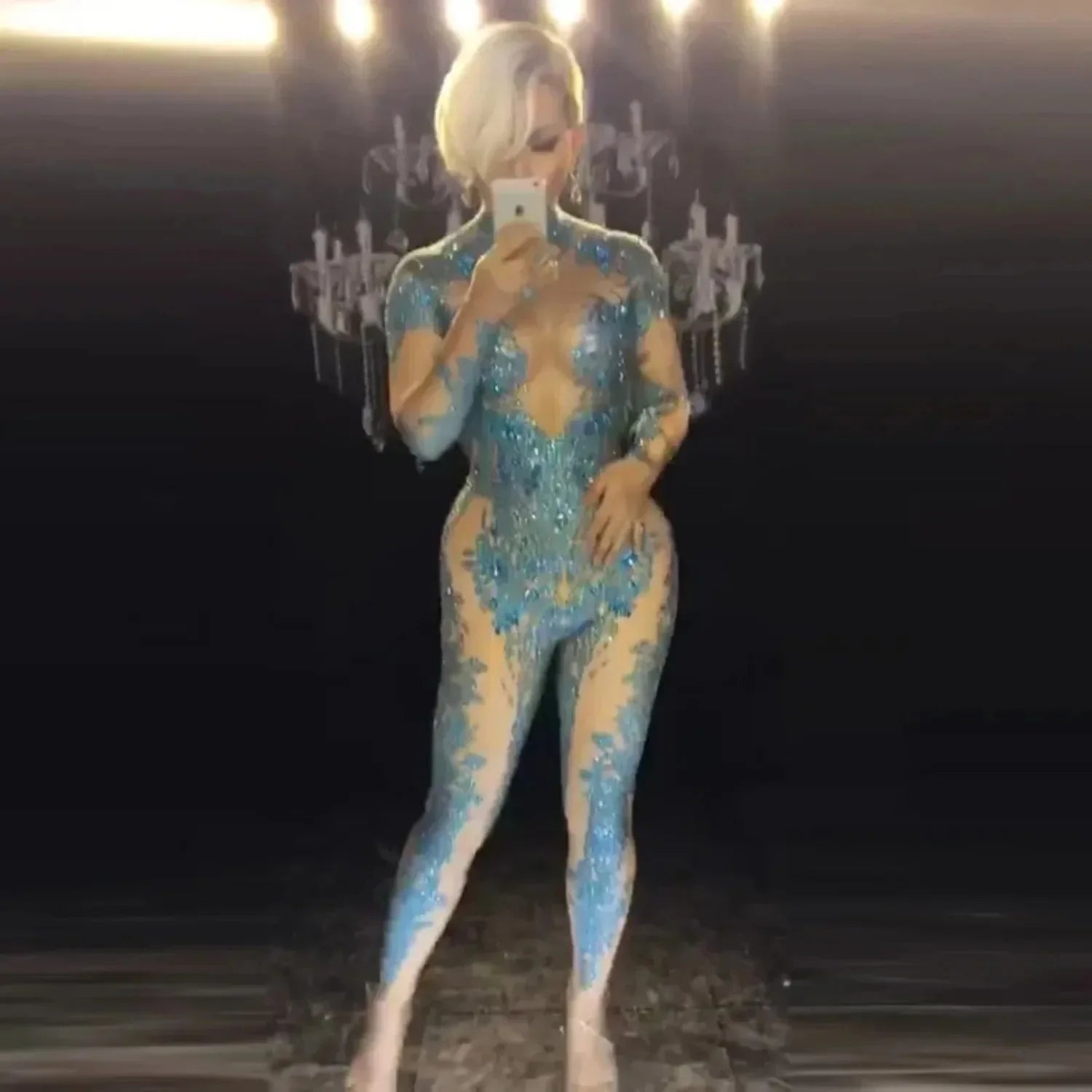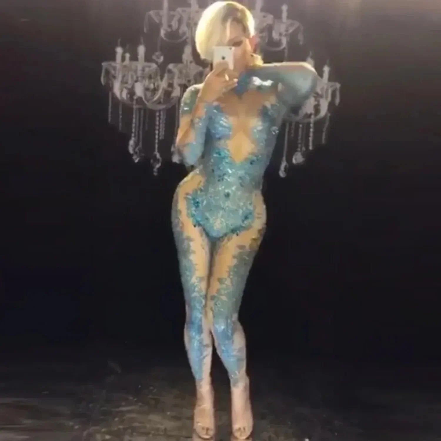 Turn heads with our AB Rhinestones Sparkly Jumpsuit! This sexy nude one-piece bodysuit is designed for ultimate style and comfort, featuring big stretch fabric that moves with you. Perfect for dance performances, birthday celebrations, and parties, this sparkling jumpsuit adds a touch of glamour to any occasion. Elevate your outfit game with this eye-catching dance costume that flatters every figure!