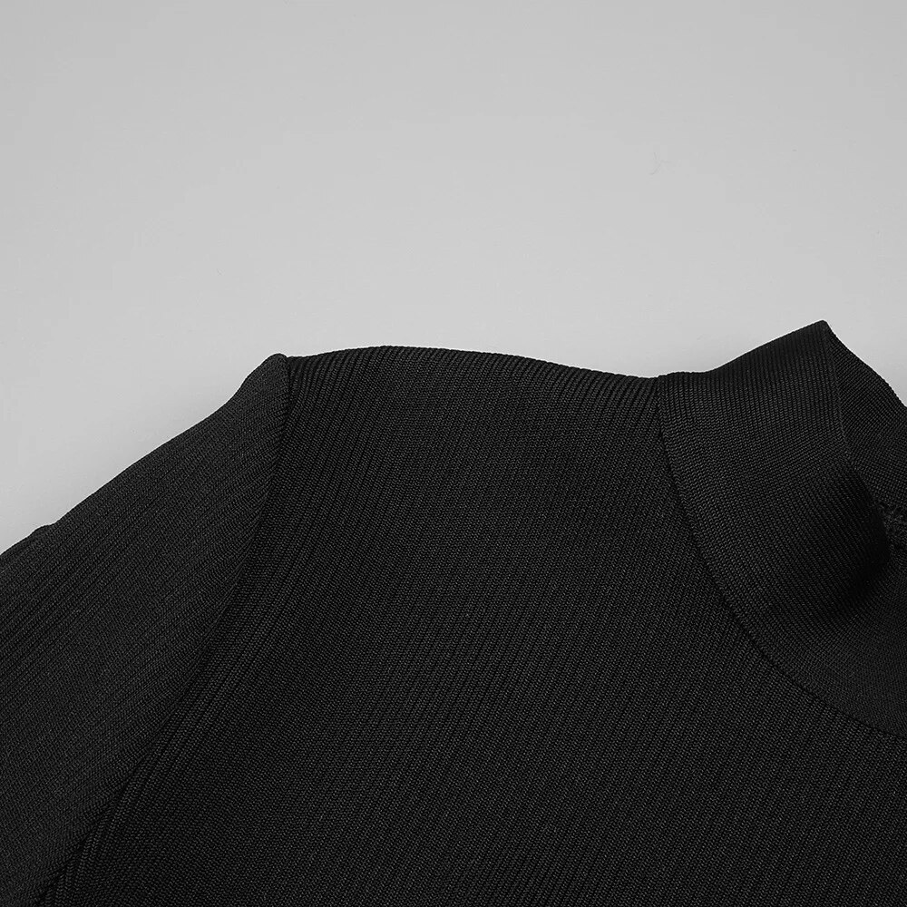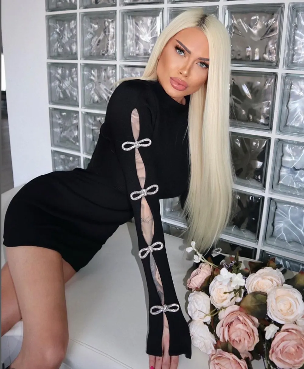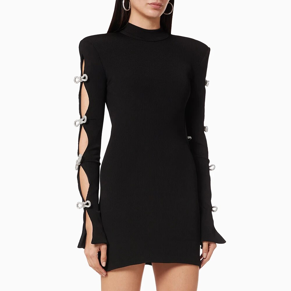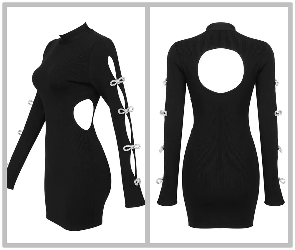 New Women's Black Sexy Open Back Tight Long Sleeve Mini Bandage Dress Hollow Out Bow Diamond Celebrity Party Dress