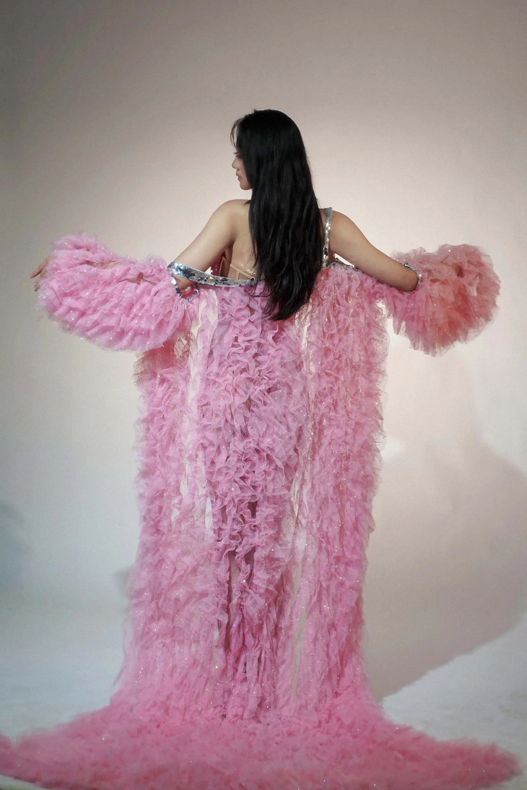 Amazing Tulle Coat for Stage Performance Pink Tulle Fluffy Cape Ruffles Coat Long Sleeve Tulle Cloak Women Long Jacket Pifeng