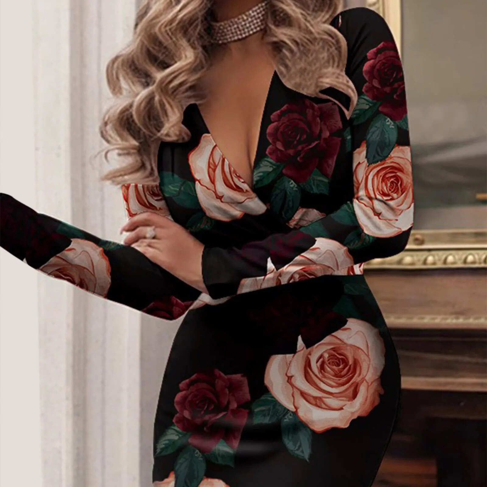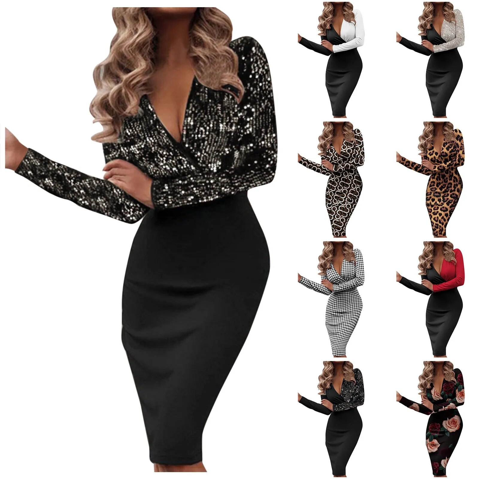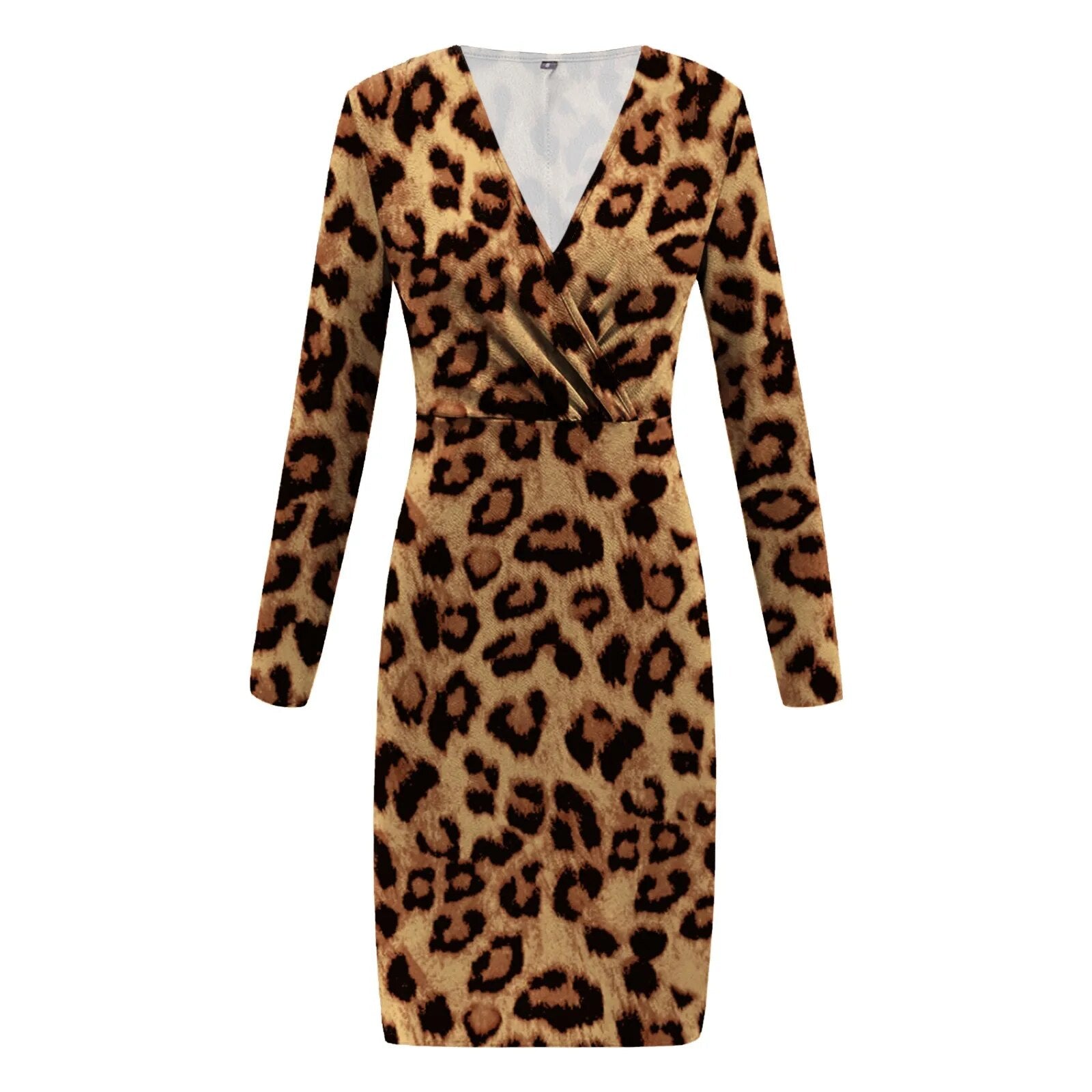 Women's Fashion Leopard Printe Patch Deep V-Neck Long Sleeve Party Dress