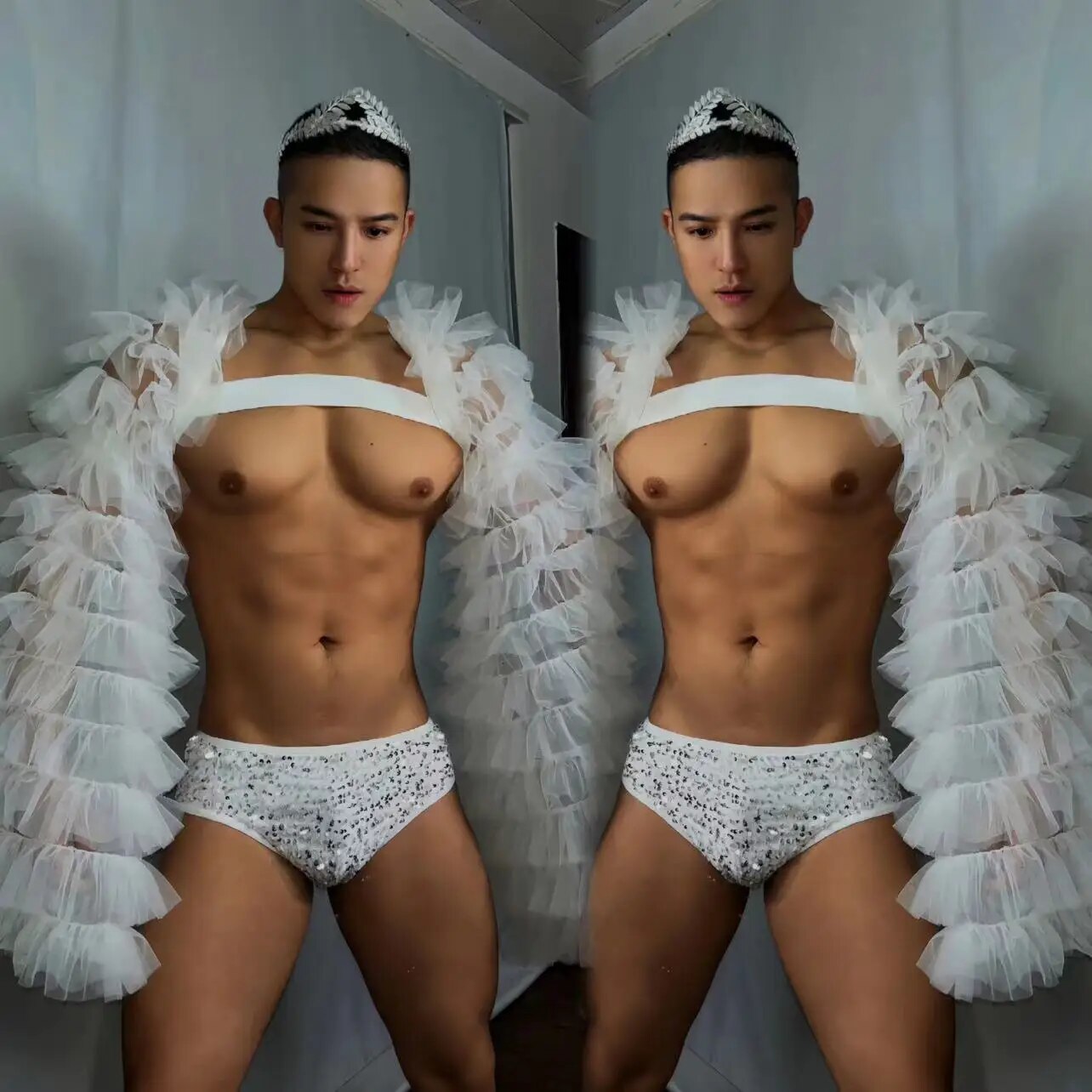 Bar Nightclub Dancer Male Gogo Pole Dance Costume Festival Party Show Rave Outfit White Gauze Fluffy Sleeve Coat Sequins Shorts