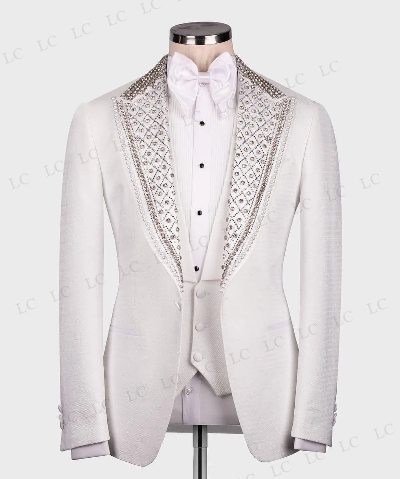 This luxurious men's suit set features 2 pieces with a beaded blazer and vest adorned with crystals and diamonds. The one-button closure and slim-fit design create a sophisticated and elegant look, perfect for weddings, groom attire, and special occasions. Tailored for a comfortable and stylish fit, this suit is available in plus sizes for a customized look. Make a statement with this beaded and luxurious suit for a memorable and stylish appearance.