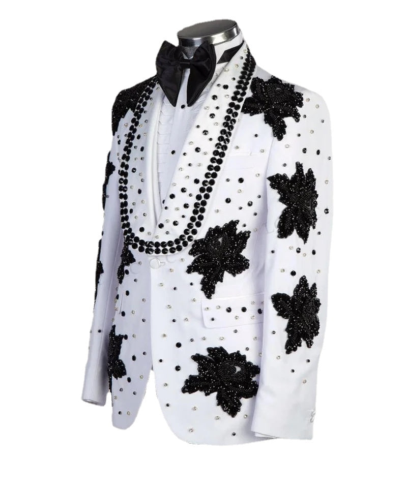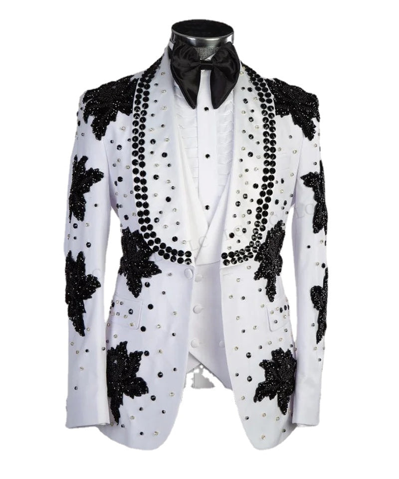 ??Elevate your formal look with this luxurious men's suit set adorned with beads, diamonds, and appliques. The two-piece ensemble includes a stylish blazer and vest with a sophisticated one-button design and wide lapel. Perfect for parties, weddings, and groomsmen attire, this slim-fit suit is tailored to perfection and available in plus sizes for a comfortable and stylish fit. Make a statement with this exquisite and elegant outfit for any special occasion.