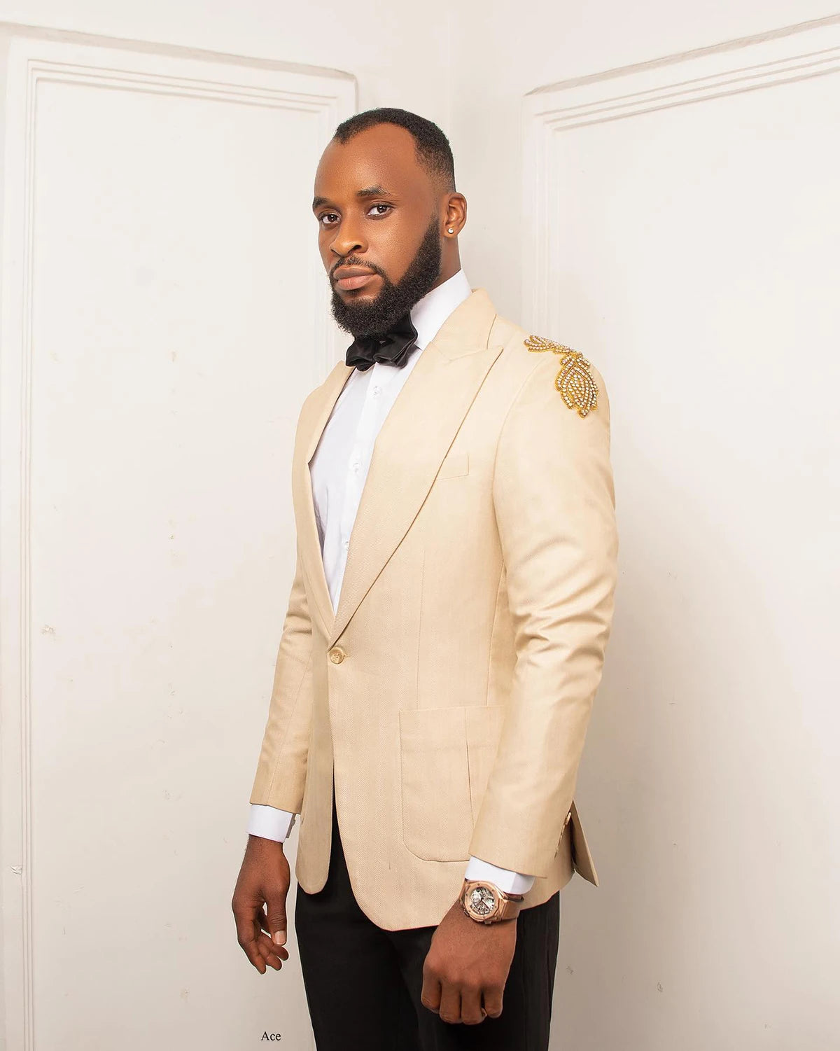 This men's wedding tuxedo features a sophisticated beige color with intricate flower and bead detailing. The 2-piece set includes a stylish jacket and black pants, making it perfect for party wear and birthday celebrations. It's a fashionable and elegant choice for special occasions