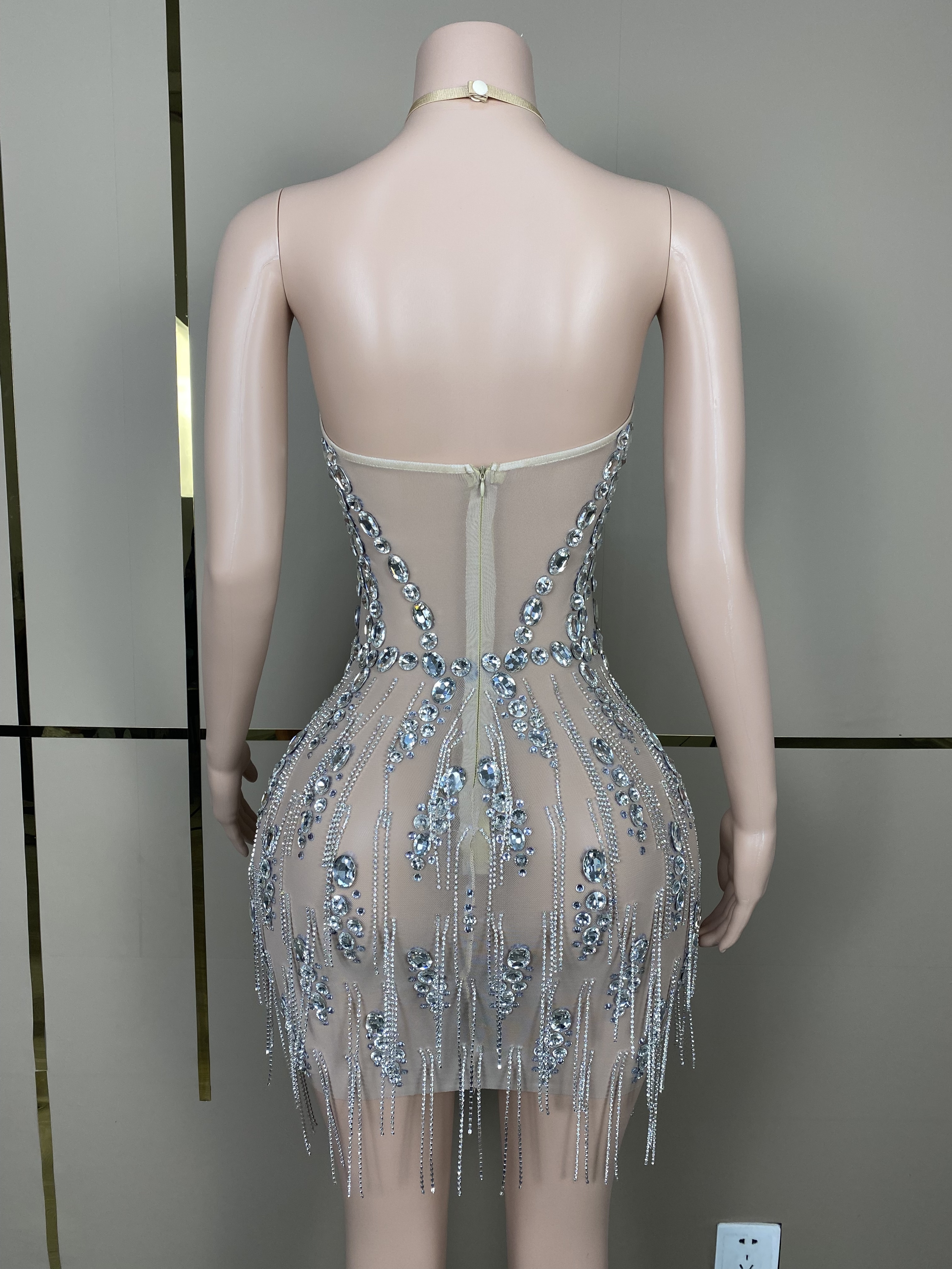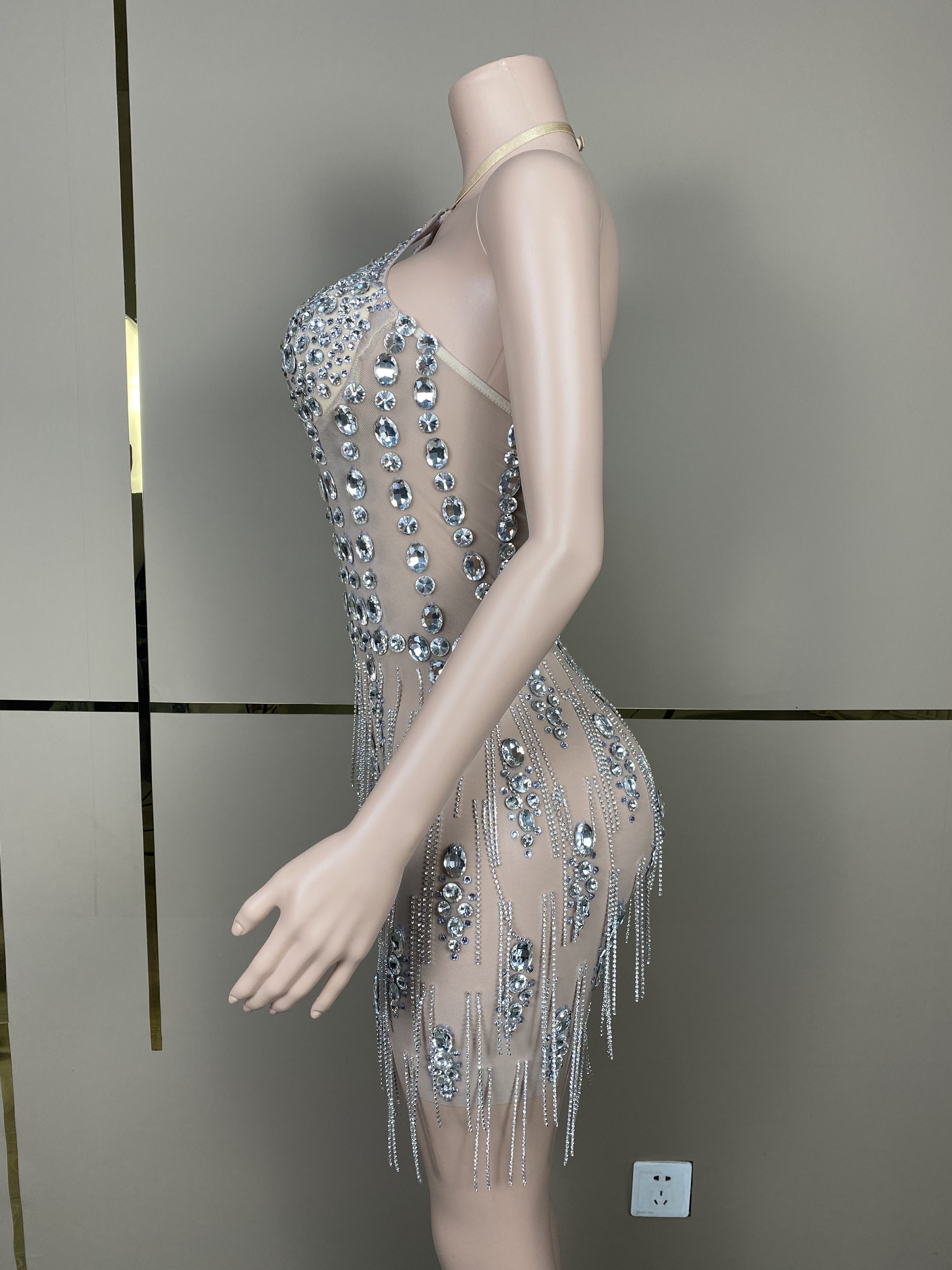 Big Crystals Silver Rhinestones Chains Celebrate Sexy Dress Birthday Stretch Costume Outfit Prom Evening Tranparent Dress