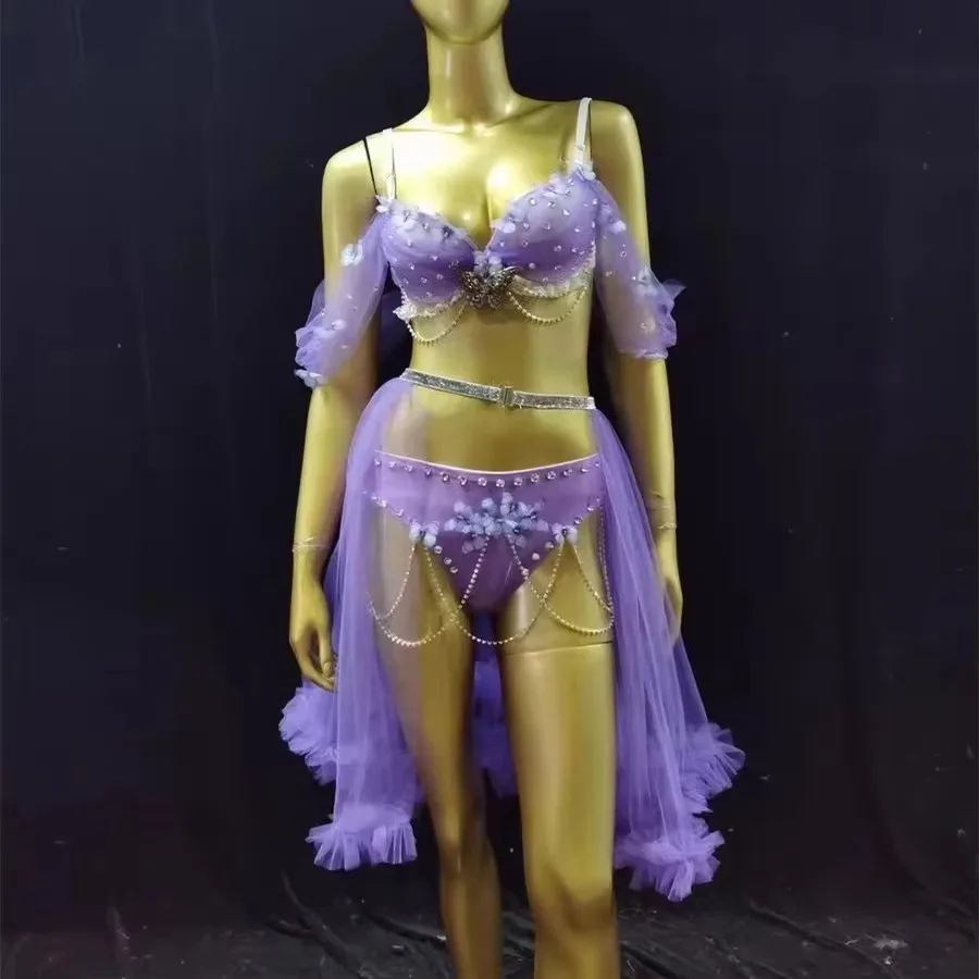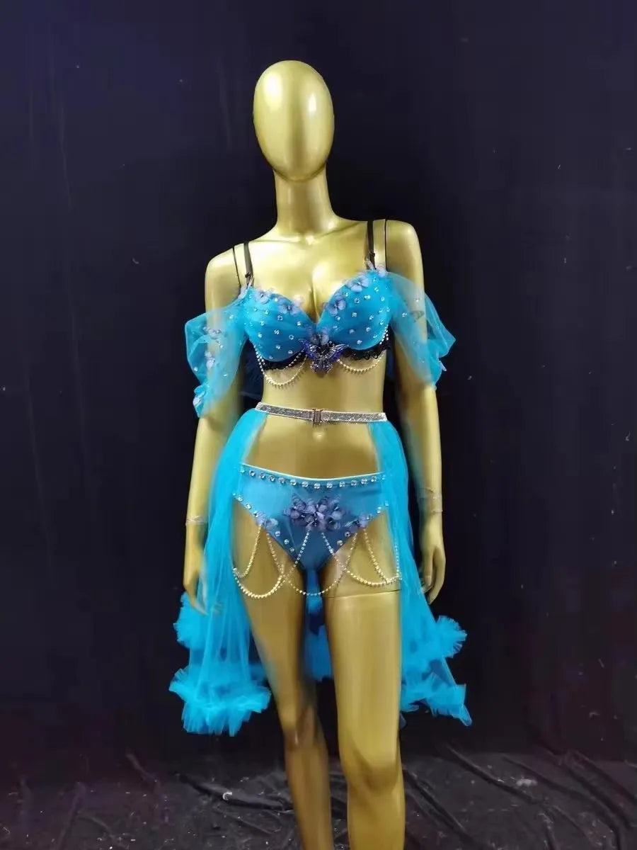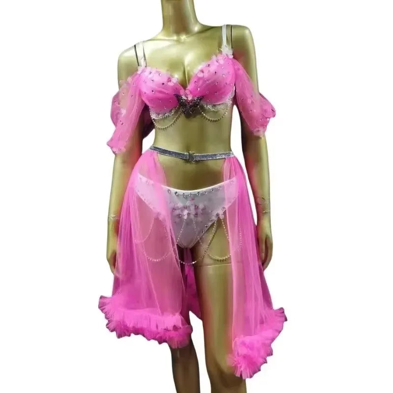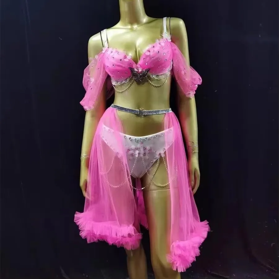 Bikini Mesh Skirt Dance Outfits Bar Nightclub Sexy Performance Costume Pink Blue Rhinestones Carnival Party Show Rave Stage Wear
