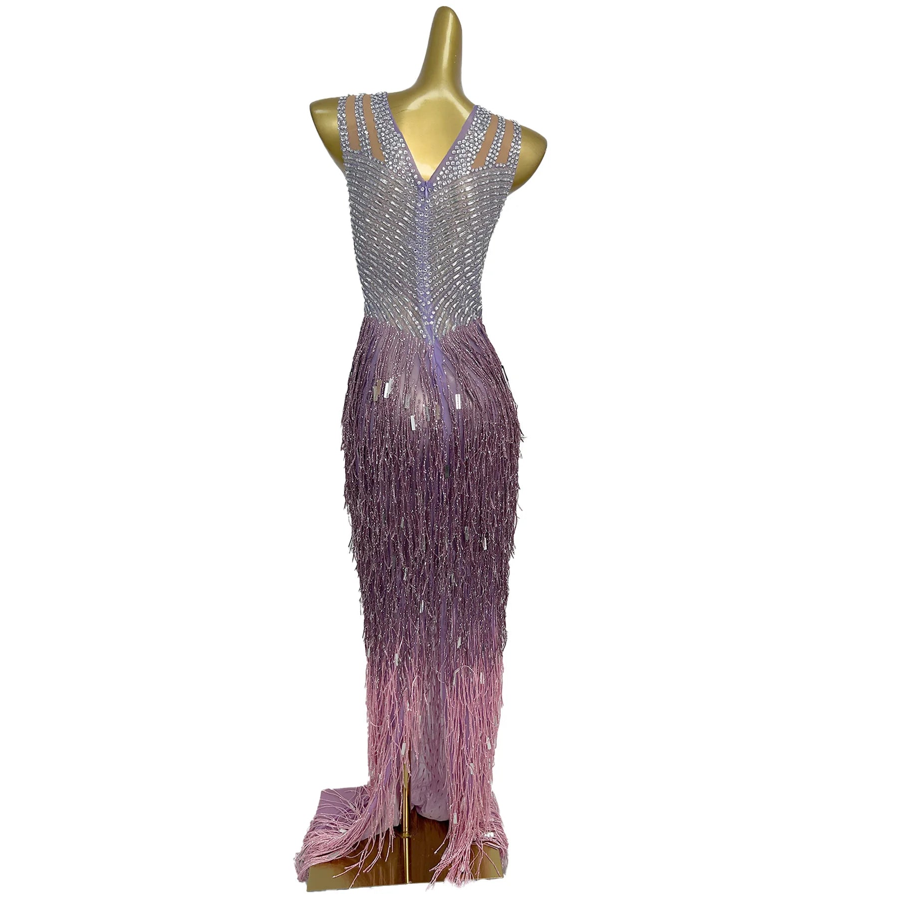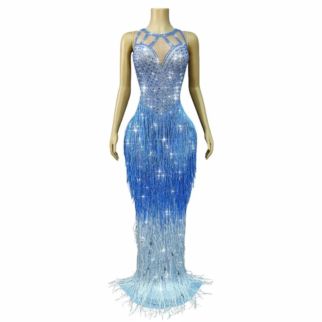 Birthday Celebrate Party Outfit Elegant Evening Gown Sexy Women Sparkly Crystals Mesh Sleeveless Tassel Sexy Long Dress聽