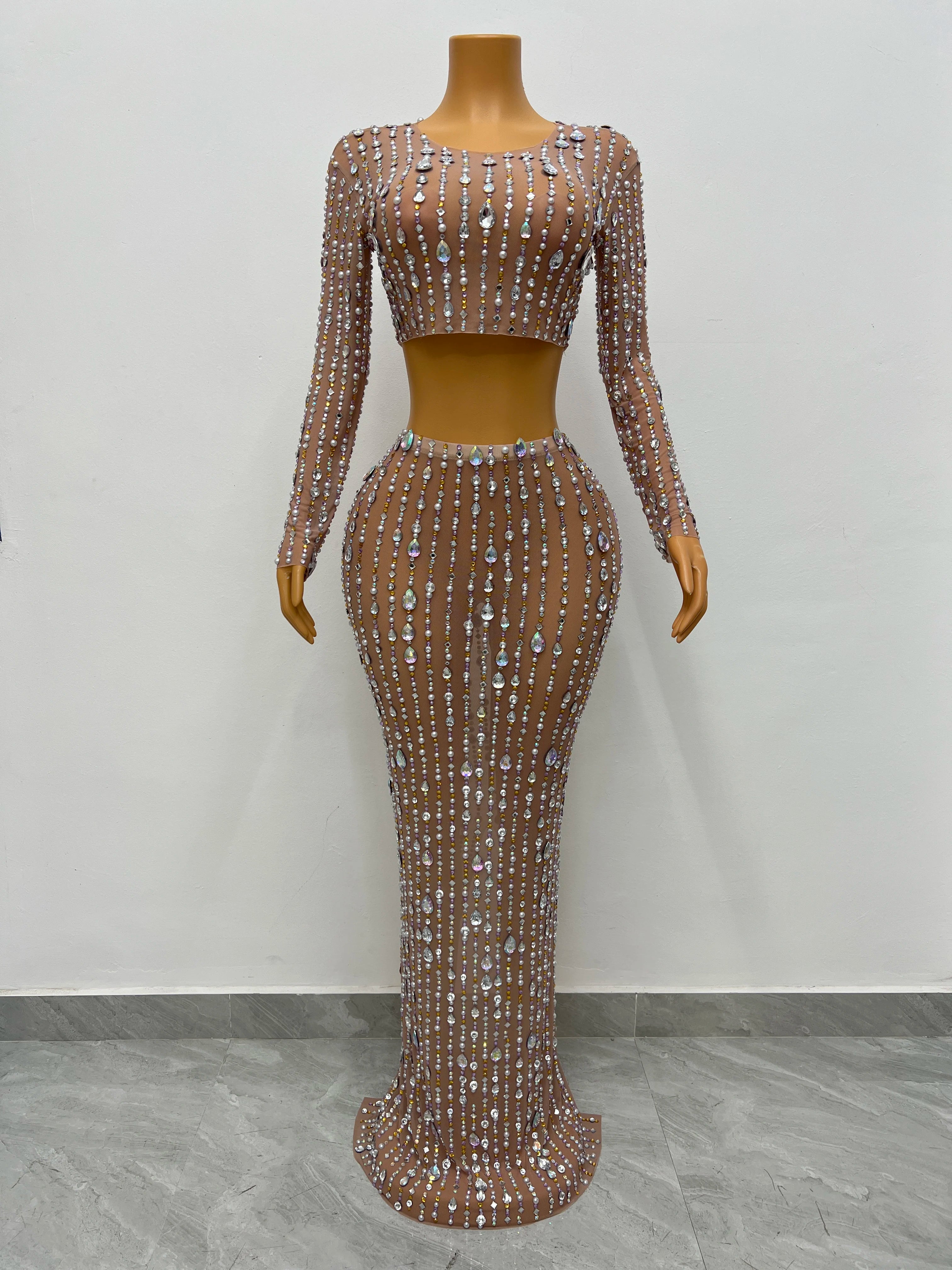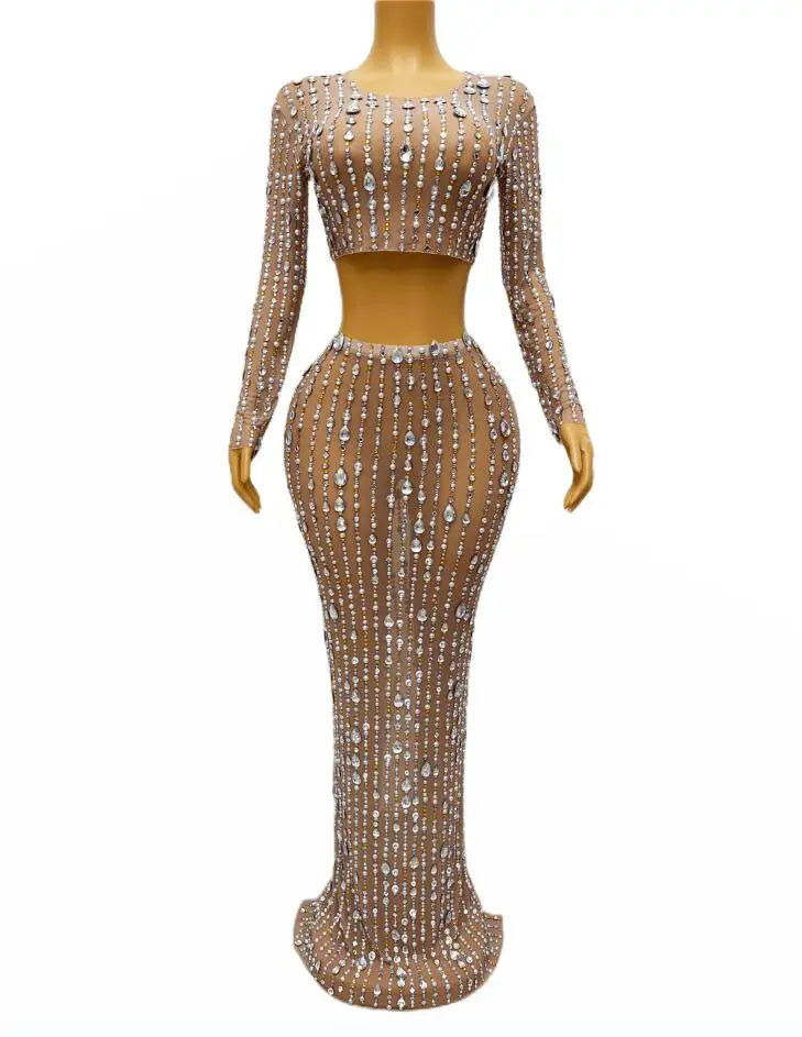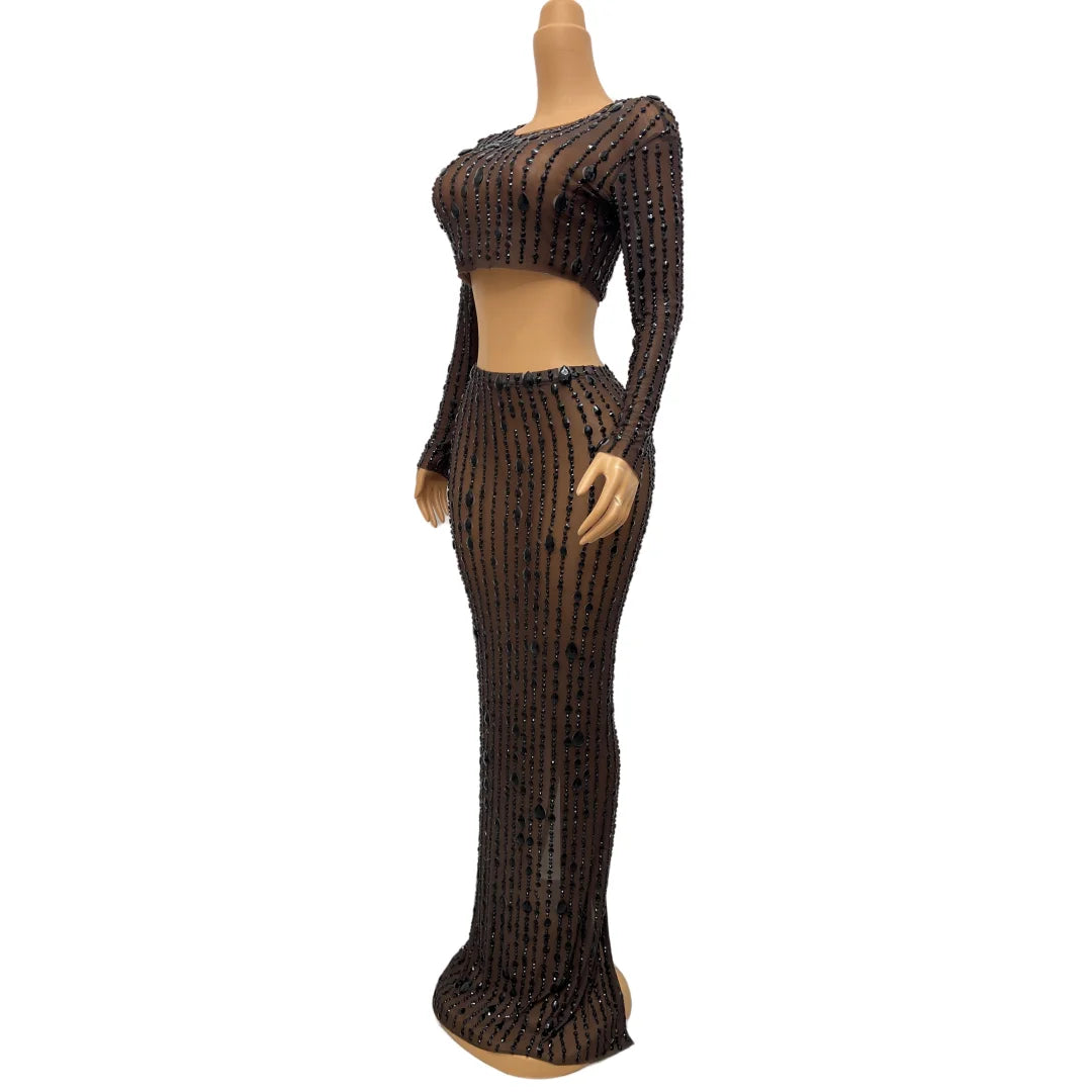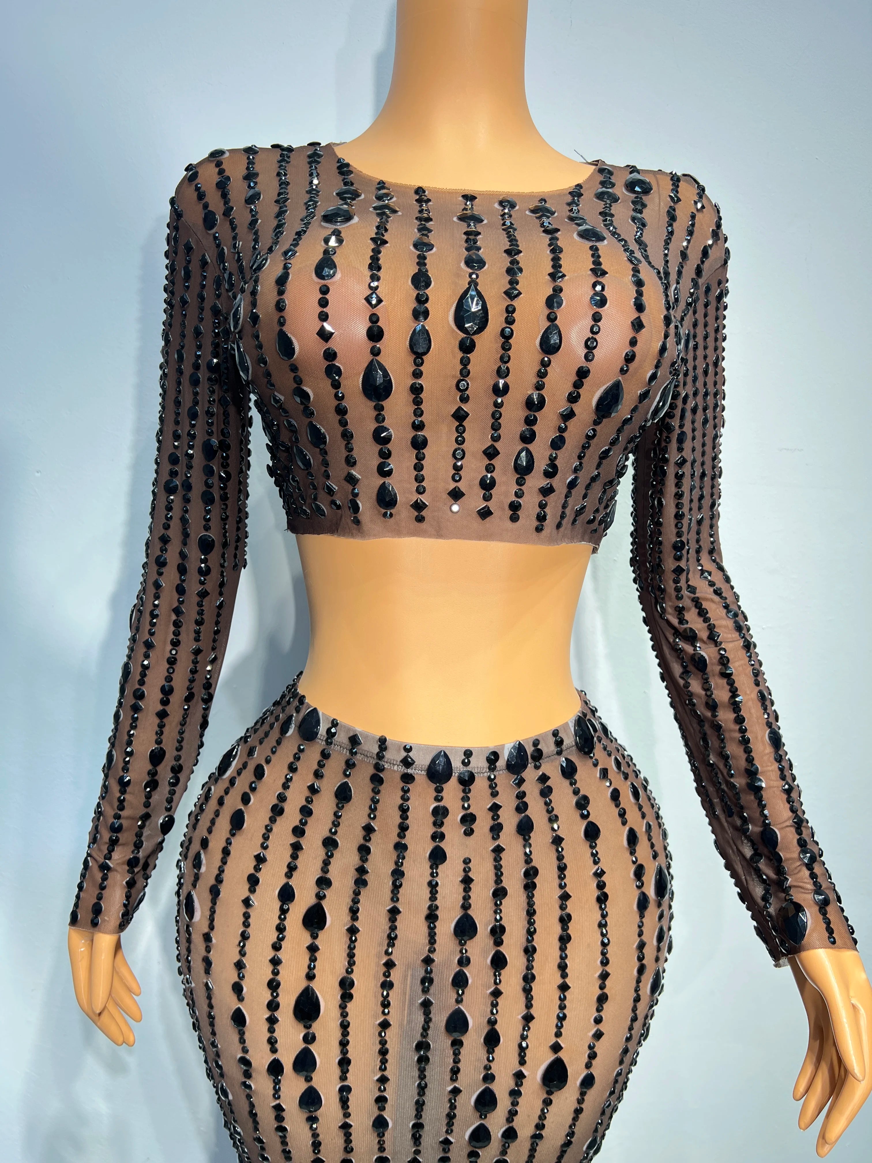 This black two-piece dress features big rhinestones and a transparent design, making it a perfect outfit for singers, evening events, prom, or any party collection. The top and skirt combination creates a stylish and eye-catching ensemble.