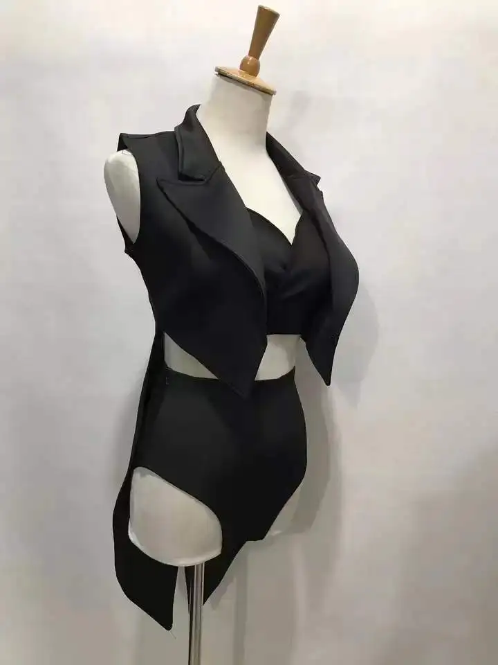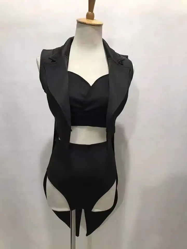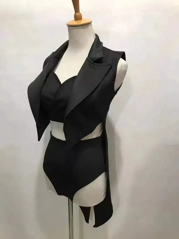Black Bra Shorts Tailcoat 3-Piece Set Sexy Stage Wear Nightclub Bar DJ Singer Dancer Performance Clothes Women Jazz Dance Outfi