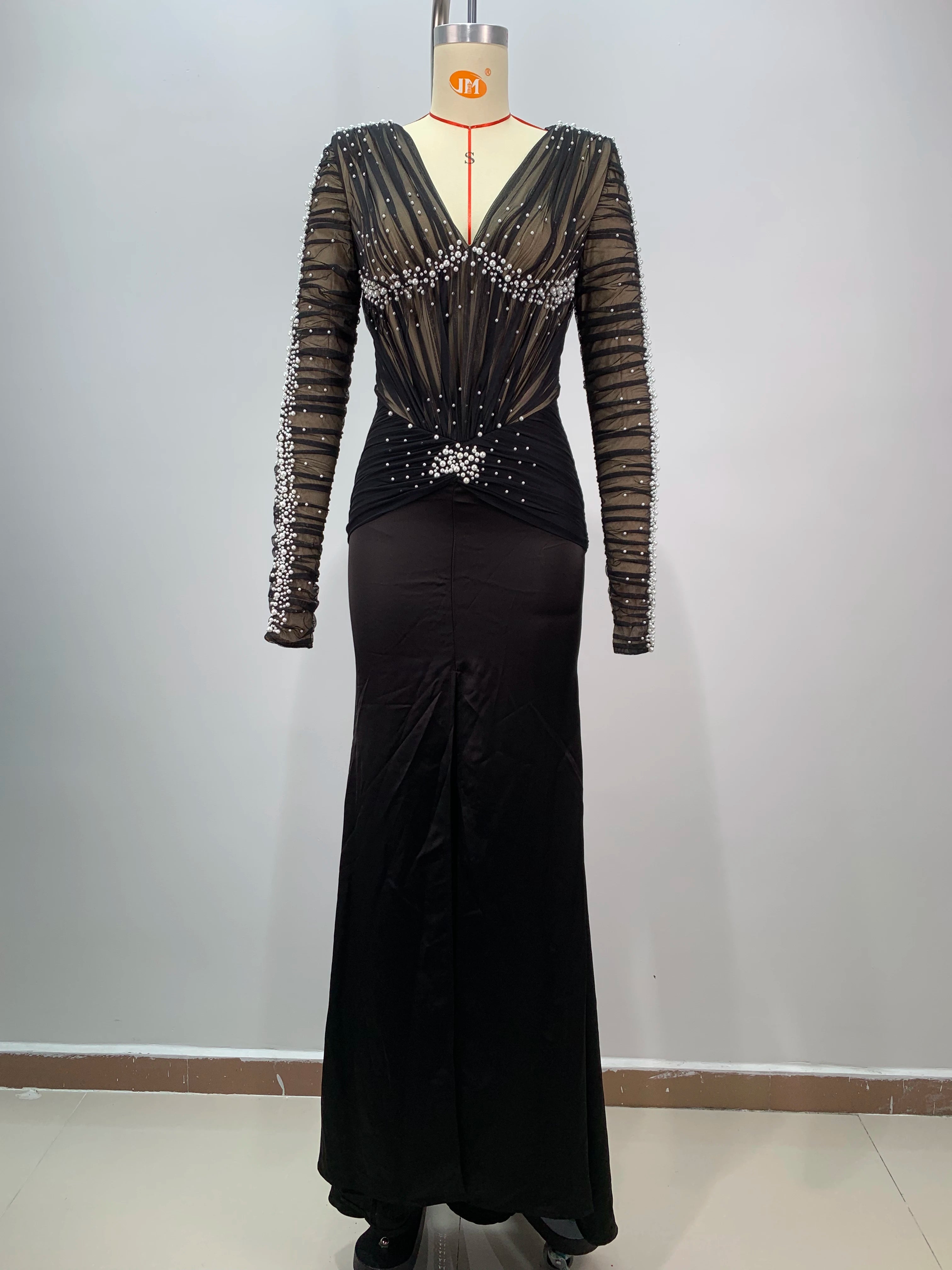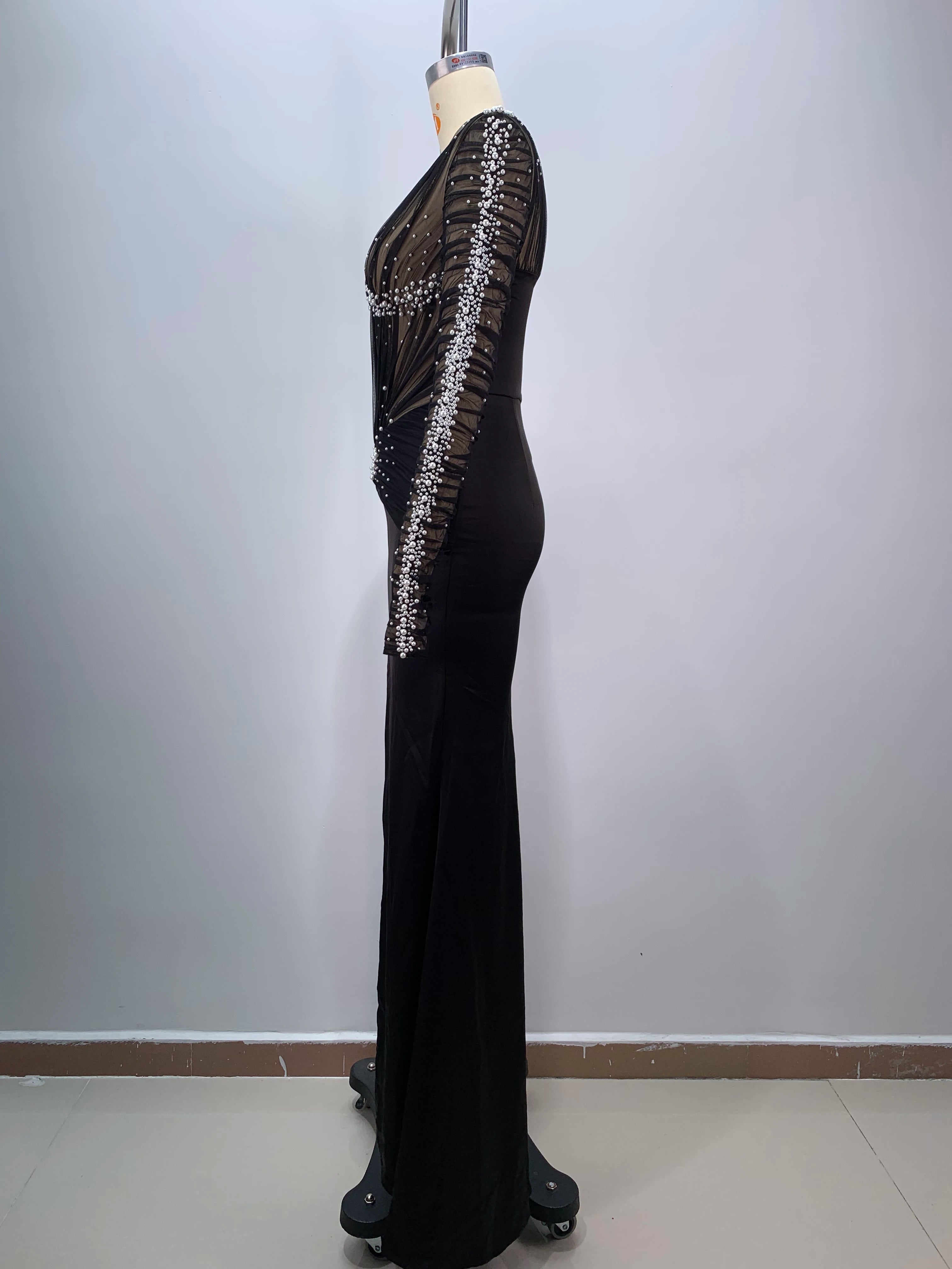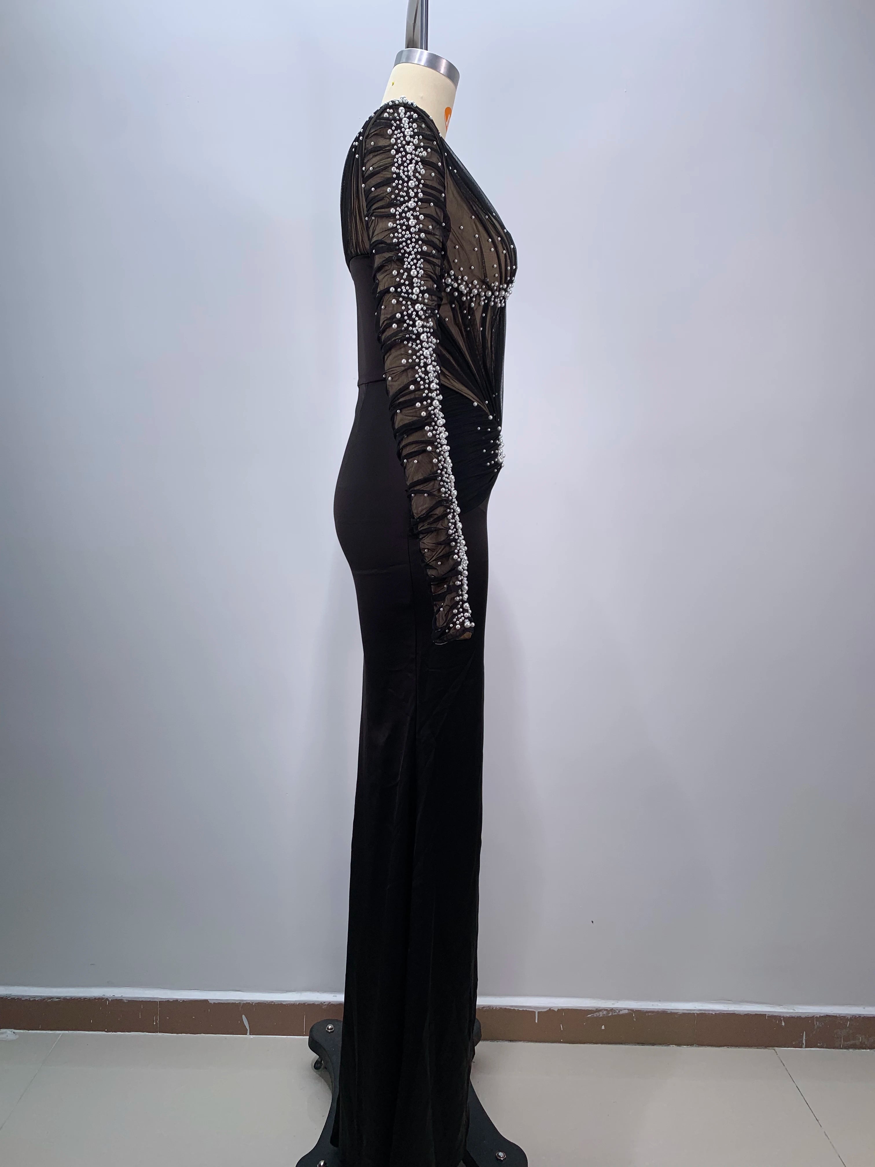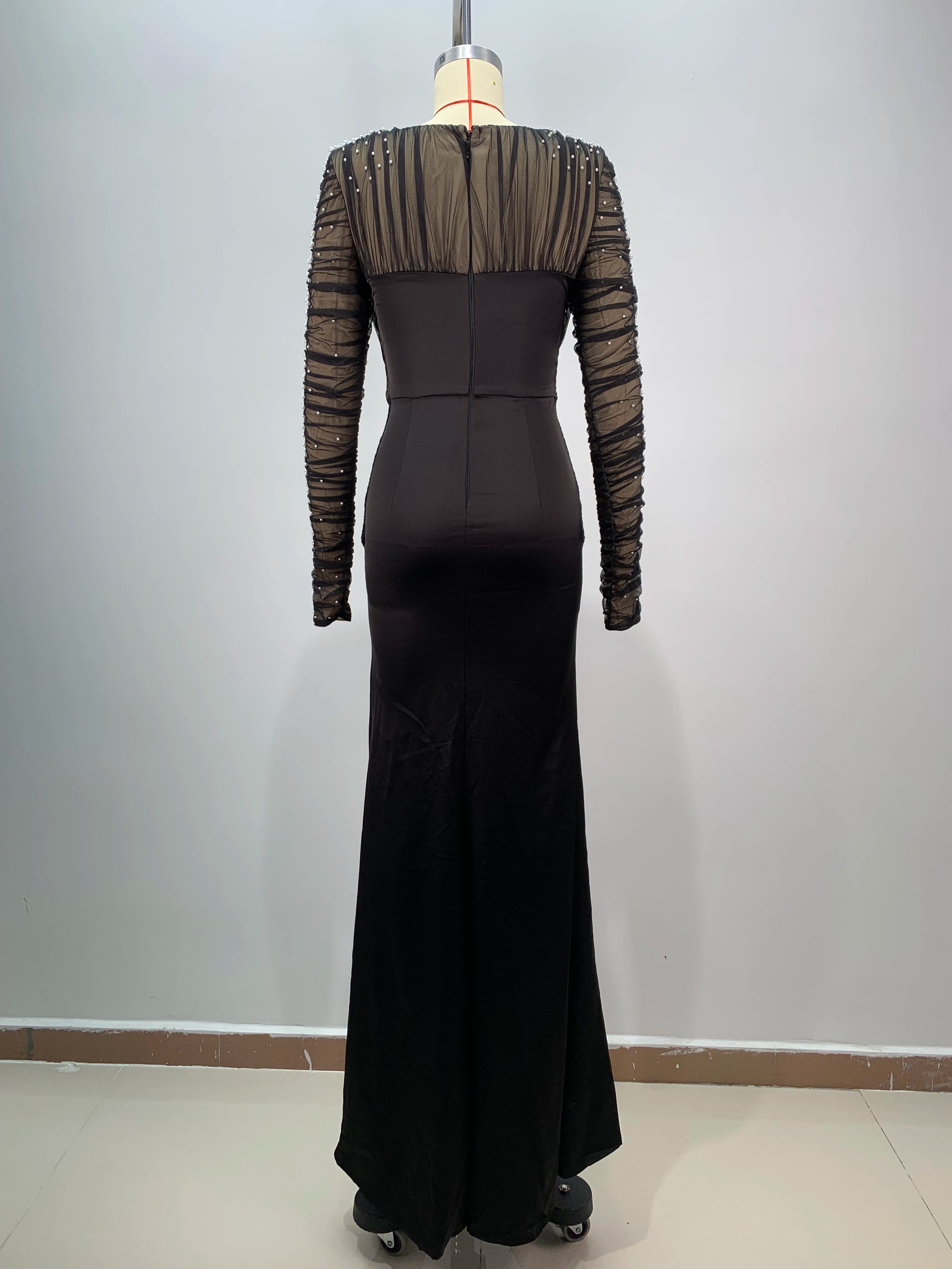Introduce a refined and glamorous gown designed for elegant evenings: theBlack Color Women Long Sleeve Sexy Mesh Pearl Beading Bodycon Long Dress. This long, figure-hugging dress pairs sheer mesh sleeves and panels with delicate pearl beading to create a luxe, camera-ready look perfect for evening parties, proms, celebrations, and formal events.