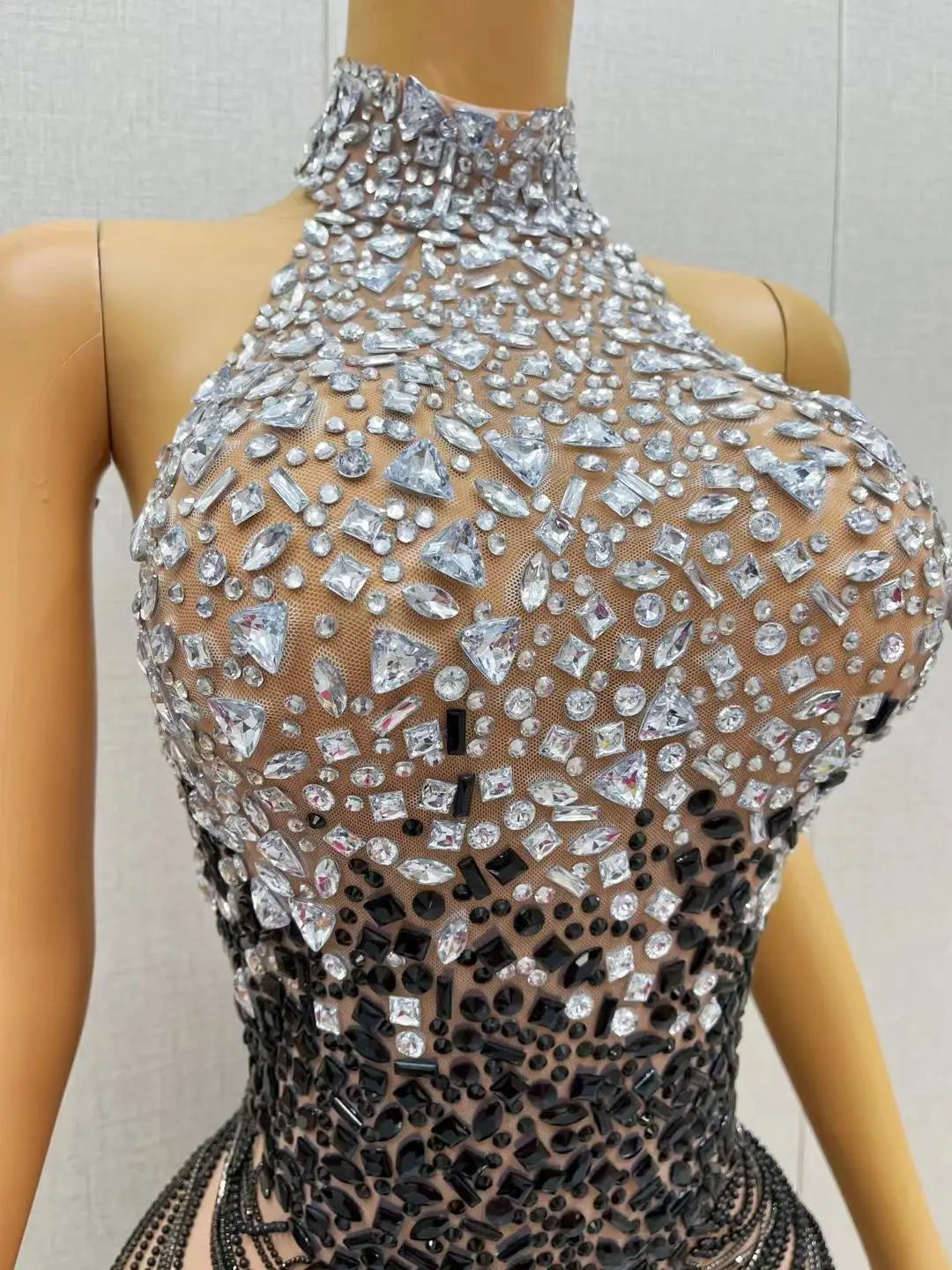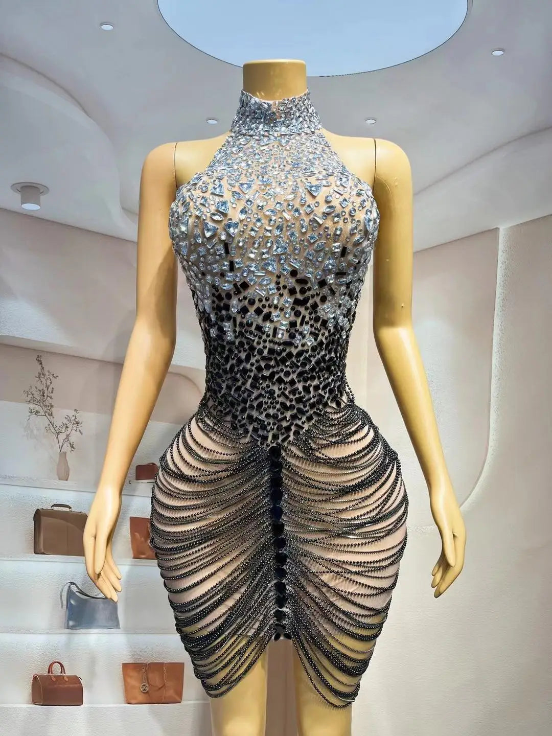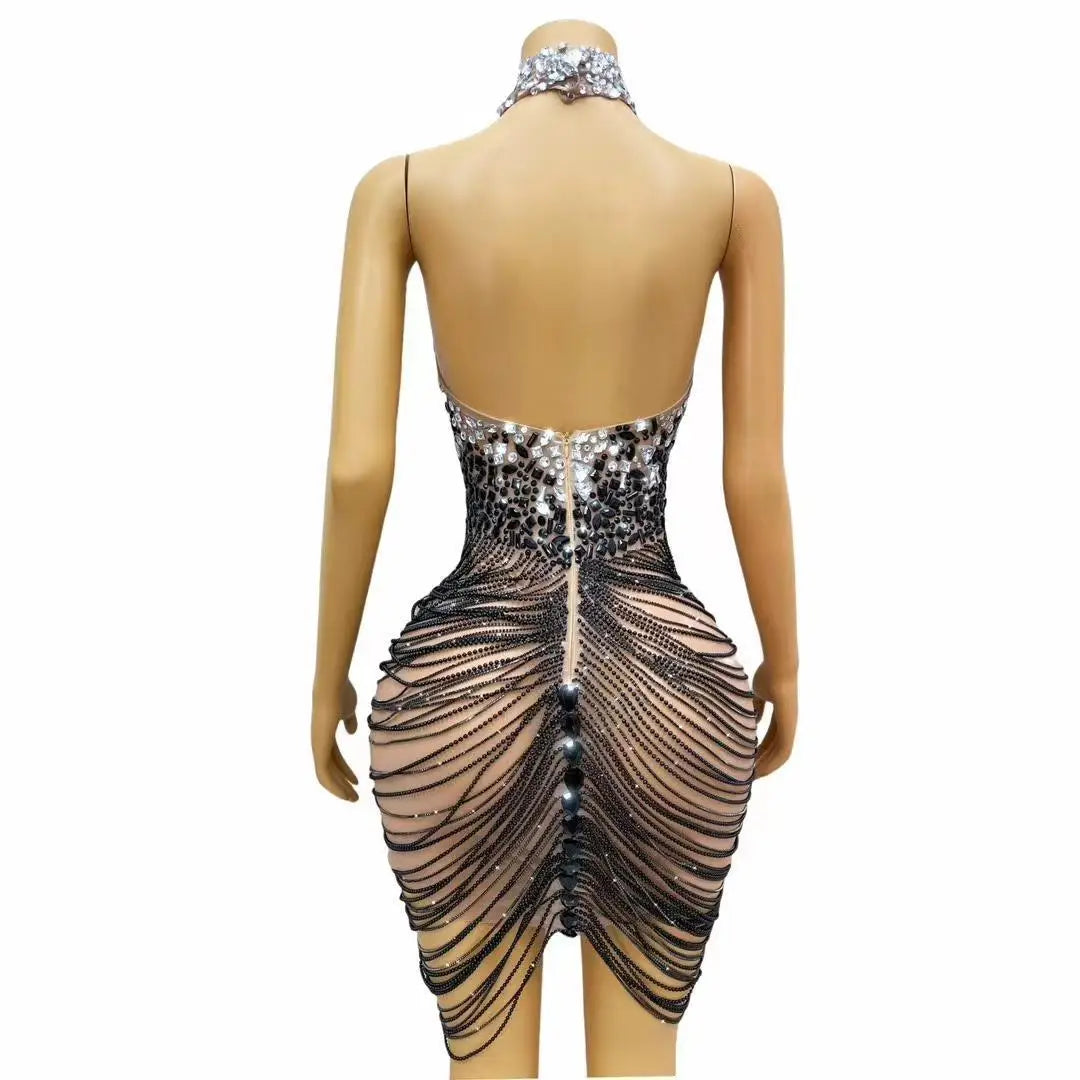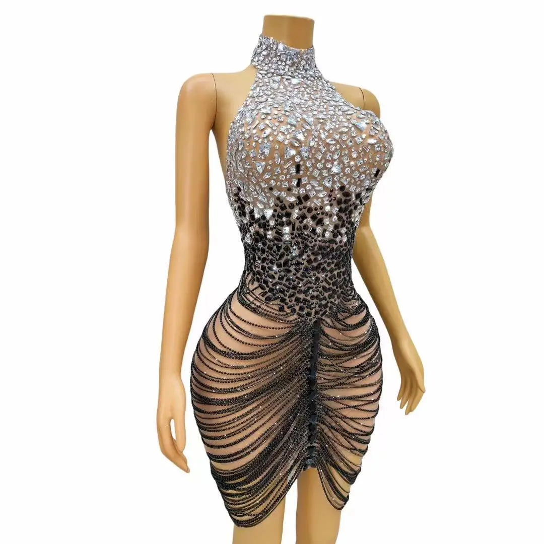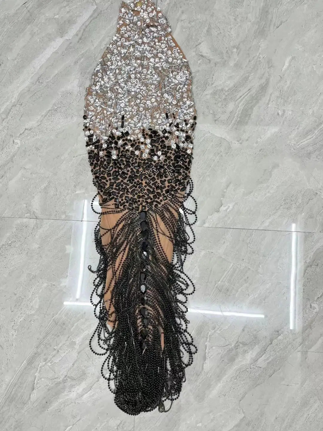 Black Drill Chain Fringed Diamonds Dress Women Party Jazz Dance Rave Outfit Gogo Costumes Stage Performance Clubwear