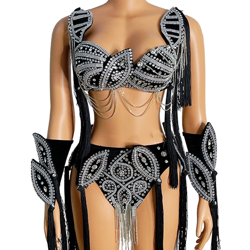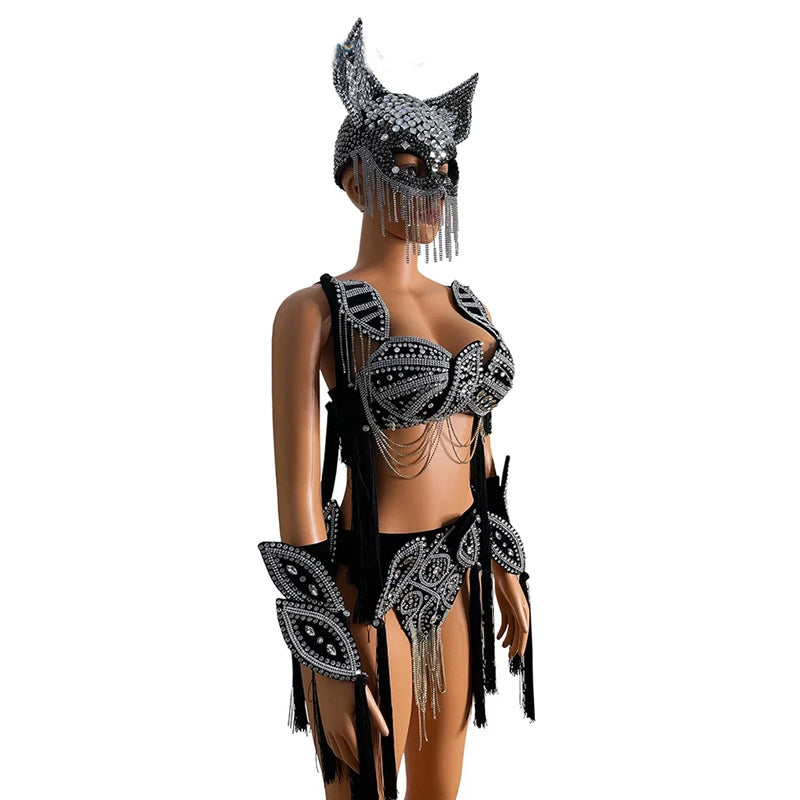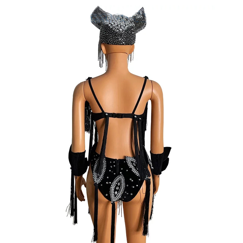 Black Fringed Bikini Stage Headdress Silver Tassel Diamond Headwear Carnival Gogo Costume Festival Crossdress