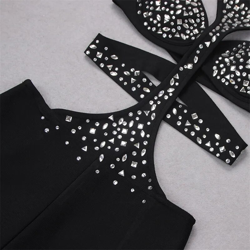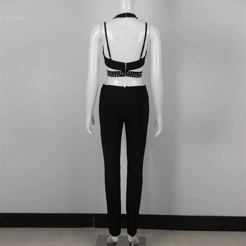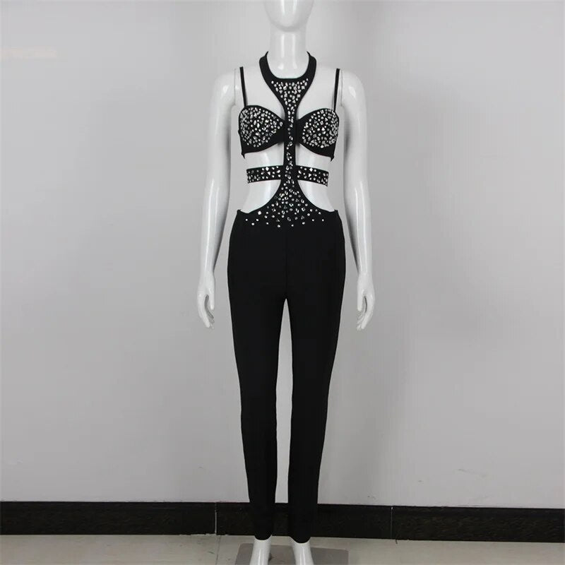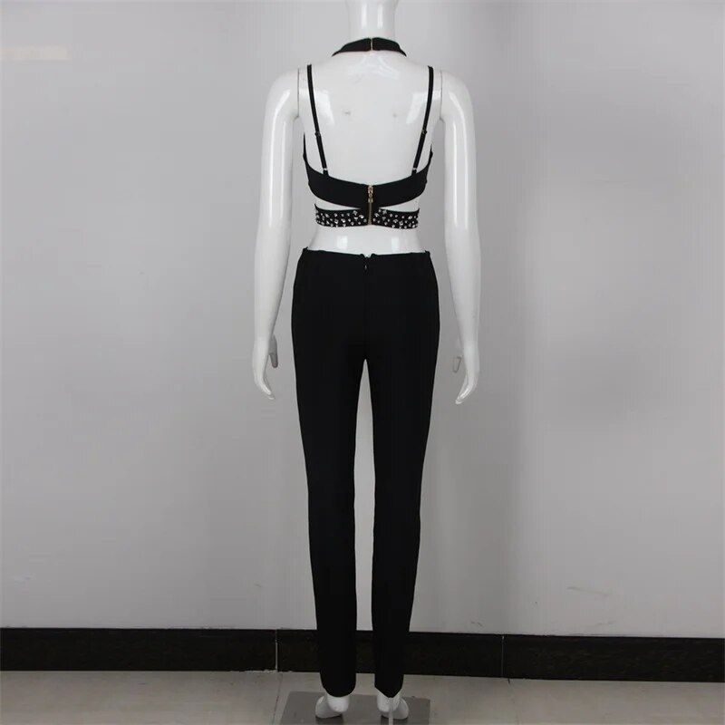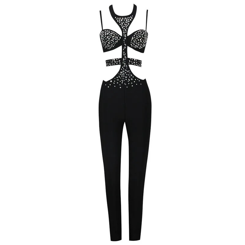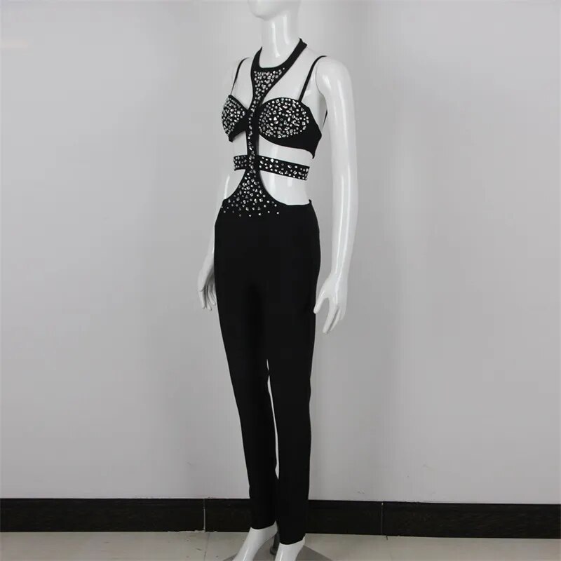 Black Jumpsuit Luxury Crystals Prom Dress Halter Sleeveless Sexy Hollow Pants Evening Party Gown Robes