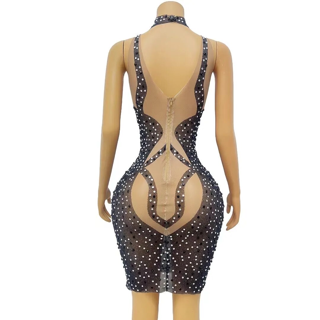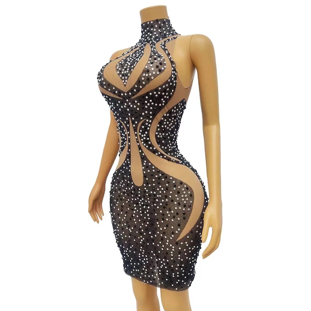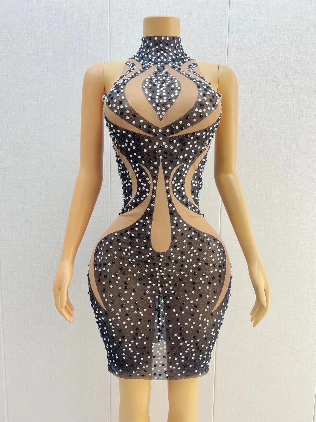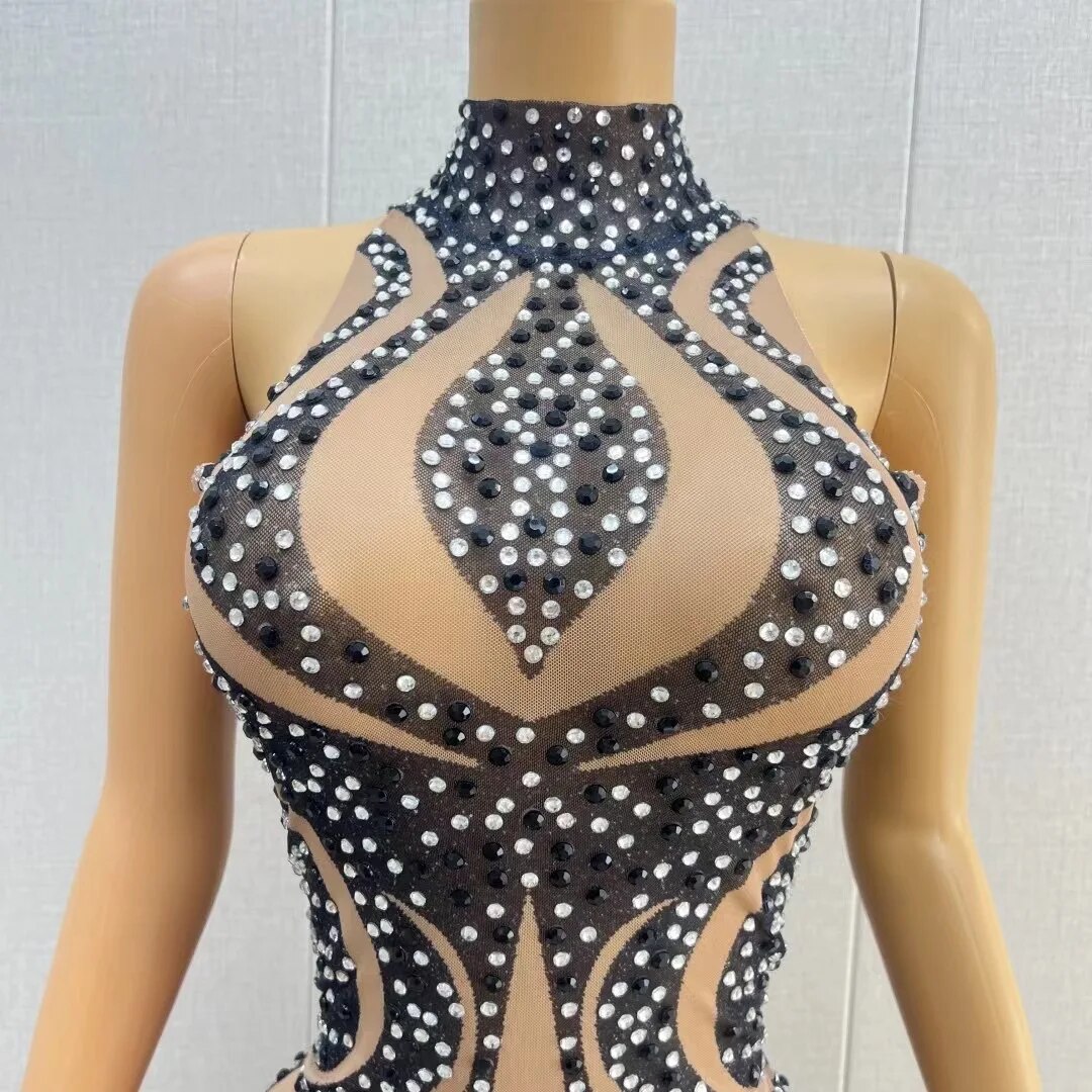 Black Rhinestones Nude Sexy Transparent StrecrCelebrate Dress Birthday Stage Wear DanceOutfit Prom Party Tuteng