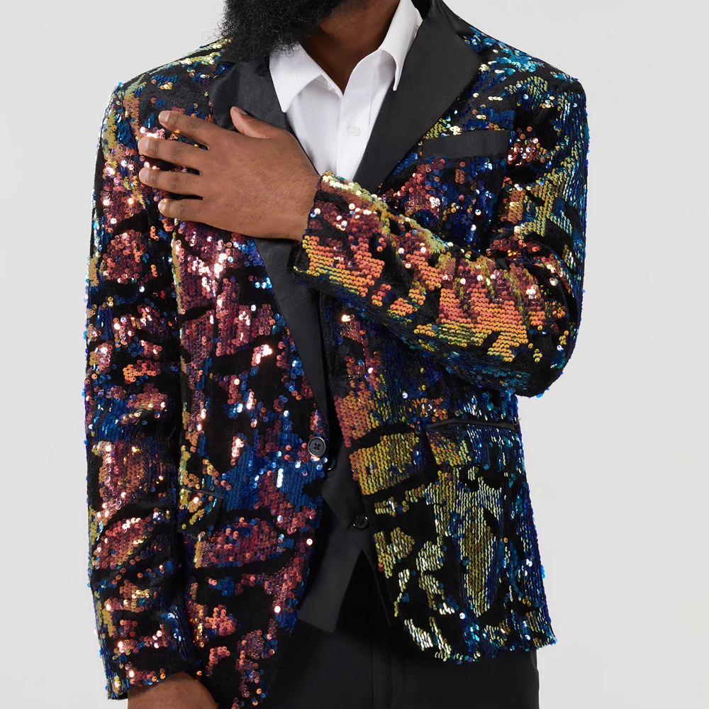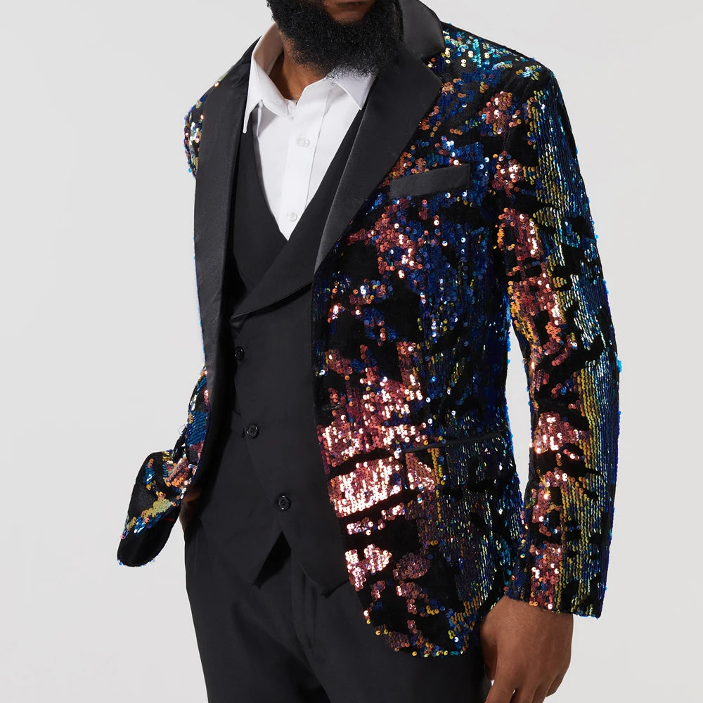 This black sequin suit jacket features a striking one-button design and a stylish shawl collar, making it the perfect choice for men who want to stand out. Adorned with bling and glitter, this jacket is ideal for nightclub events, proms, and stage performances, making it a popular choice among singers and performers. Its eye-catching design exudes confidence and style, making a bold statement at any event