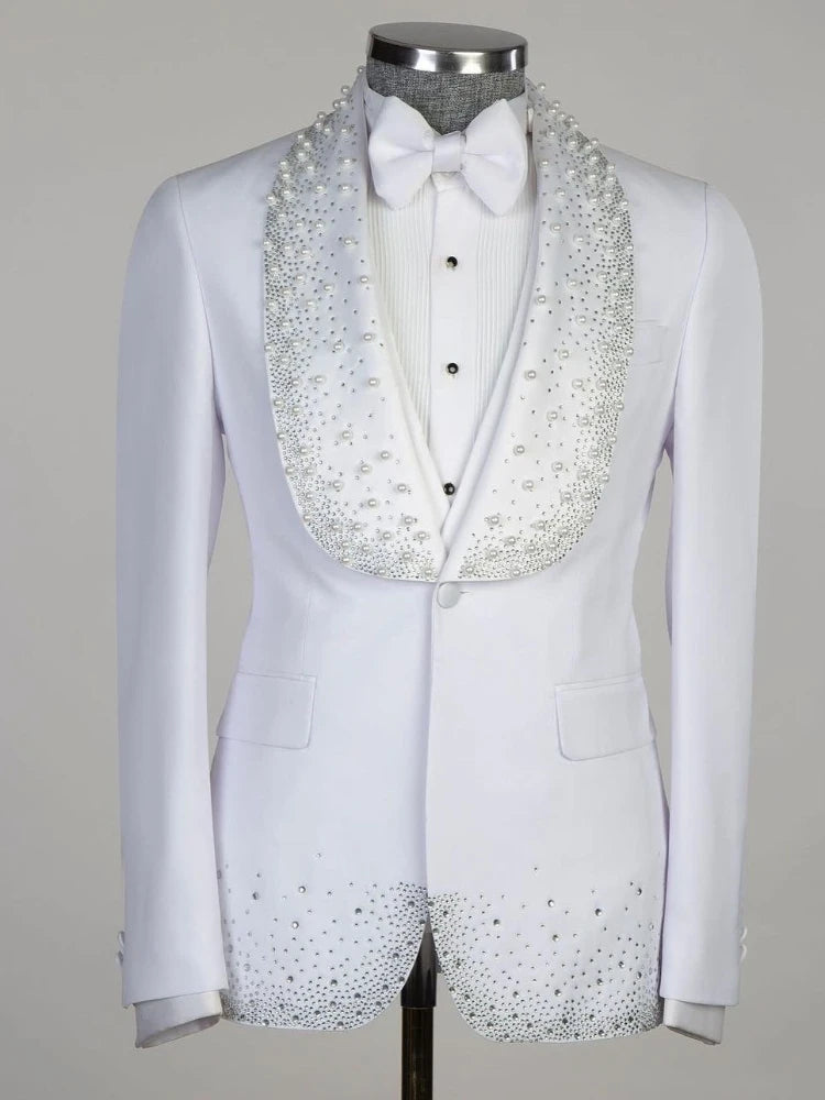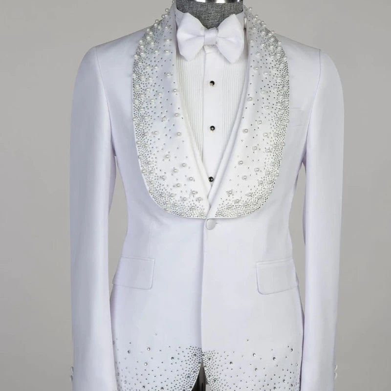 Make a bold statement with this blazer vest men's suit adorned with intricate appliques, diamonds, and beads. The ensemble features a one-button closure and a wide lapel for a formal and elegant look. Perfect for parties, weddings, hosting duties, and formal occasions, this custom-made suit is tailored to plus sizes for a flattering fit. Stand out with this unique and luxurious ensemble that exudes sophistication and style.