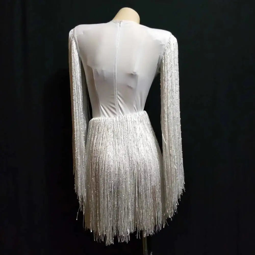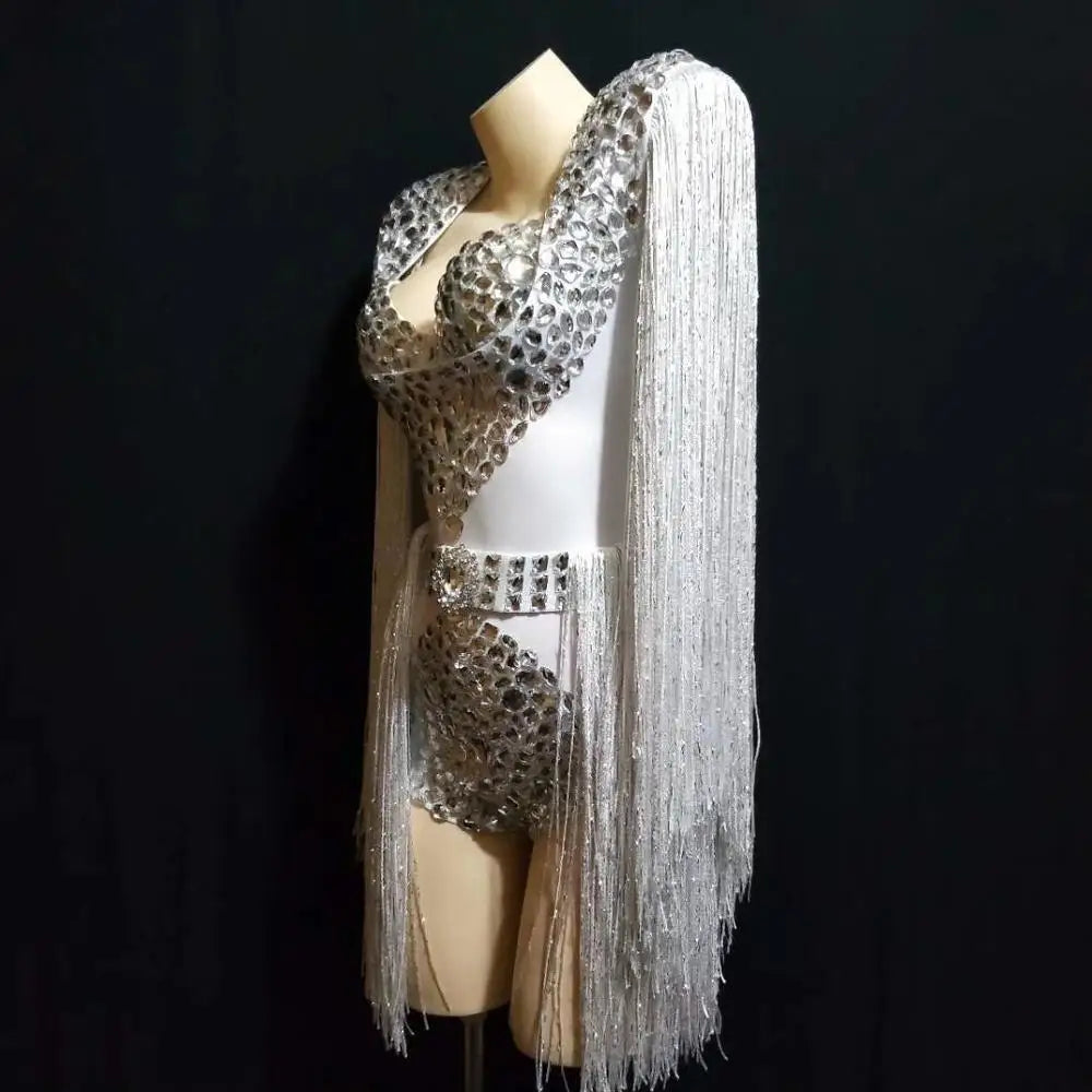 Bling Crystal Rhinestone Stage Performance Bodysuits Nightclub Tassel Jazz Dance Costumes Women Halloween Party Uniform Jumpsuit