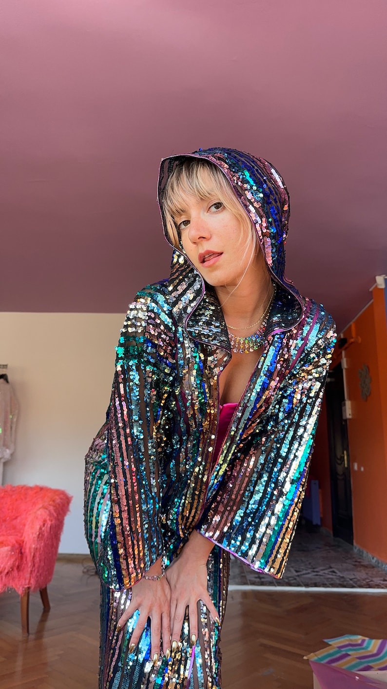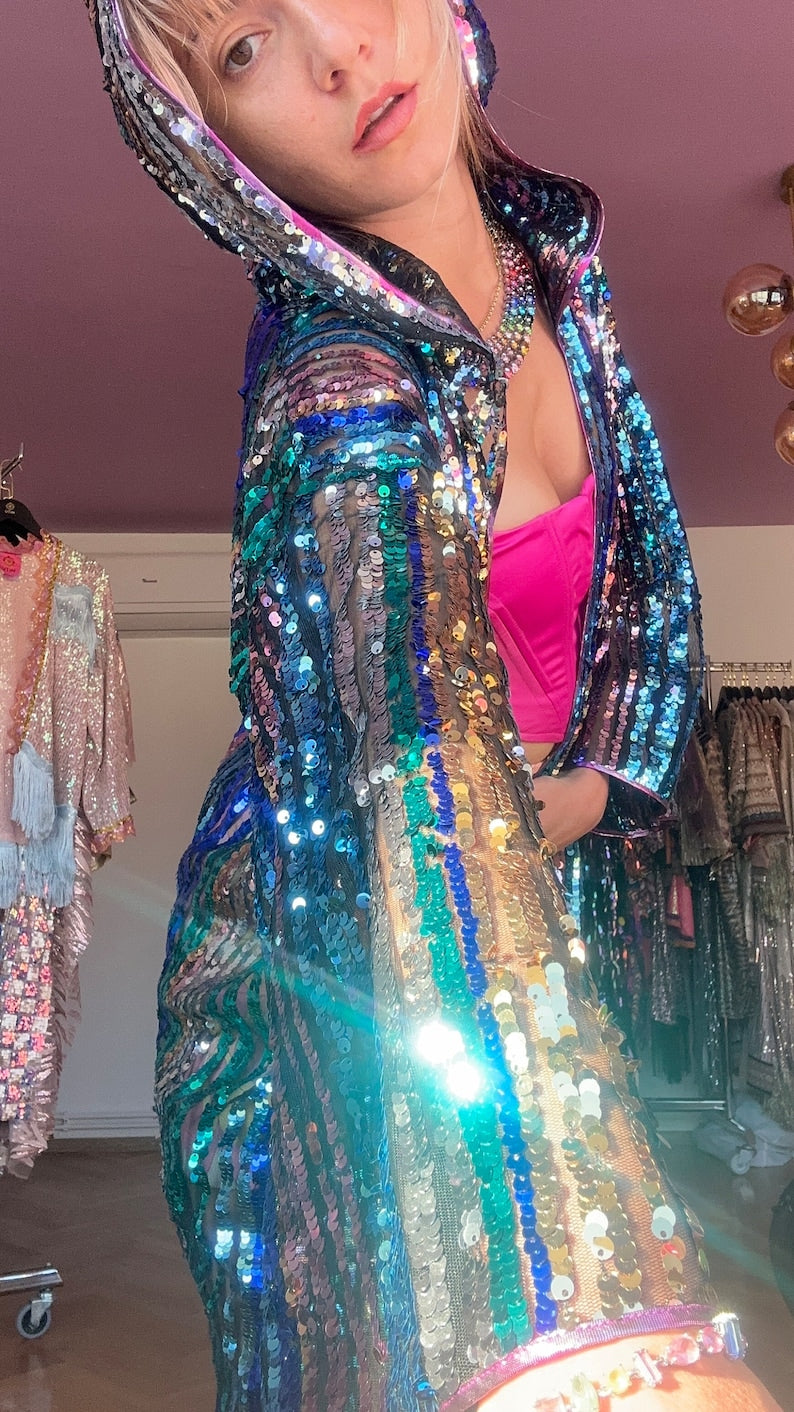 Blue Teal Gold Silver Striped Sequin Robe ! Harry Styles inspired Kimono for Men & Women Colorful Rave Jacket Studio 54 Disco Outfit / Party Costume Check out Photos to see DJ & Singer ‘ Who Made Who ‘ Rocking his UTIN Sequin Cape in a Concert !
