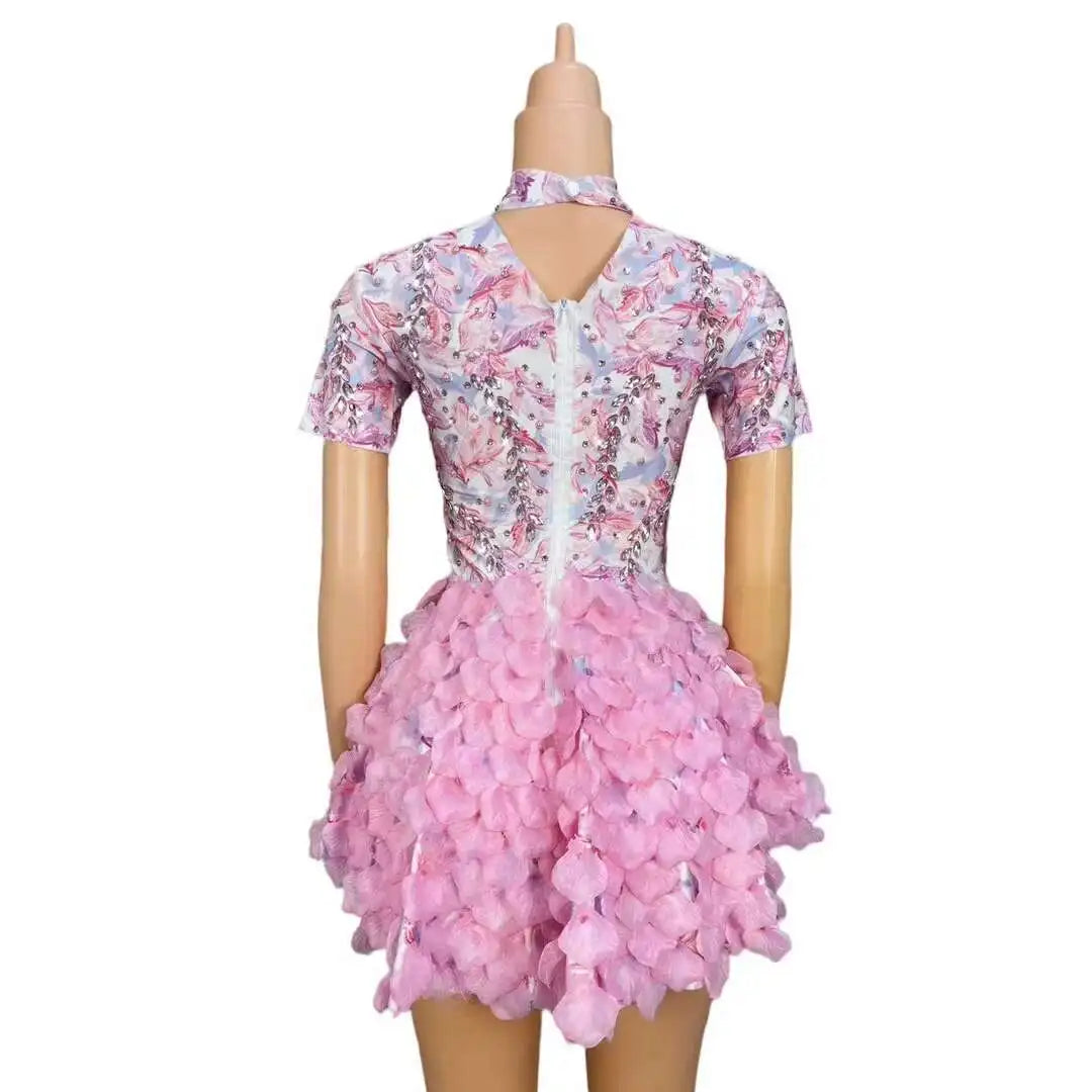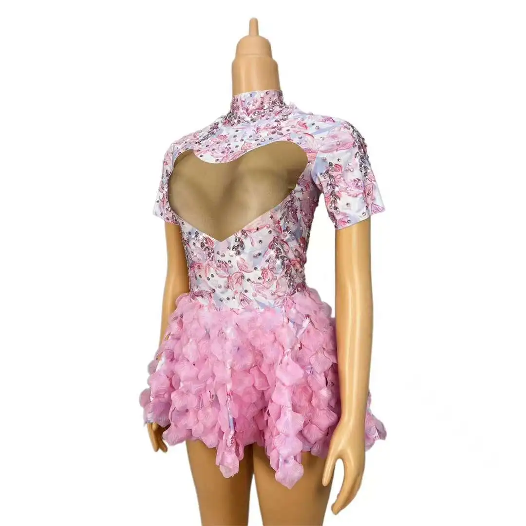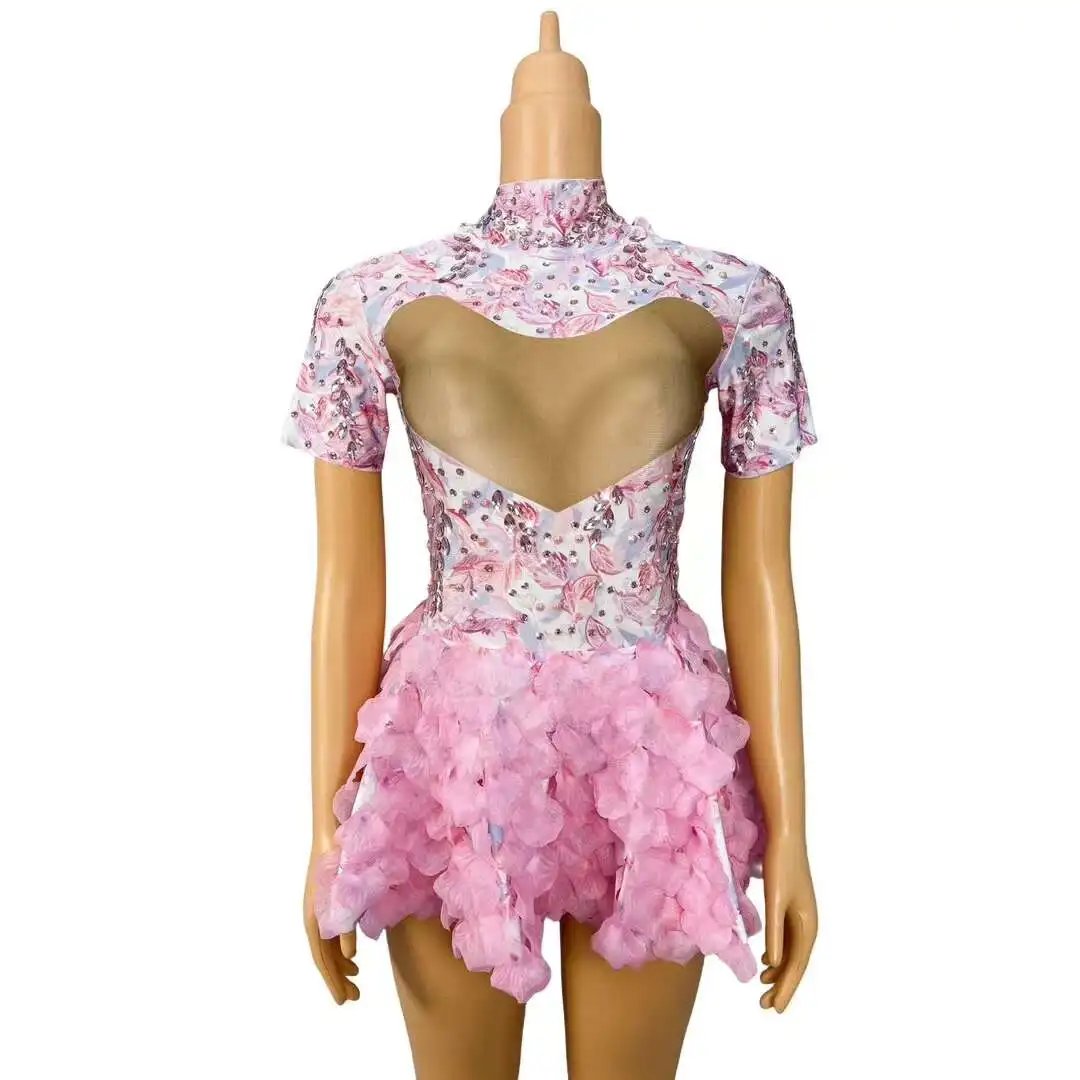 Brand Designed Pink Flower Rhinestones Short Dress Birthday Celebrate Cute Leotard Costume Singer Show Outfit 2024 Huayu