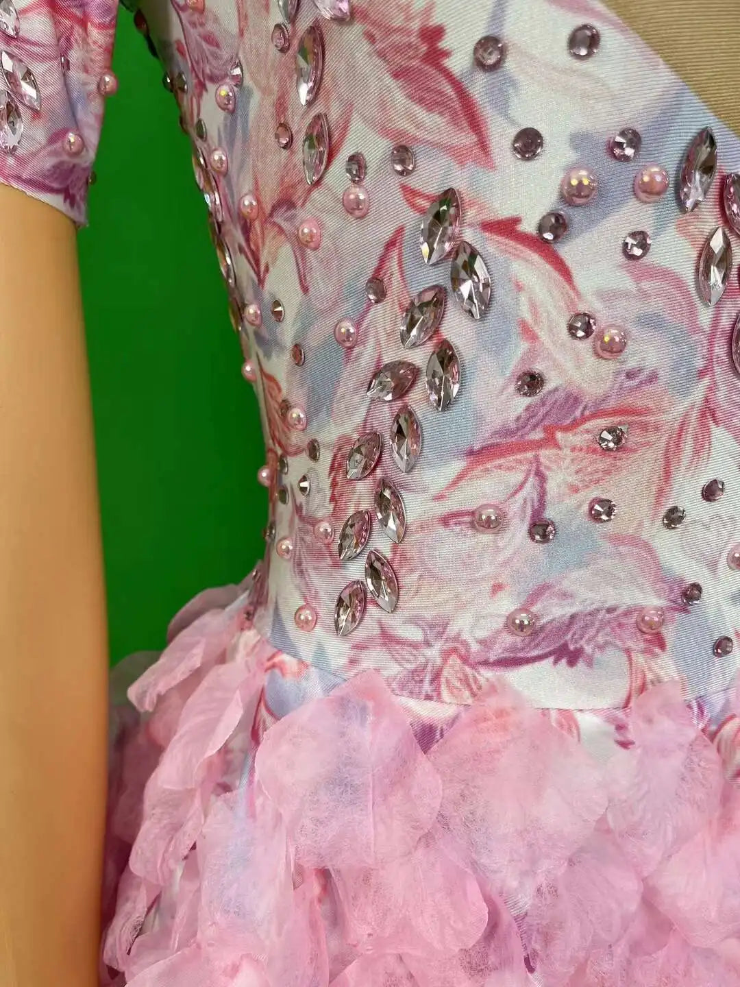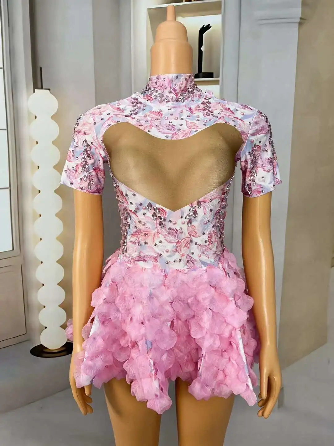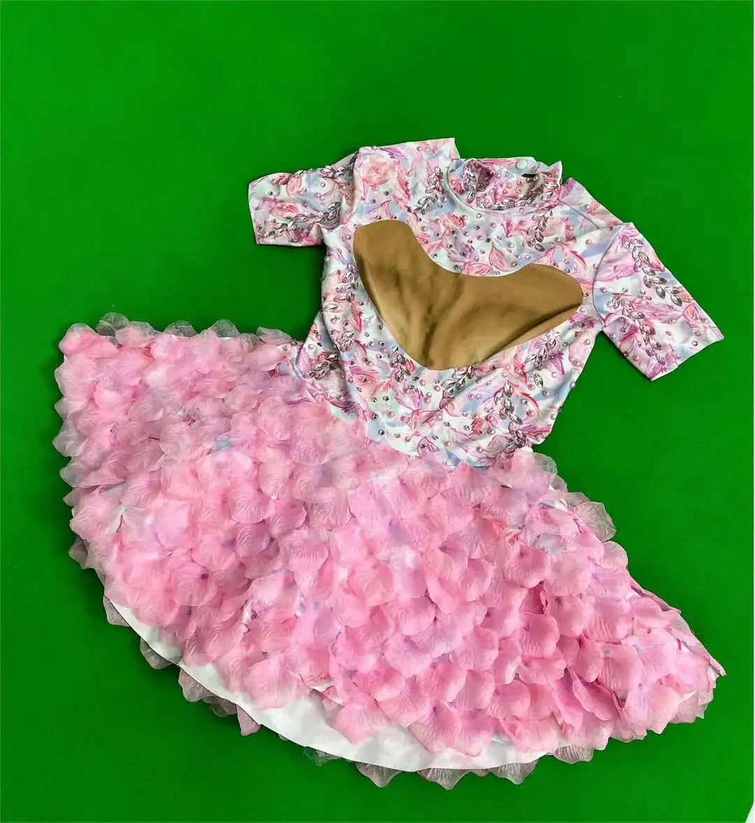 Brand Designed Pink Flower Rhinestones Short Dress Birthday Celebrate Cute Leotard Costume Singer Show Outfit 2024 Huayu