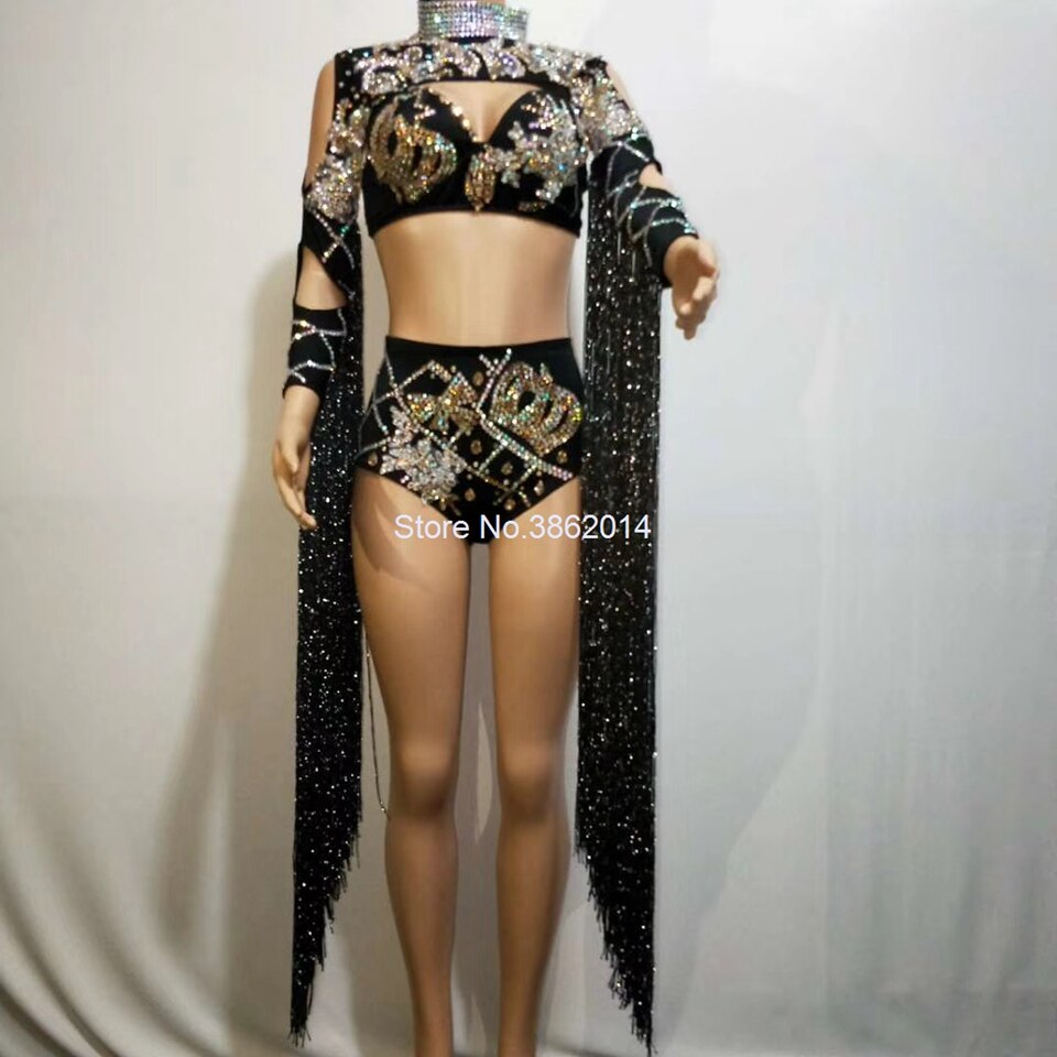 Bright Black Tassel Rhinestones Bodysuit Sexy Luxury Leotard Performance Outfit Women Party Jumpsuit Singer Dance Stage Clothing