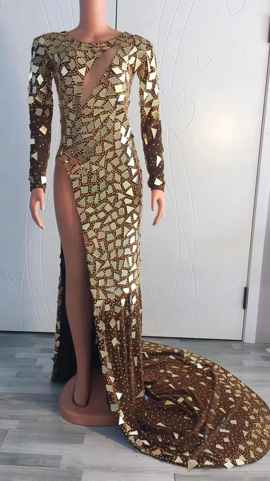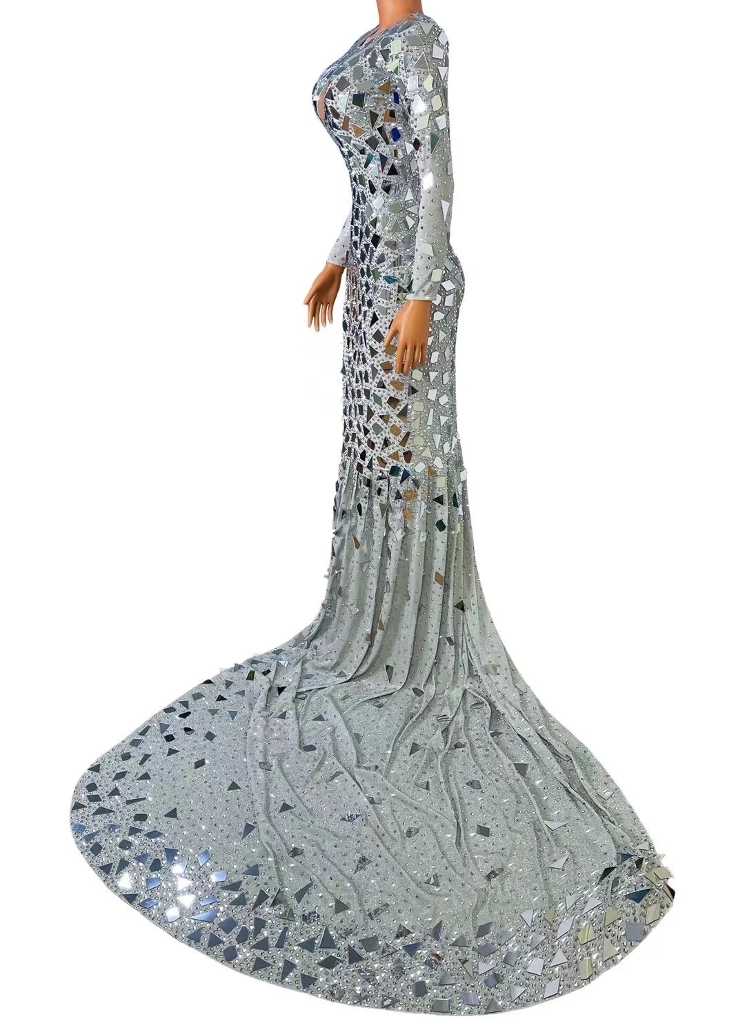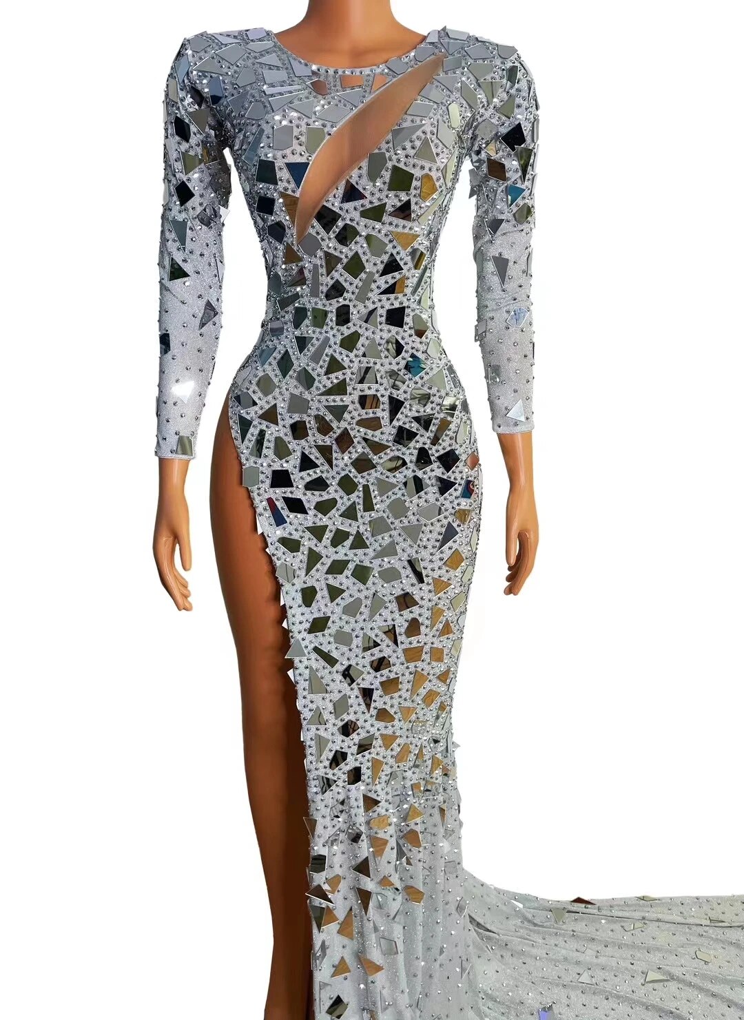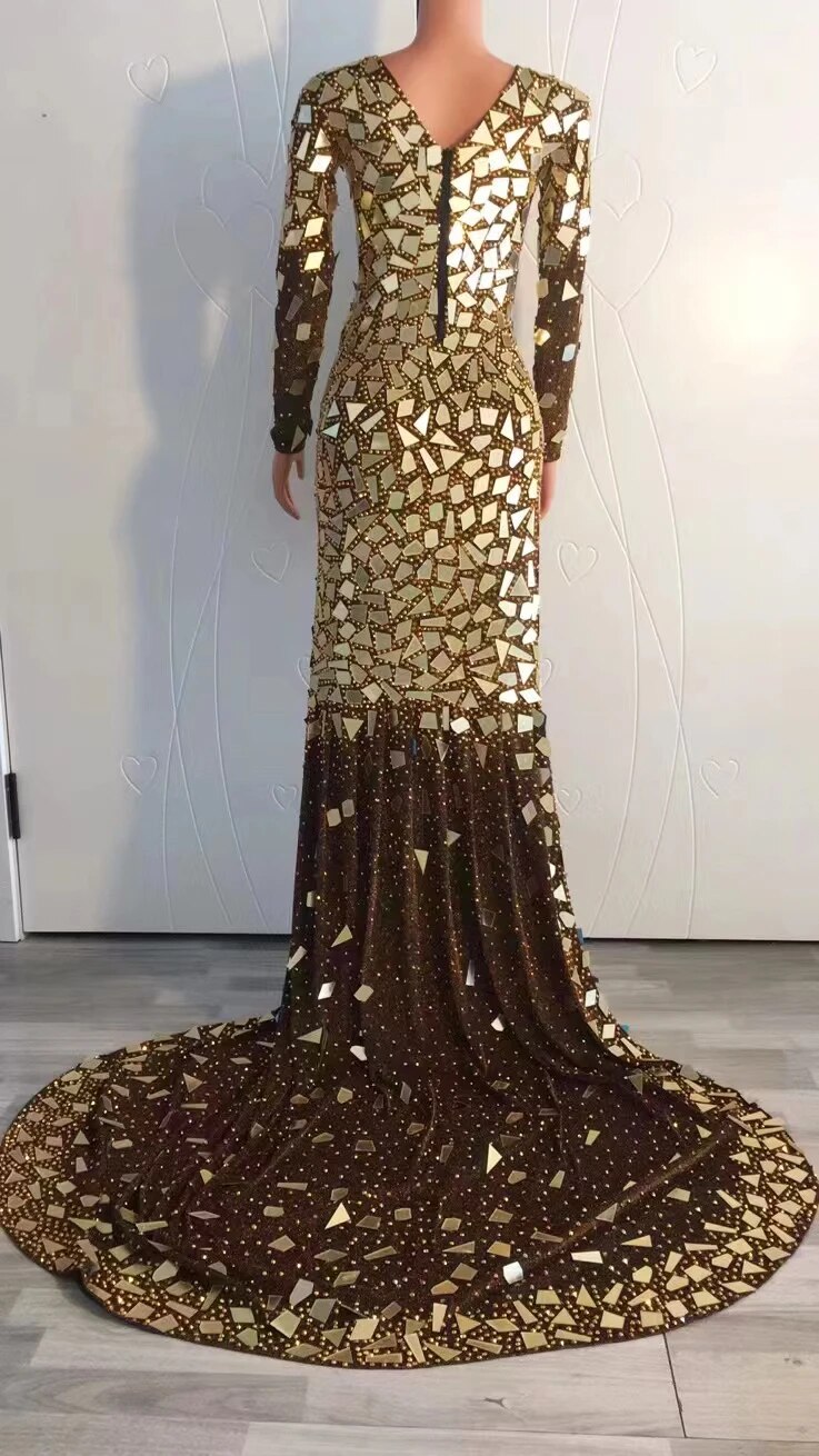 Car Model Catwalk Female Host Guest DressSkirt Perspective Sexy One-Piece LongMulti-Color Mirror Sequins Costumes