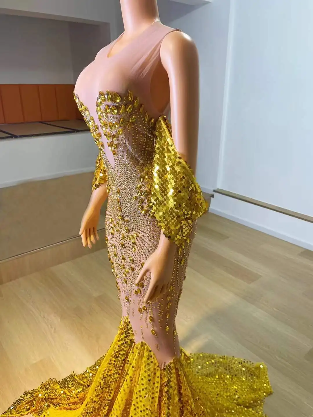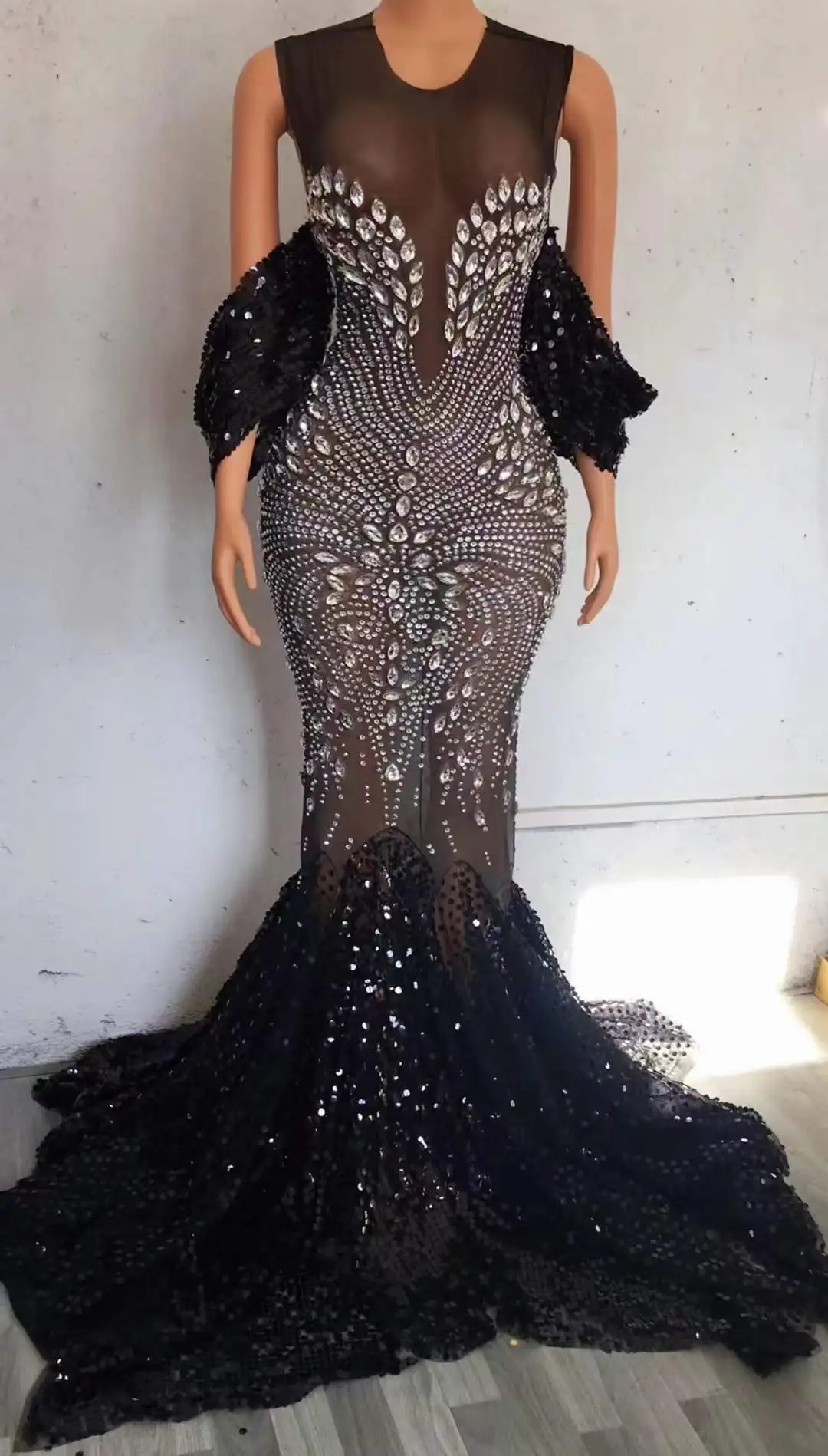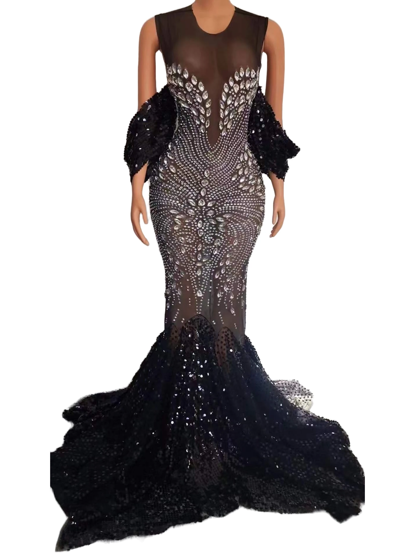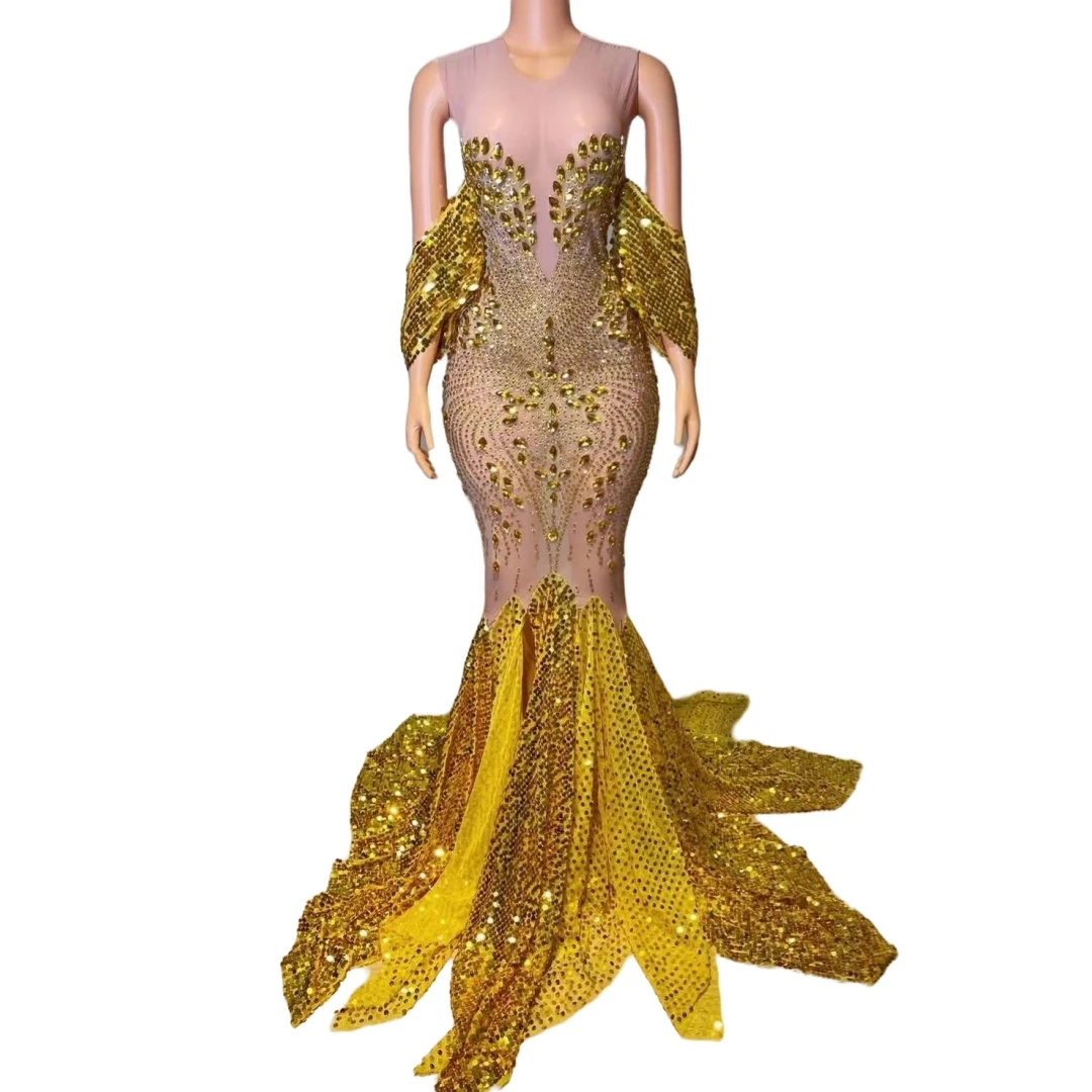 Celebrity Sparkly Floor Length Gold Black Luxury Rhinestone Elegant Evening Dress Women Club Night Birthday Drag Queen Costume