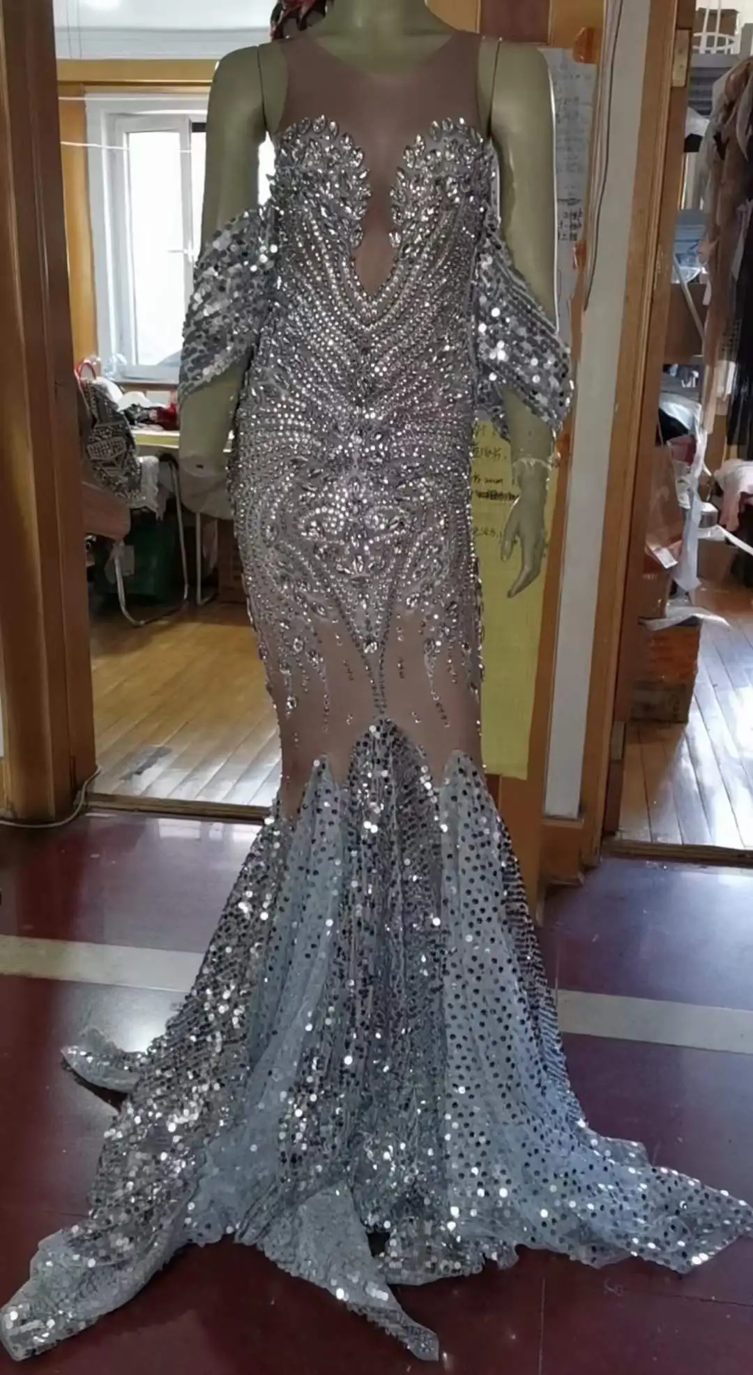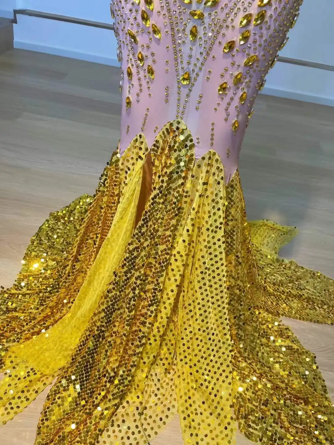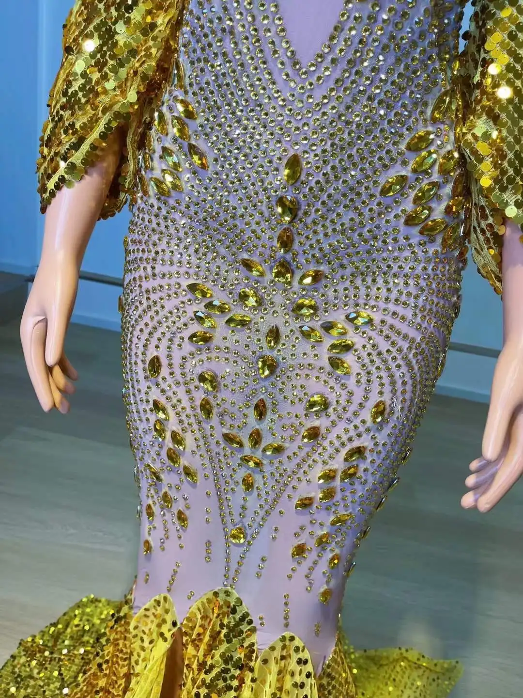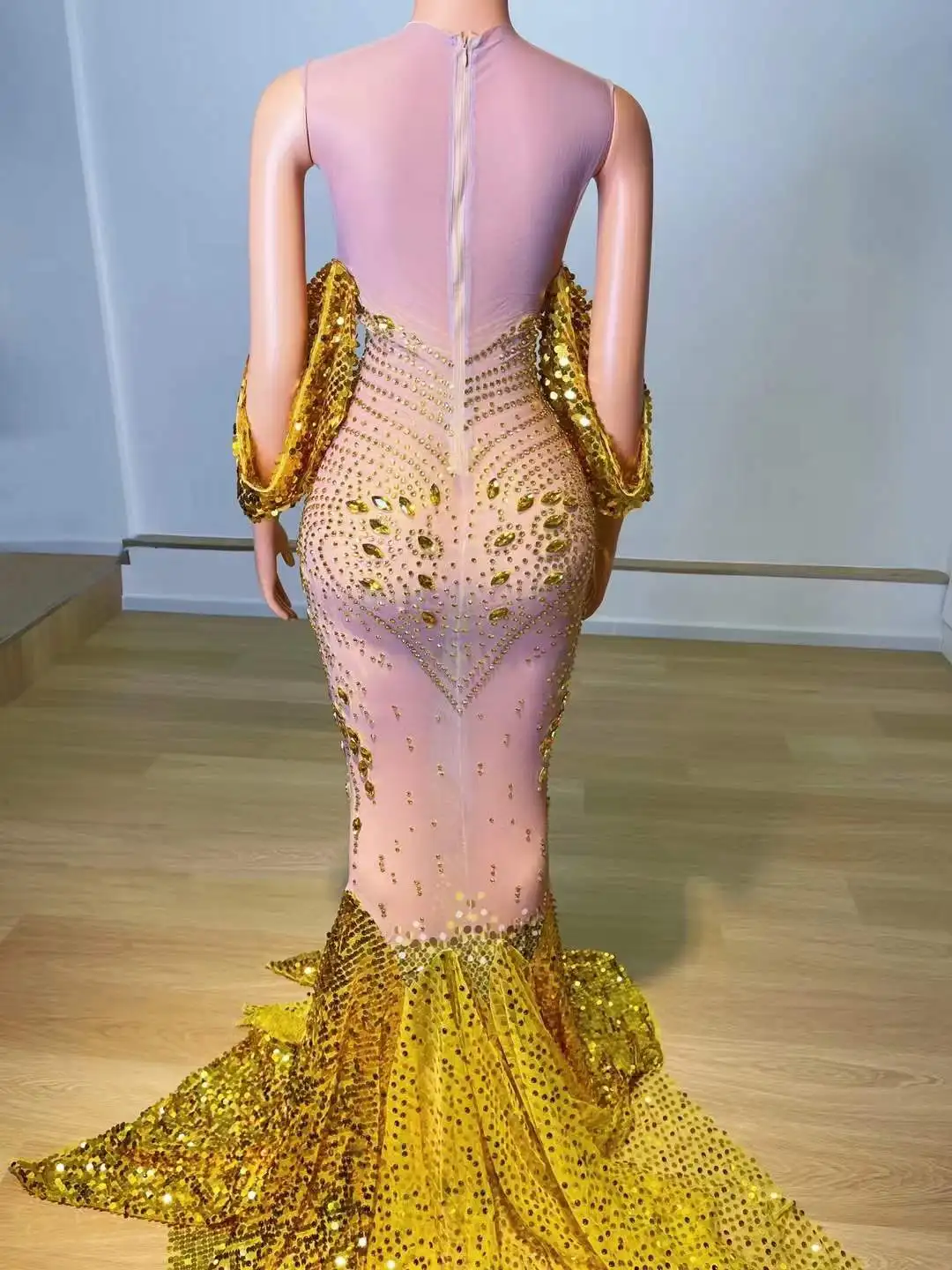 Celebrity Sparkly Floor Length Gold Black Luxury Rhinestone Elegant Evening Dress Women Club Night Birthday Drag Queen Costume