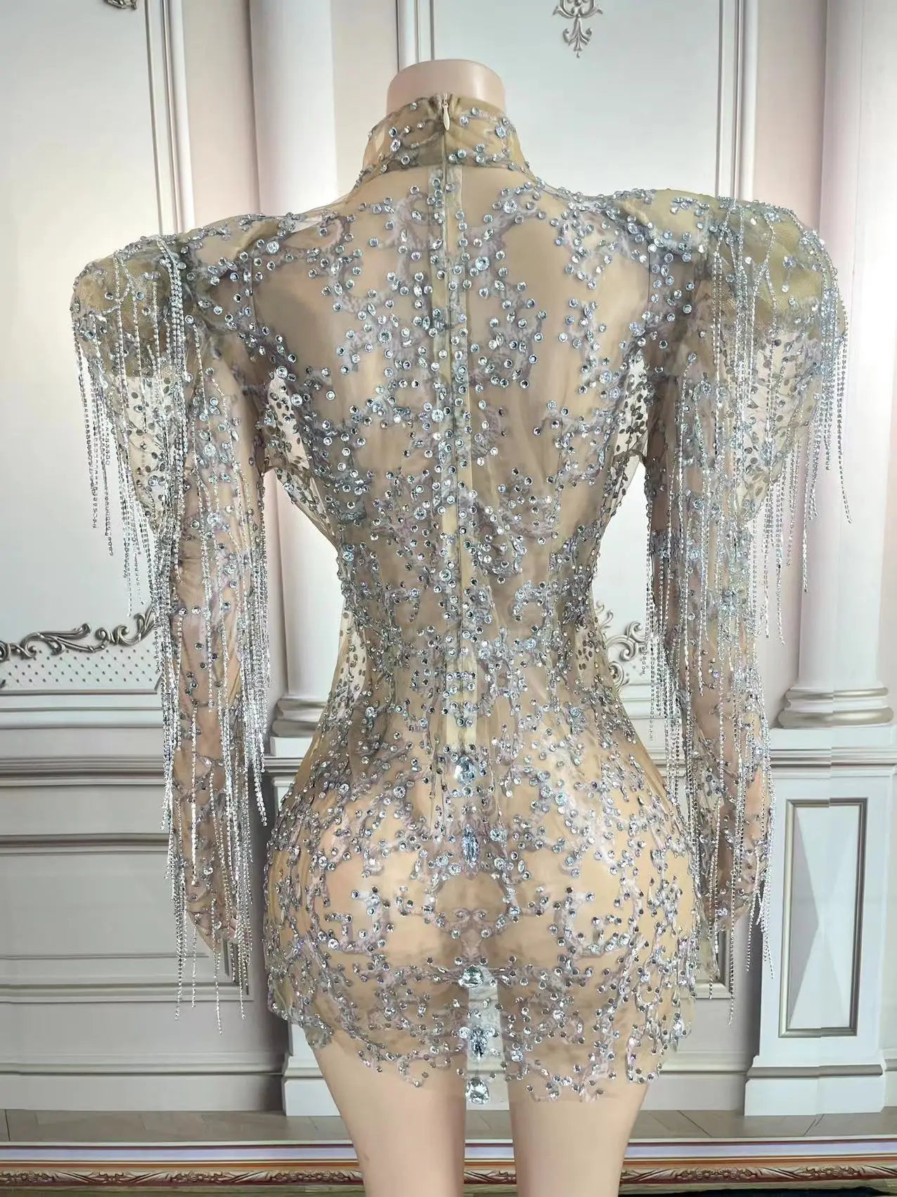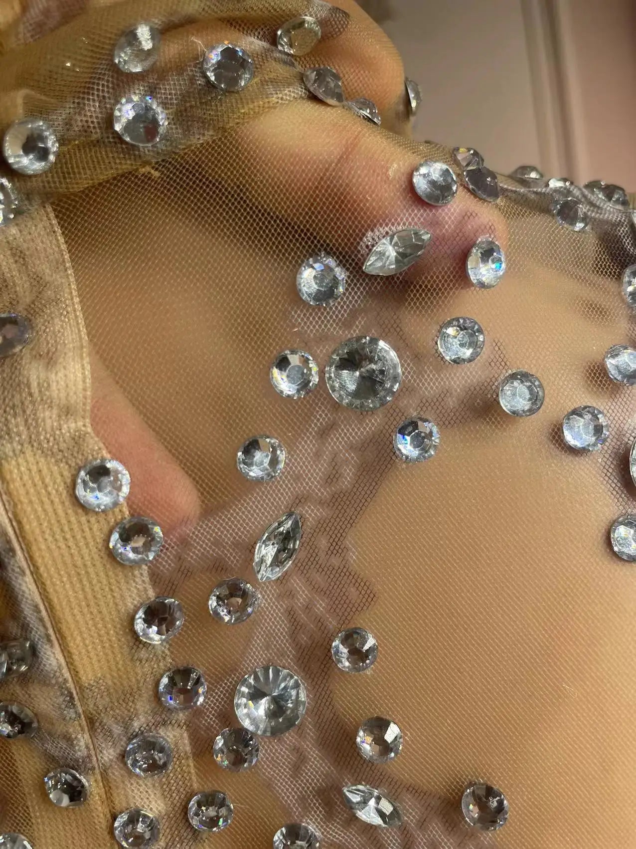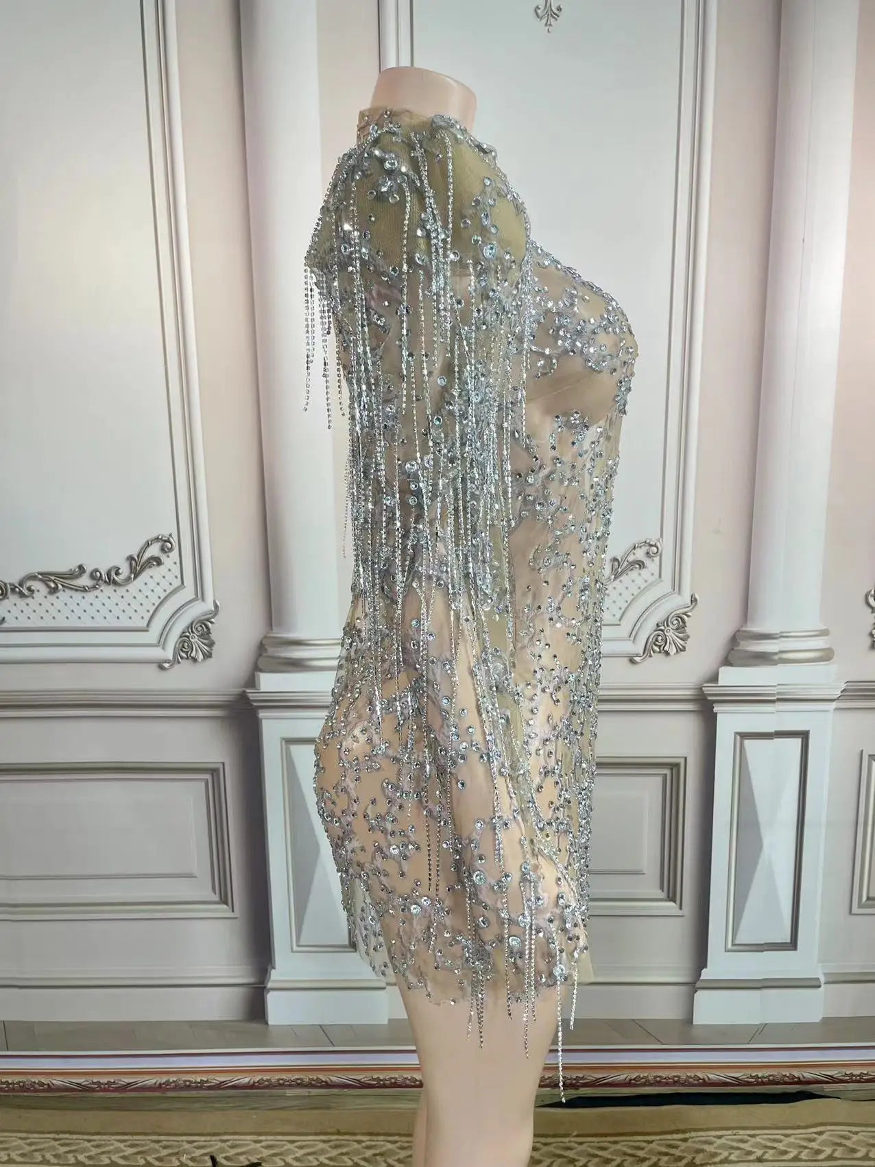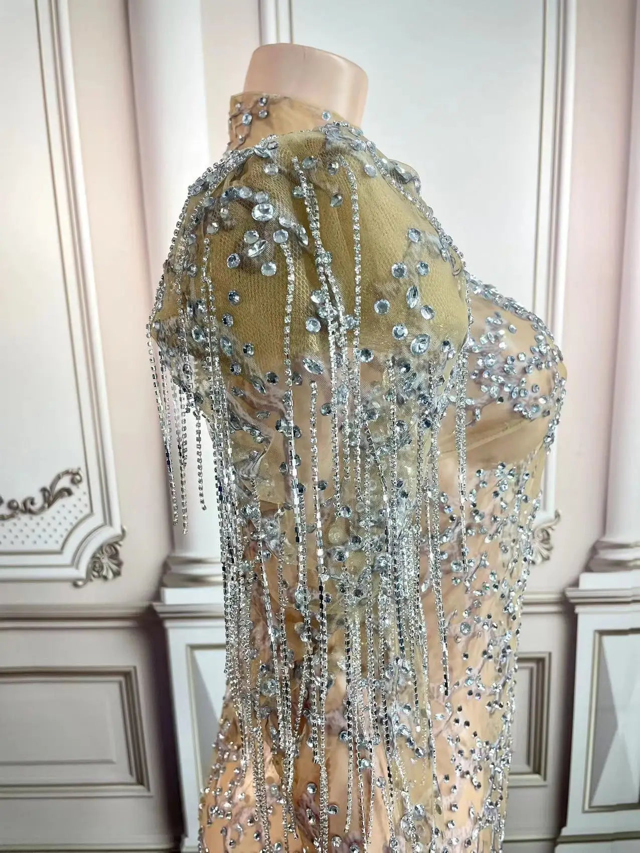 Turn heads in this stunning club costume featuring transparent fabric and dazzling rhinestones. With big sleeves and a chic skirt design, this outfit is perfect for stage performances, evening celebrations, and birthday parties. Ideal for dancers and hosts, this outfit combines elegance and allure, ensuring you shine bright and celebrate in style!