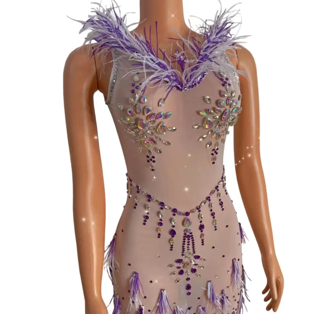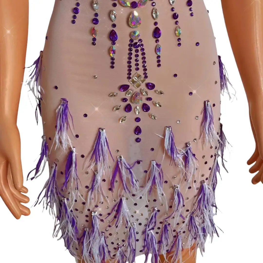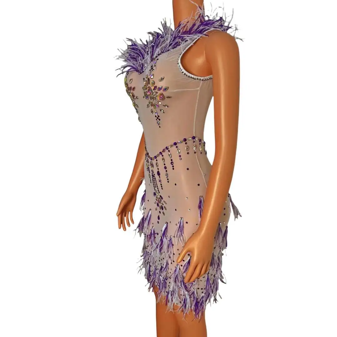 Colored Diamond Ddress Sexy Sleeveless Feather Mesh Perspective Tight Fitting Short Skirt Banquet Performance Clothing Tizi