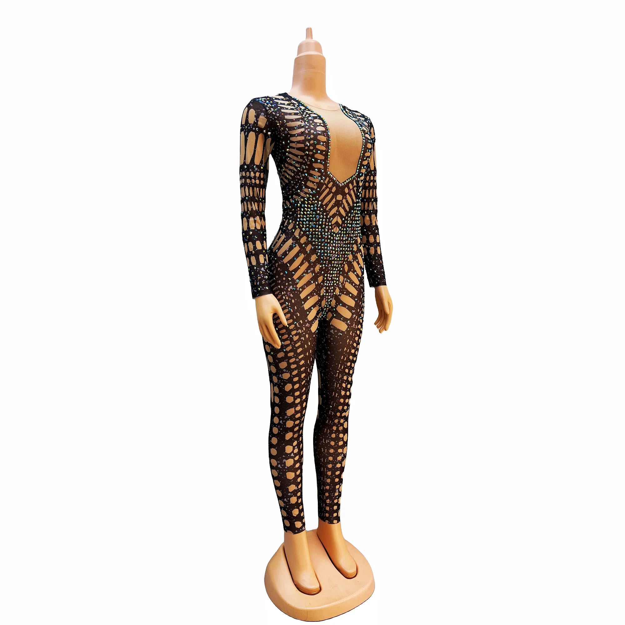 Colorful AB Rhinestones Sexy Transparent Black Jumpsuit Dance Stretch Leggings Bodysuit Evening Celebrate Costume