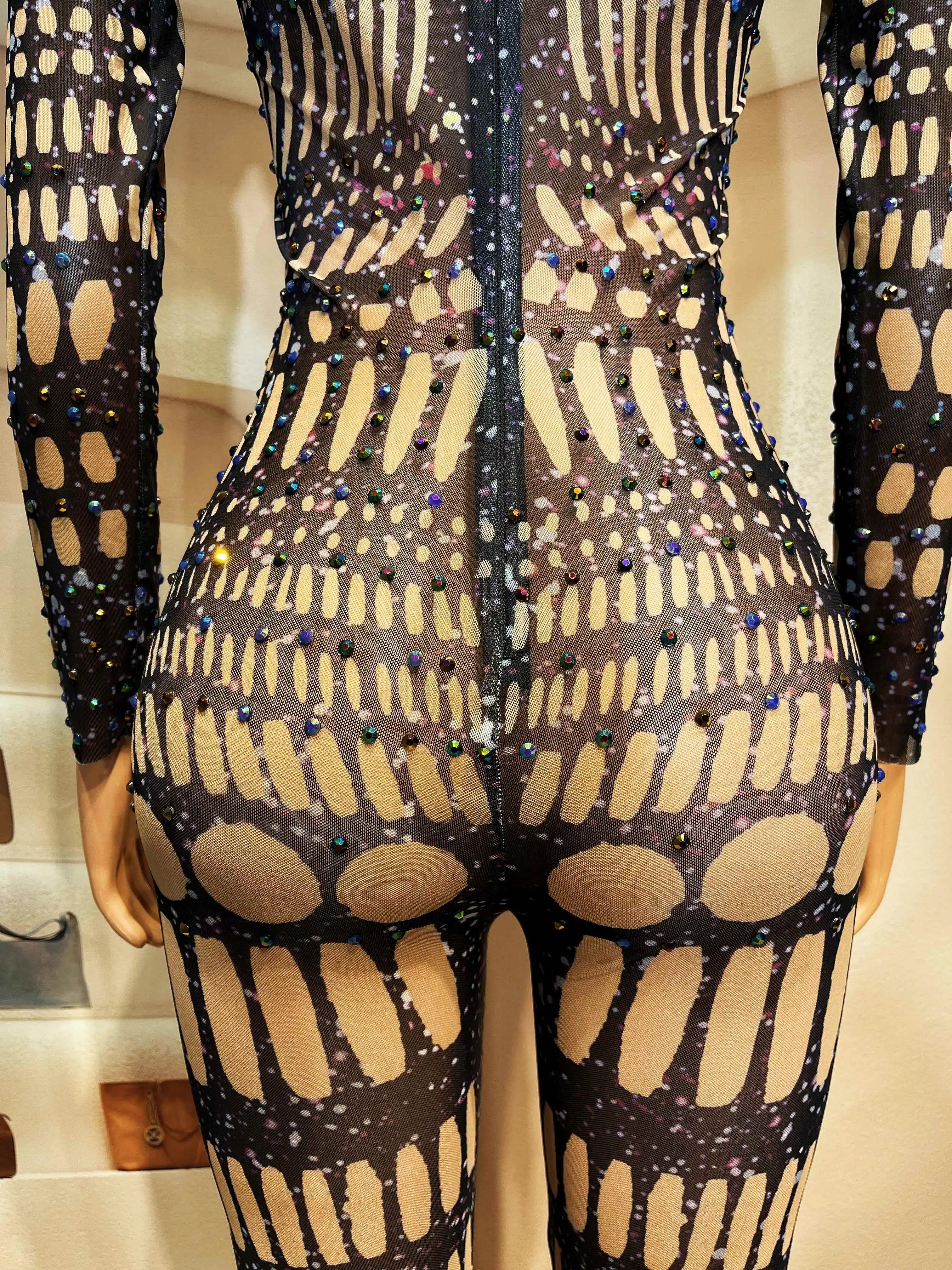 Shine and Stand Out in this Colorful AB Rhinestones Transparent Black Jumpsuit. Perfect for dancing, this stretch leggings bodysuit is a sexy and eye-catching costume for evening celebrations.