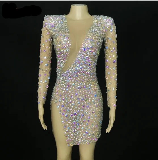 This stunning mesh dress is adorned with colorful crystals, pearls, and multicolored rhinestones, creating a glamorous and eye-catching outfit. The addition of feather sleeves adds a unique and elegant touch, making it a perfect choice for prom, evening events, birthdays, or any occasion where you want to stand out in a sexy and stylish costume.
