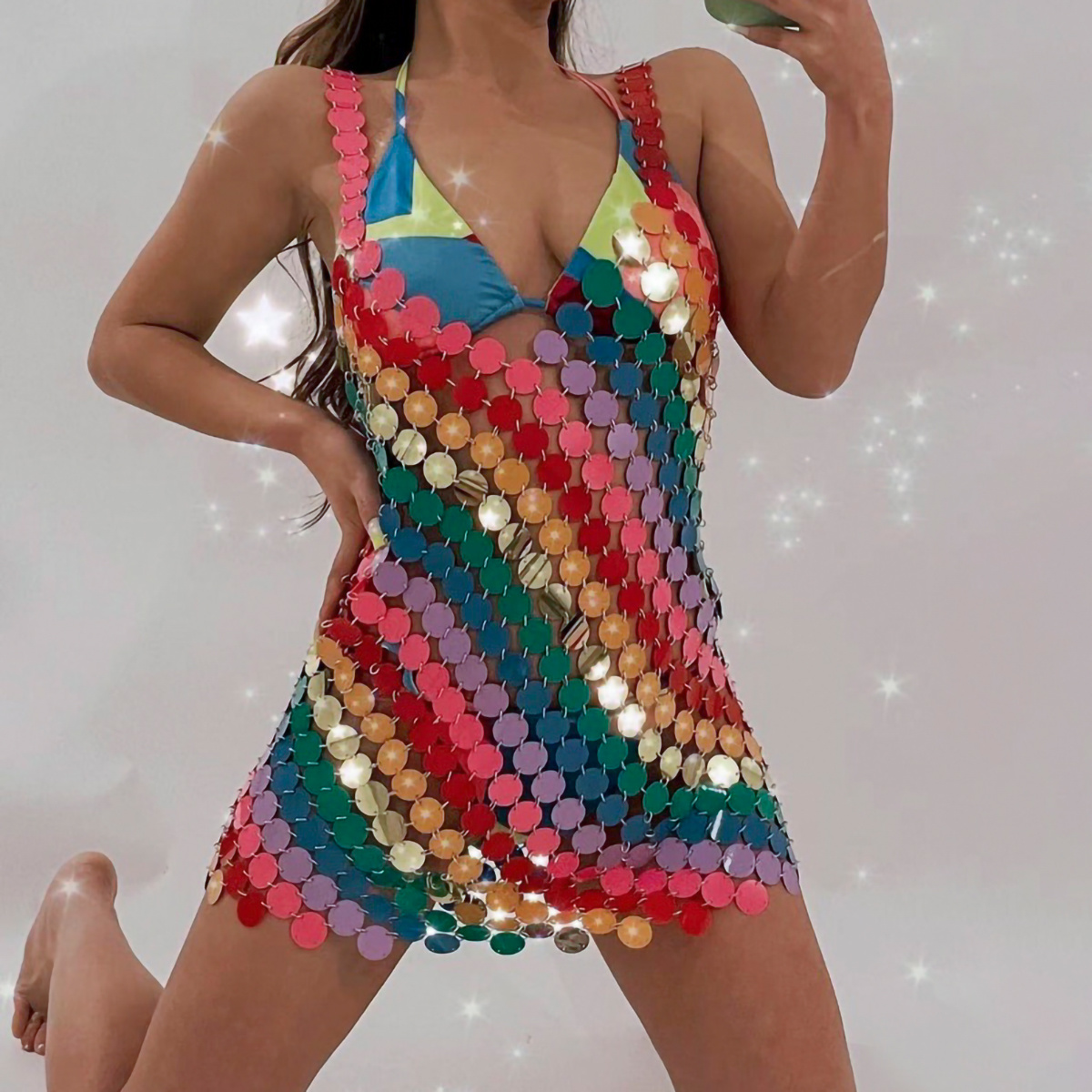 Colorful Rainbow Sexy Summer Beach Bikini Dress Women Round Sequins Harness Bra Chest Neck Body Chain Body Jewelry