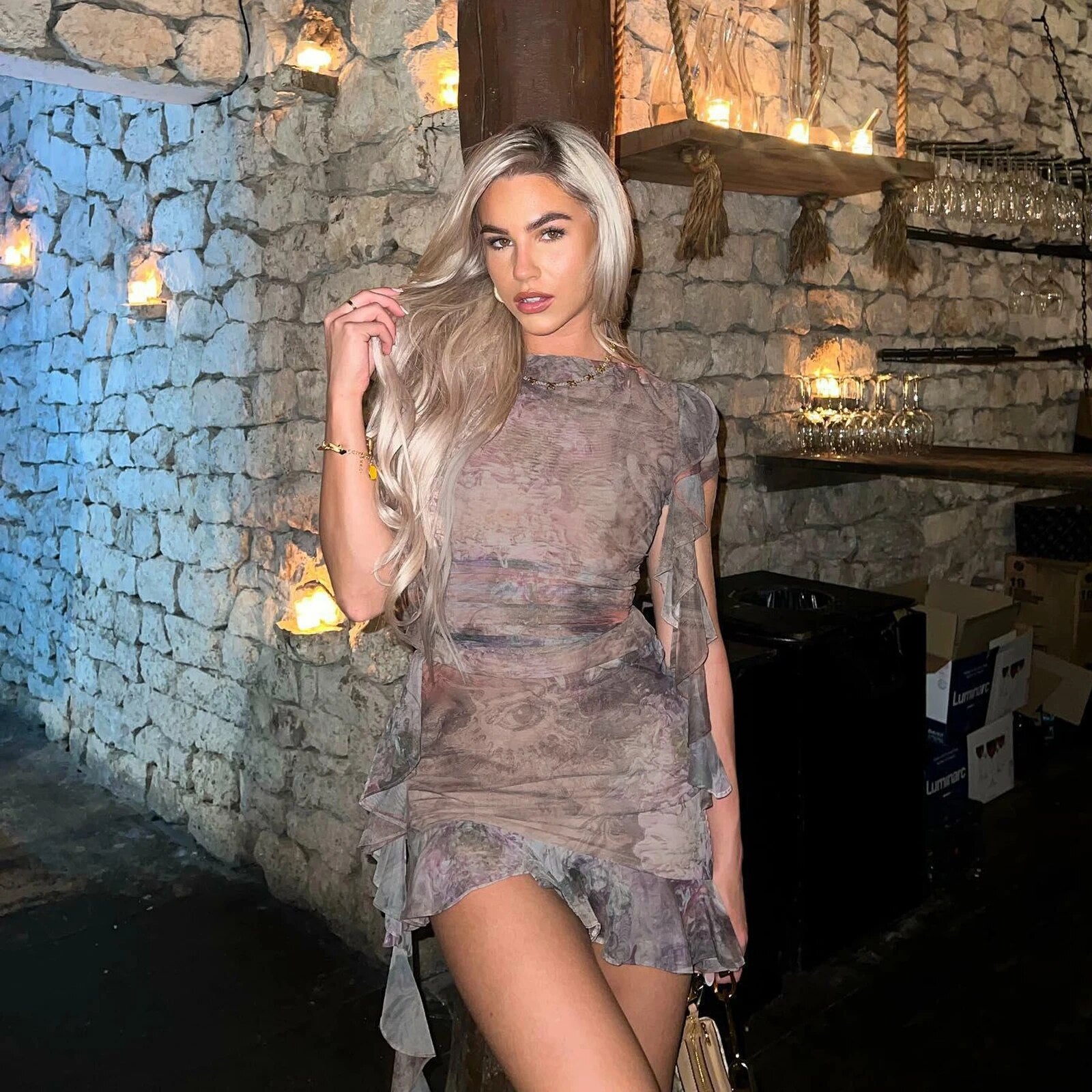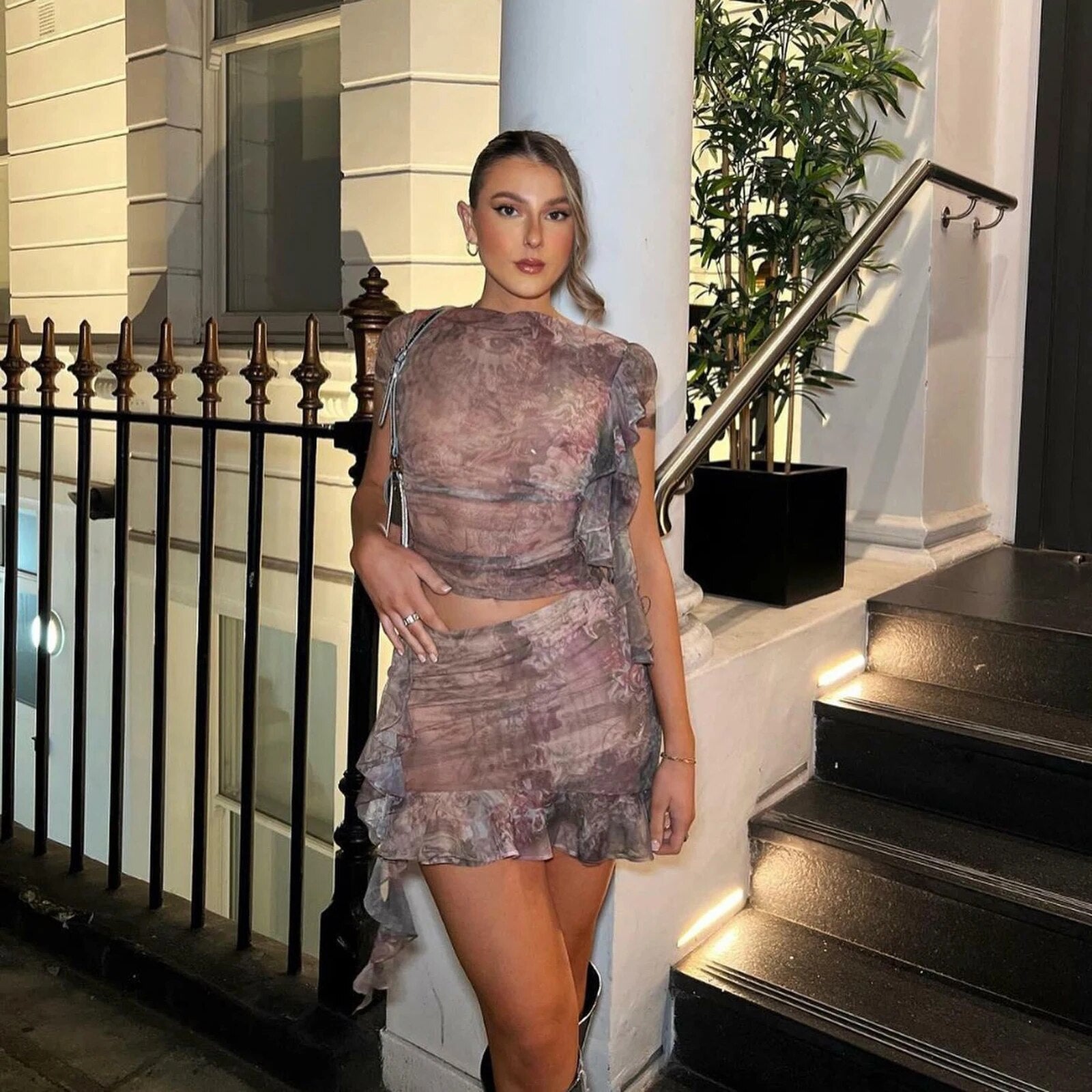 Women Summer 2 Pieces y2k Outfits Print Short Sleeve Mesh T-Shirts Crop Tops Ruffles Wrapped Hip Short Skirts Set