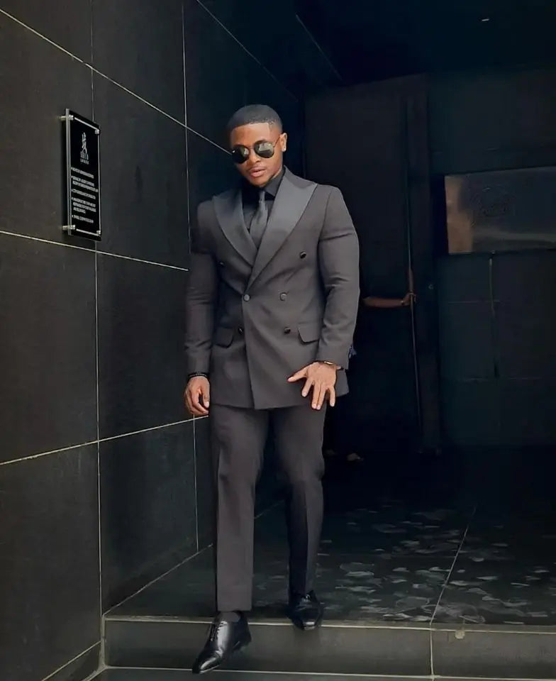 This sleek black tuxedo for men features a slim fit design with a double-breasted peaked lapel jacket and matching pants. Ideal for groom wear, this 2-piece ensemble exudes sophistication and style, making it a perfect choice for formal occasions