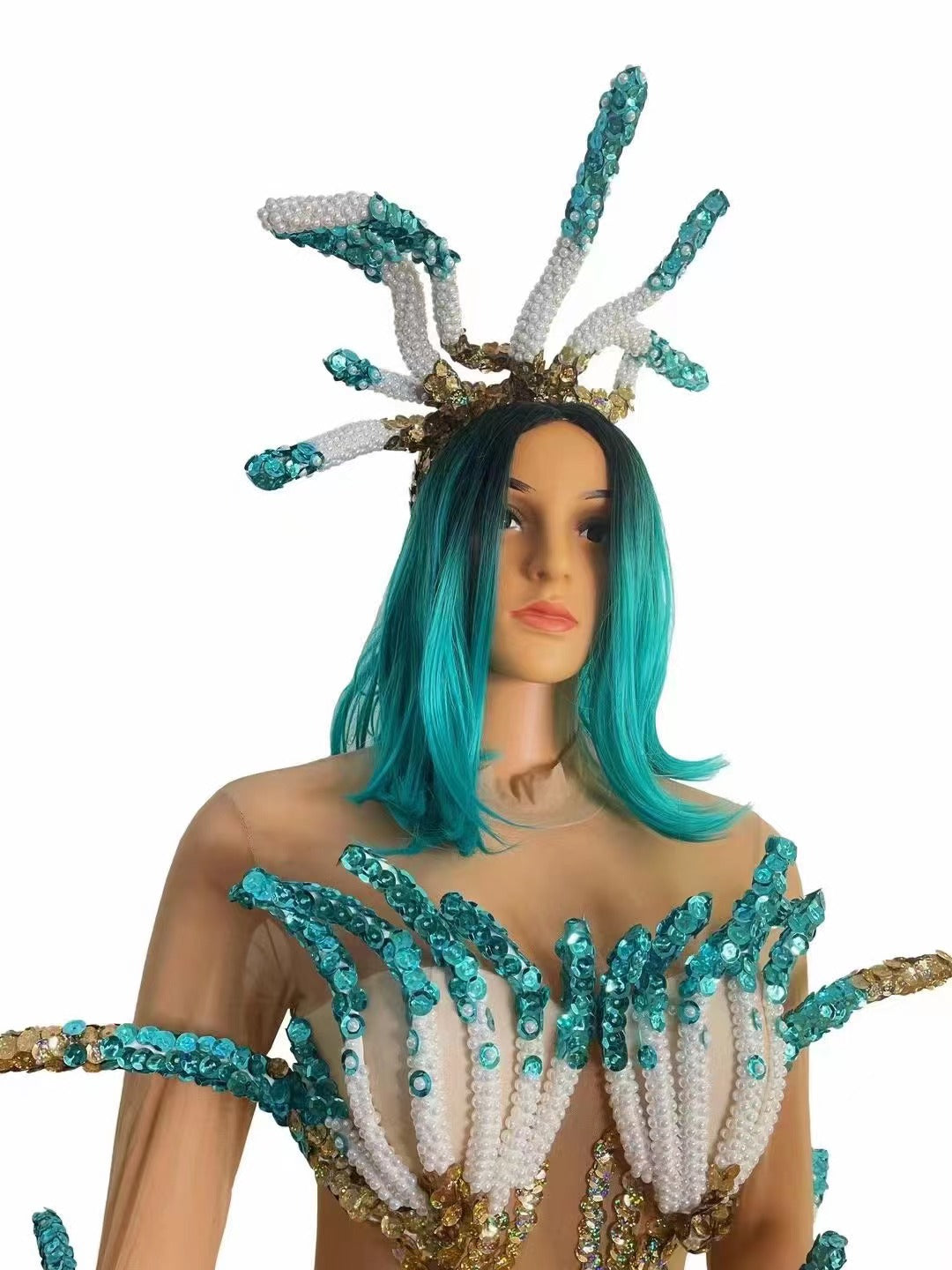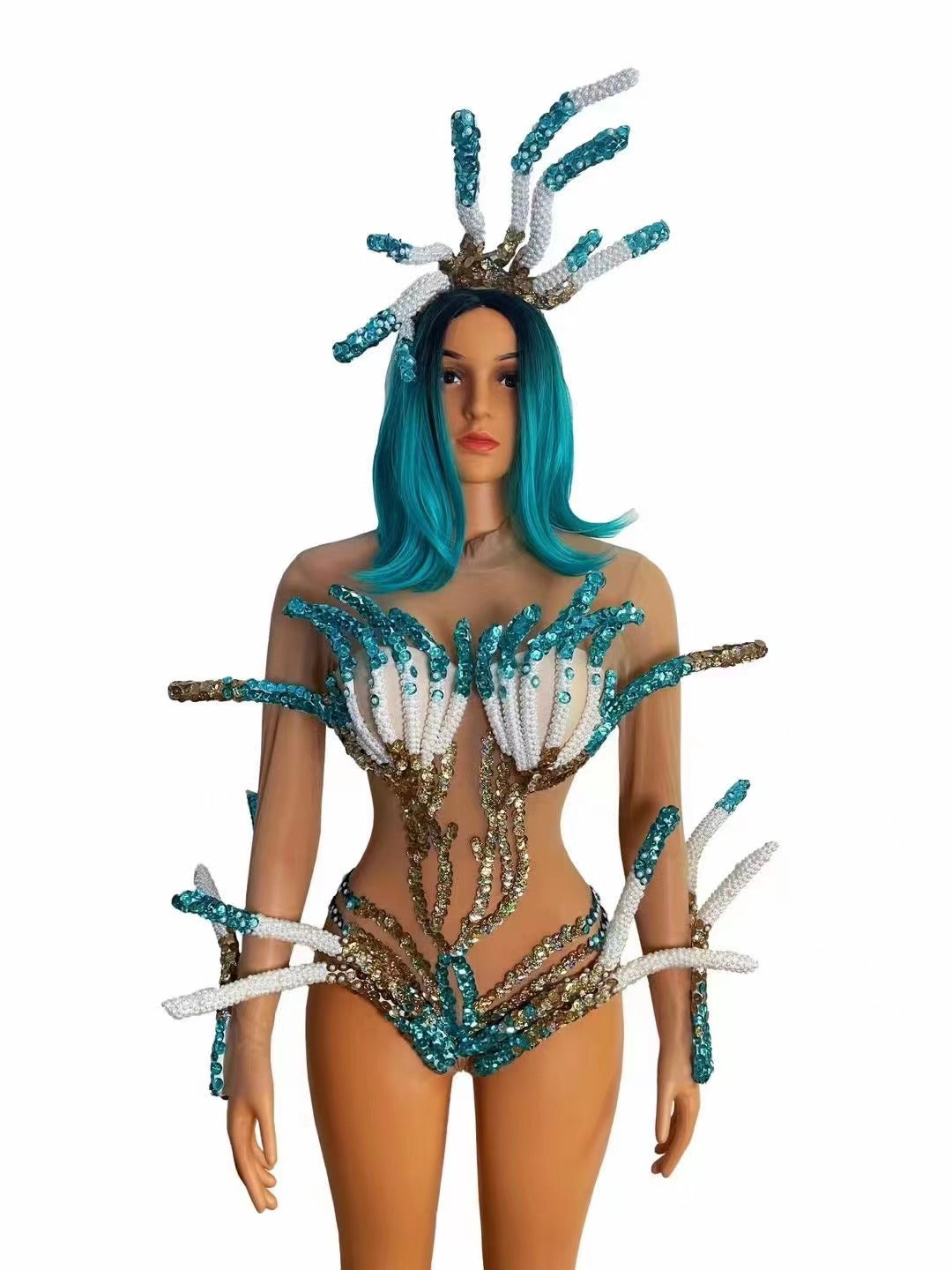 Note: This coral conjoined includes a headdress, but does not include a wig.