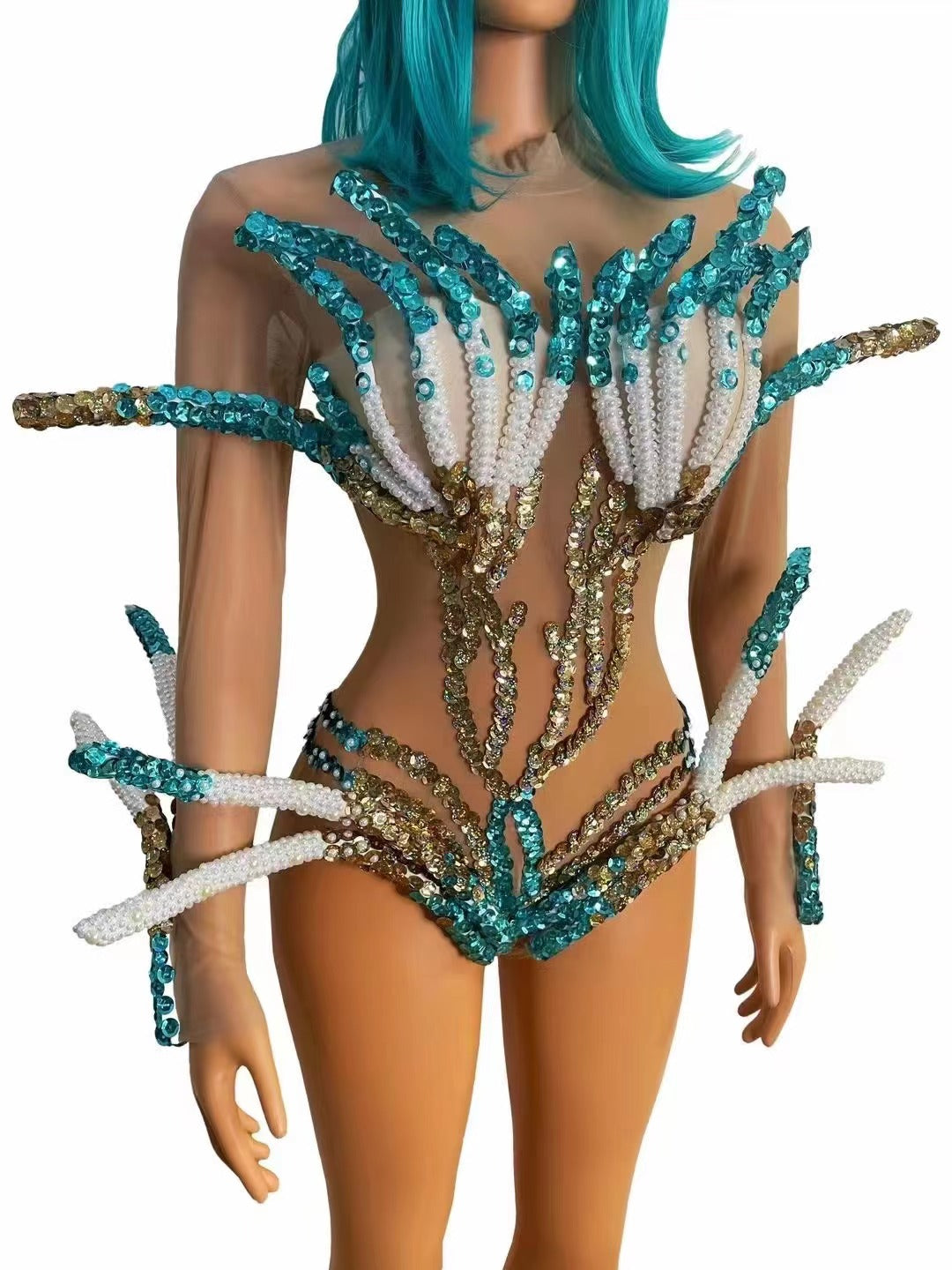 Coral Full Diamond Explosion Sparkling Pearl Perspective Mesh Sexy Jumpsuit Headwear Party Electric Syllable Performance Dress