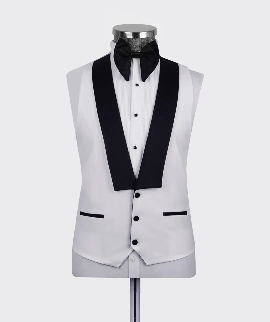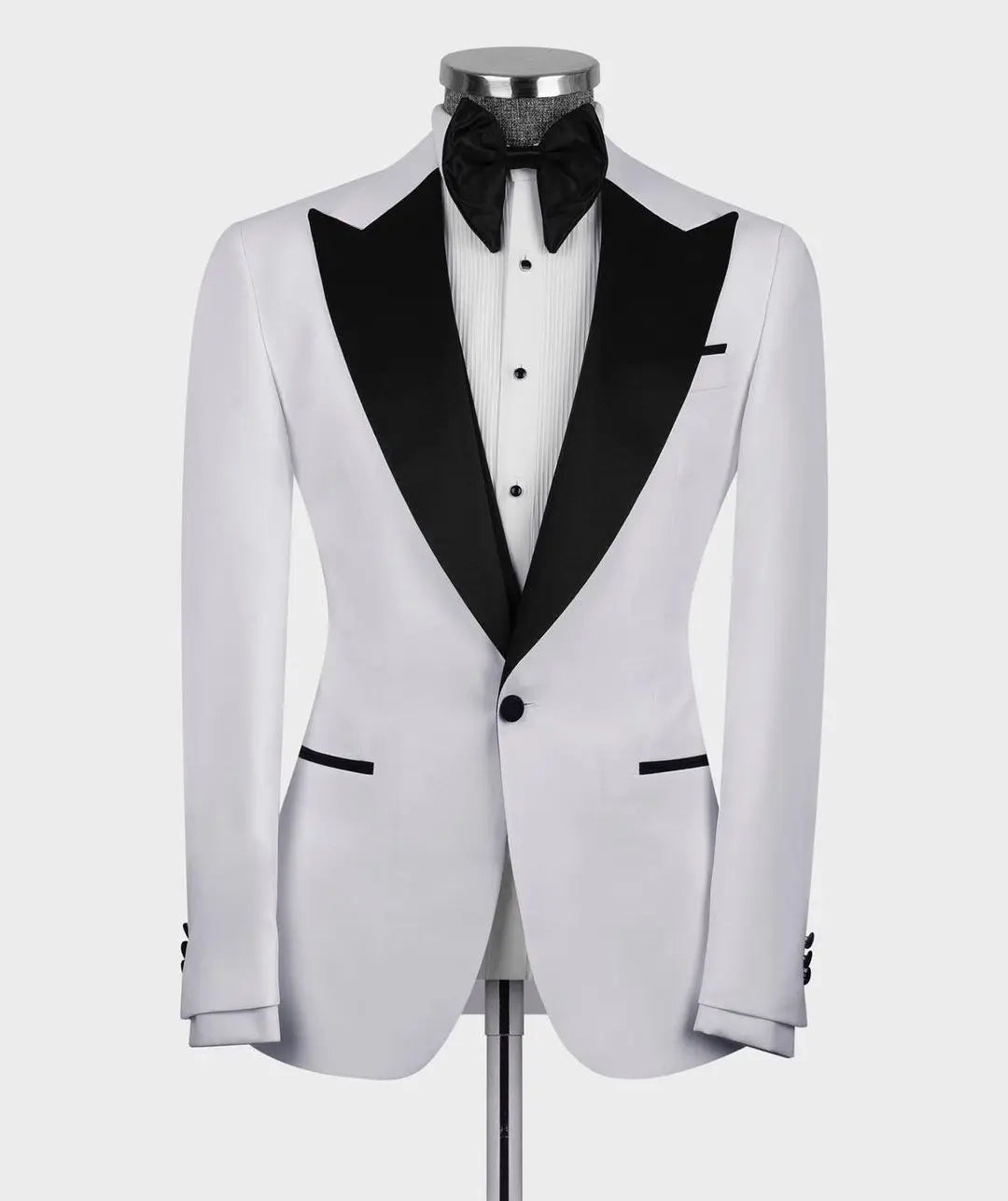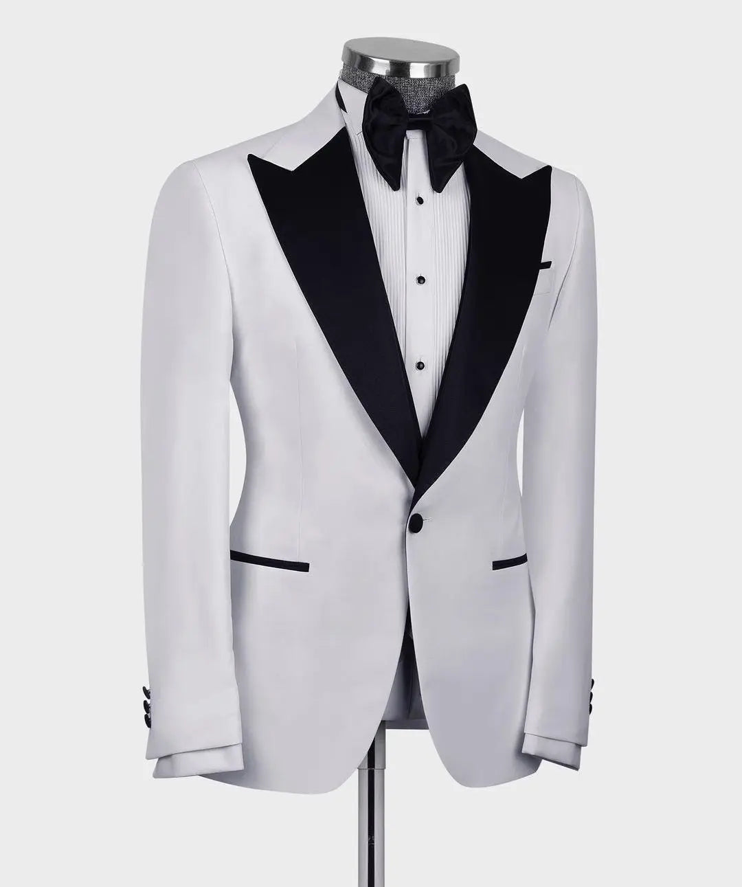 ??Elevate your formal attire with this custom-made white men's suit set. The set includes a sleek blazer and vest with a sophisticated one-button design and peaked black lapel. Perfect for formal parties, weddings, and groomsmen attire, this tailored suit is available in plus sizes for a comfortable and stylish fit.
