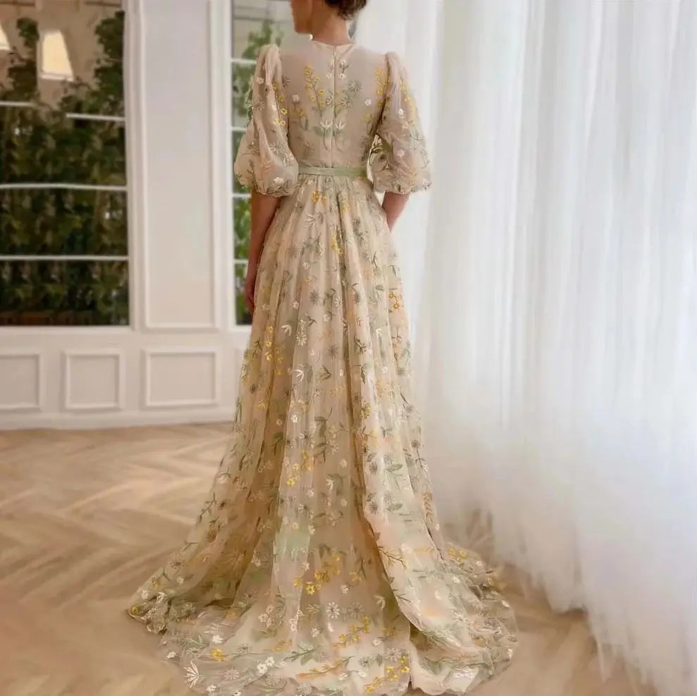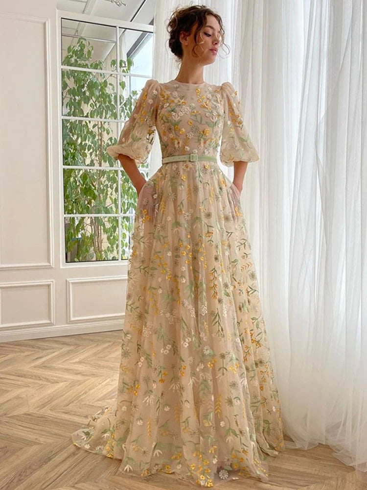 Customized O-Neck Embroidered Flowers Prom Dresses with Puff Half Sleeve Floral Long Evening Dress with Belt for Graduation