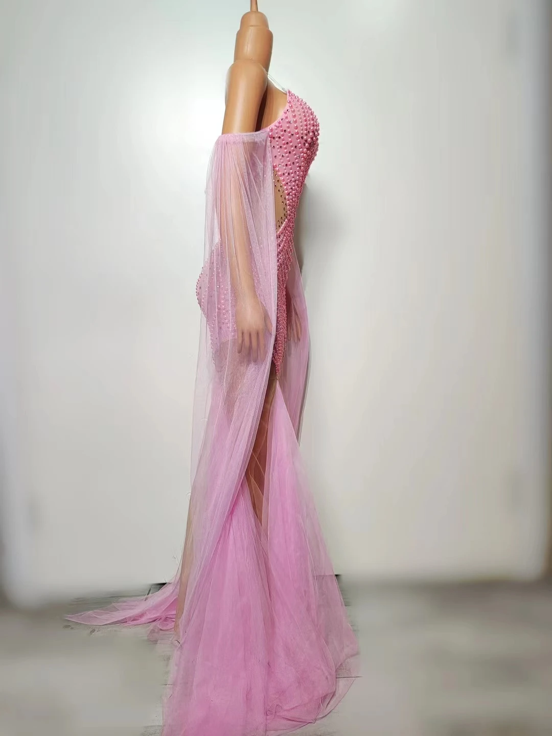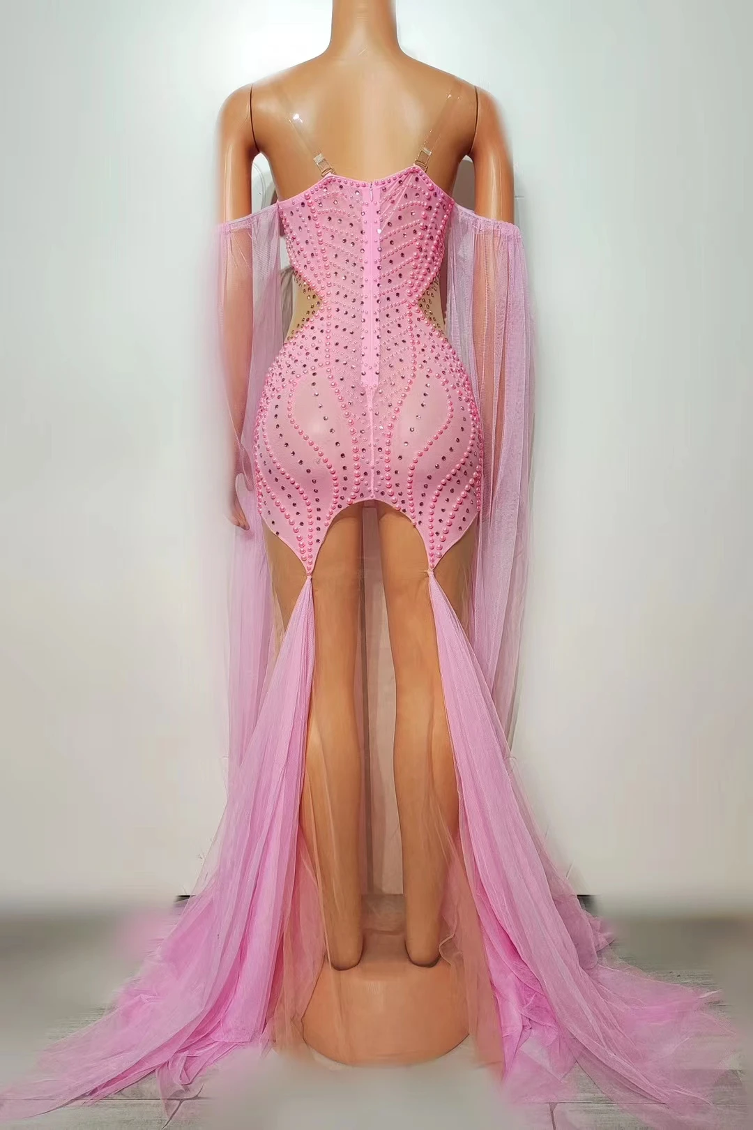 Cute Sweet Candy Mesh Pink Pearl Diamond Dress with Long Sleeve Piercing Birthday Party Dresses Photo Shoot Gowns Mianhuatang