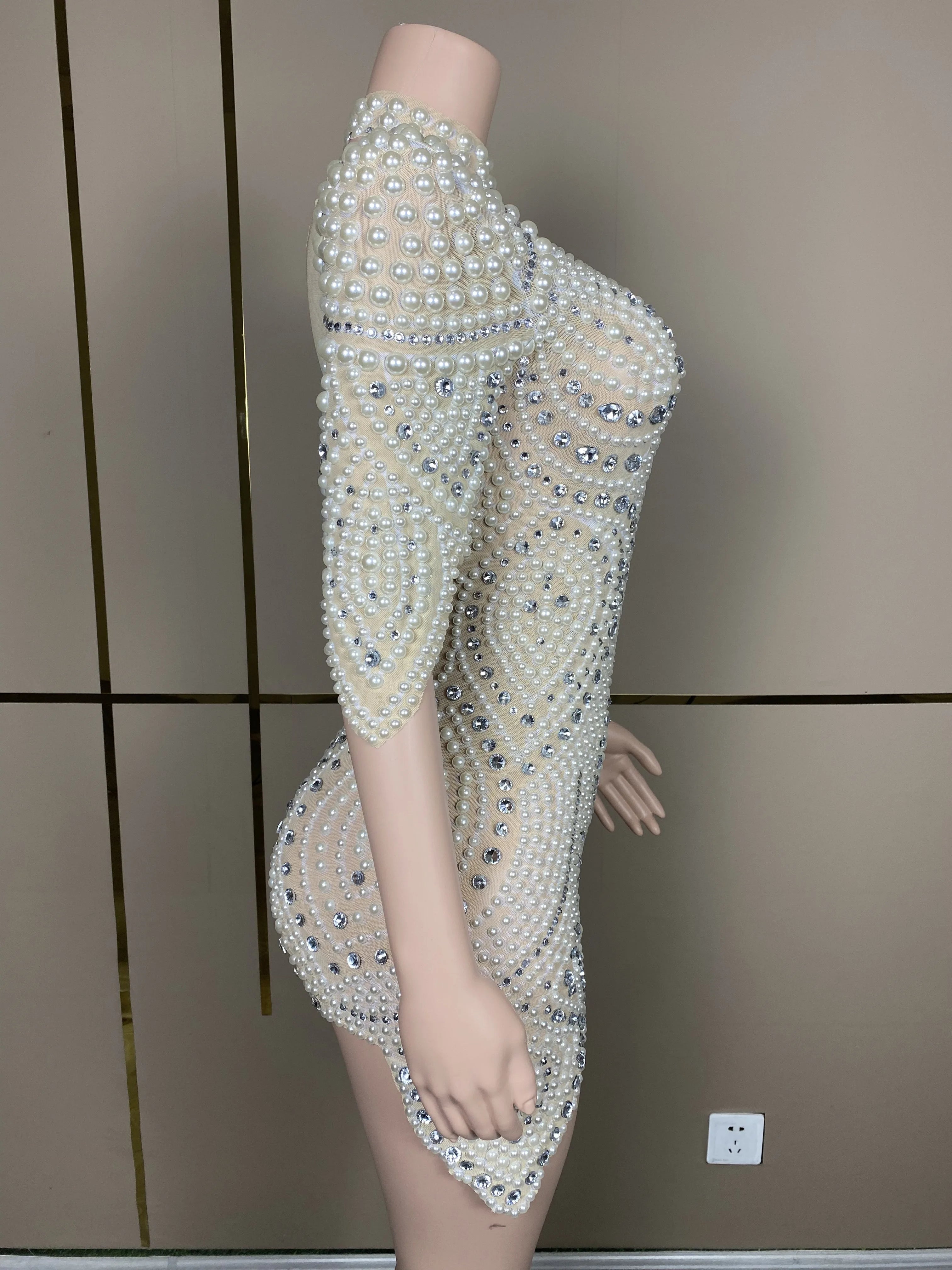 This shining silver dress with rhinestones, pearls, and long sleeves is the perfect outfit for celebrating a birthday or attending a prom party. The sexy and stretchy design makes it an ideal costume for a special occasion, ensuring you stand out and feel confident throughout the event.